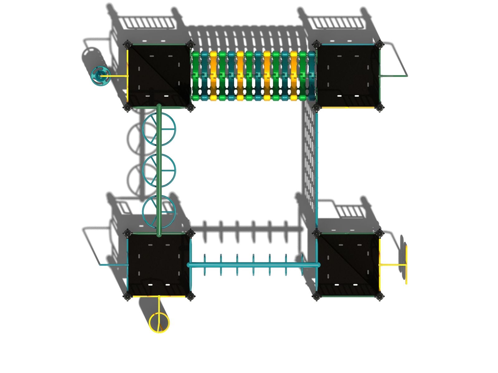 Speeltoestel met 4 platformen in een vierkant opgesteld met uitgebreide speelfuncties.