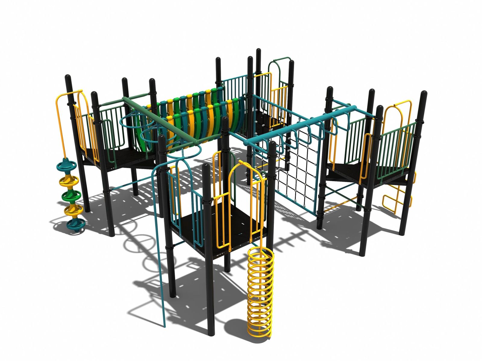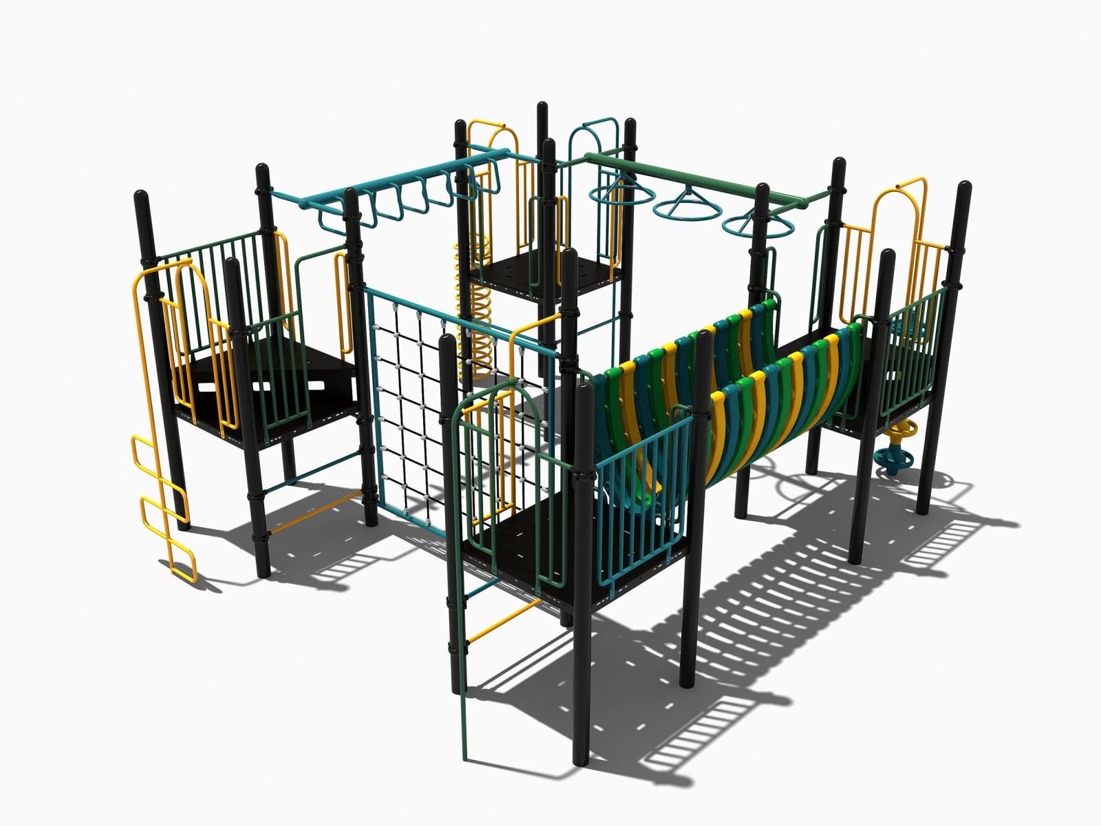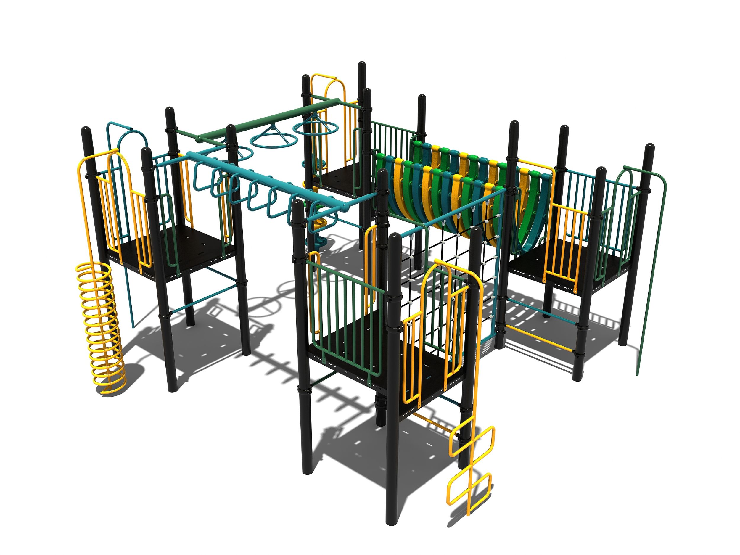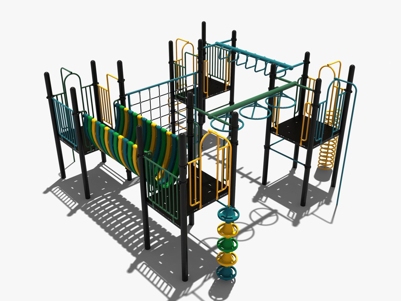 De 4 platformen van dit speeltoestel vormen de basis en zijn allemaal met elkaar verbonden door verschillende speelelementen. Er zijn meerdere manieren om op een van de vier platformen te komen maar omdat een normale trap ontbreekt, wordt het wel klimmen geblazen. Dit kan via pionnen, een klimrek, wikkelspiraal, slangentrap of een opgang met spijlen. De platformen zijn met elkaar verbonden door een verticale wand van staaltouw, een halfopen balanceerbrug, een ringladder en een wielladder. Voor de hangelementen heb je wel spierkracht en behendigheid nodig om de andere kant te bereiken. Het klimtoestel is zeer geschikt voor de wat oudere kinderen en past goed op het schoolplein bij de hogere groepen van de basisschool.
