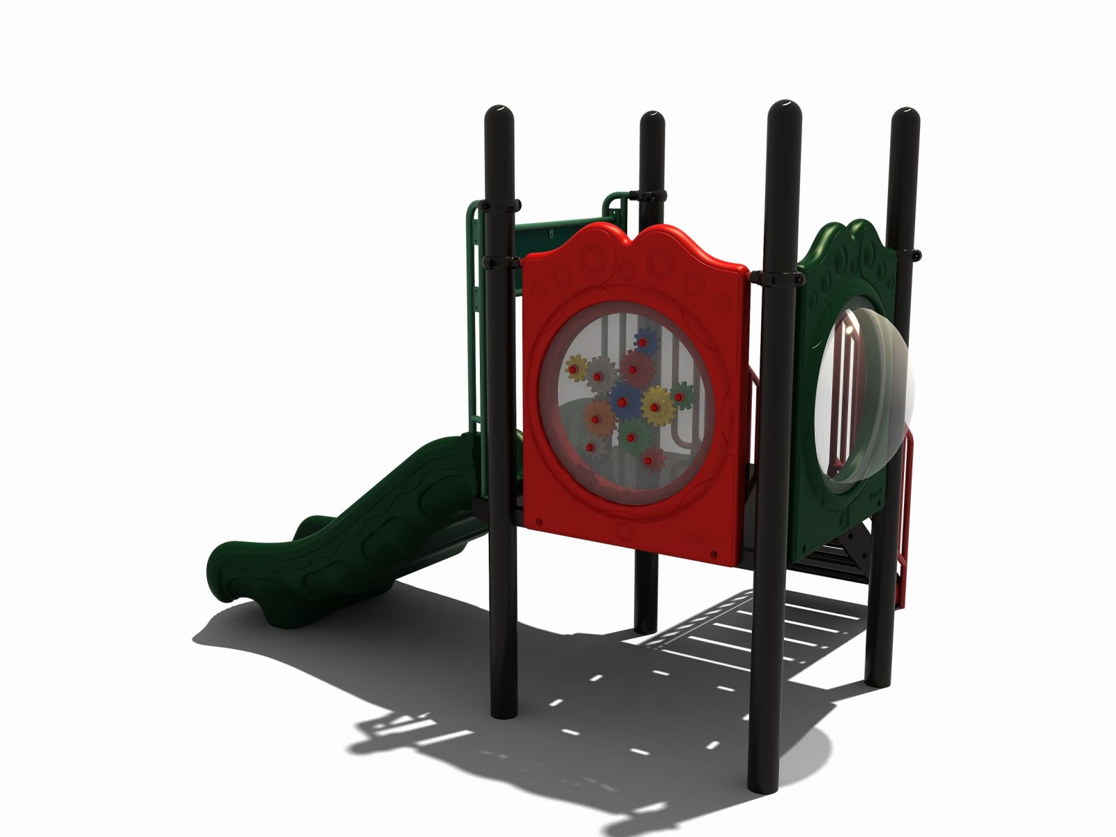Het speeltoestel bestaat uit een laag platform dat toegankelijk is met een robuuste trap met veilige trapleuning. Aan het platform zijn een drietal spelpanelen gemaakt, die naast dat ze dienstdoen als bescherming om niet van het platform af te vallen, ook extra speelelementen opleveren. Ben je boven uitgespeeld dan glij je via de dubbele glijbaan weer naar beneden.