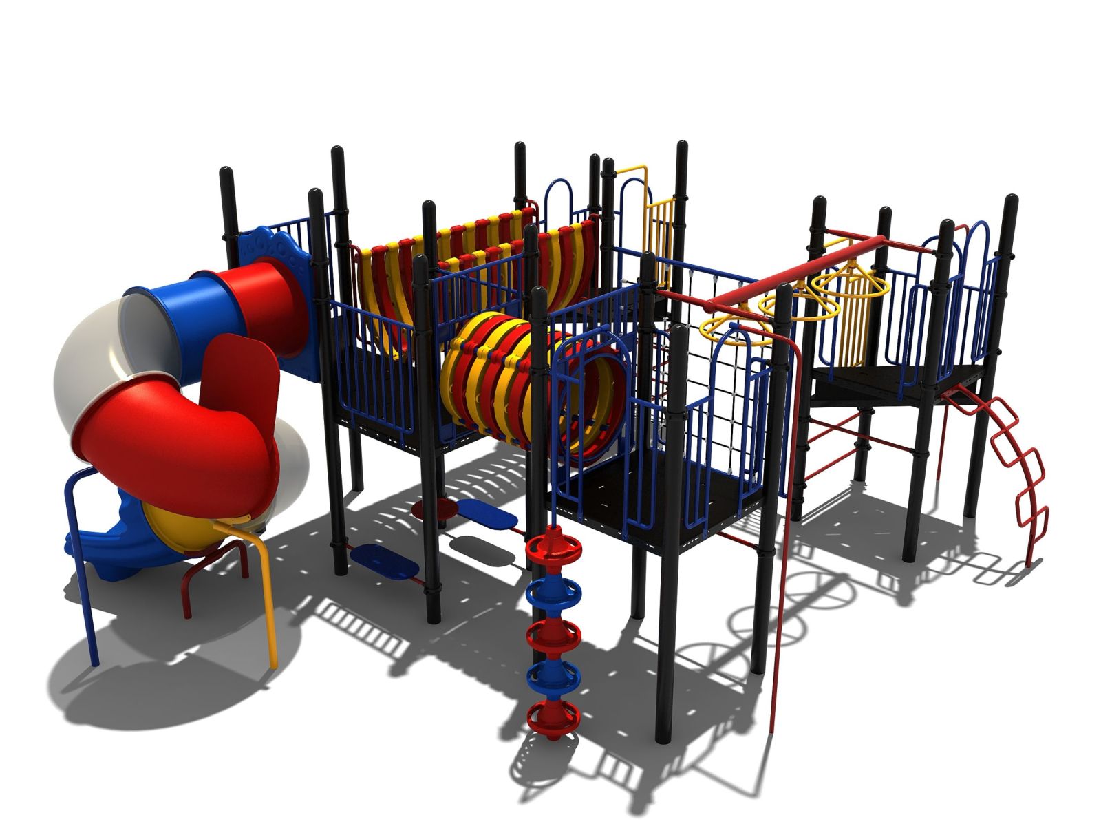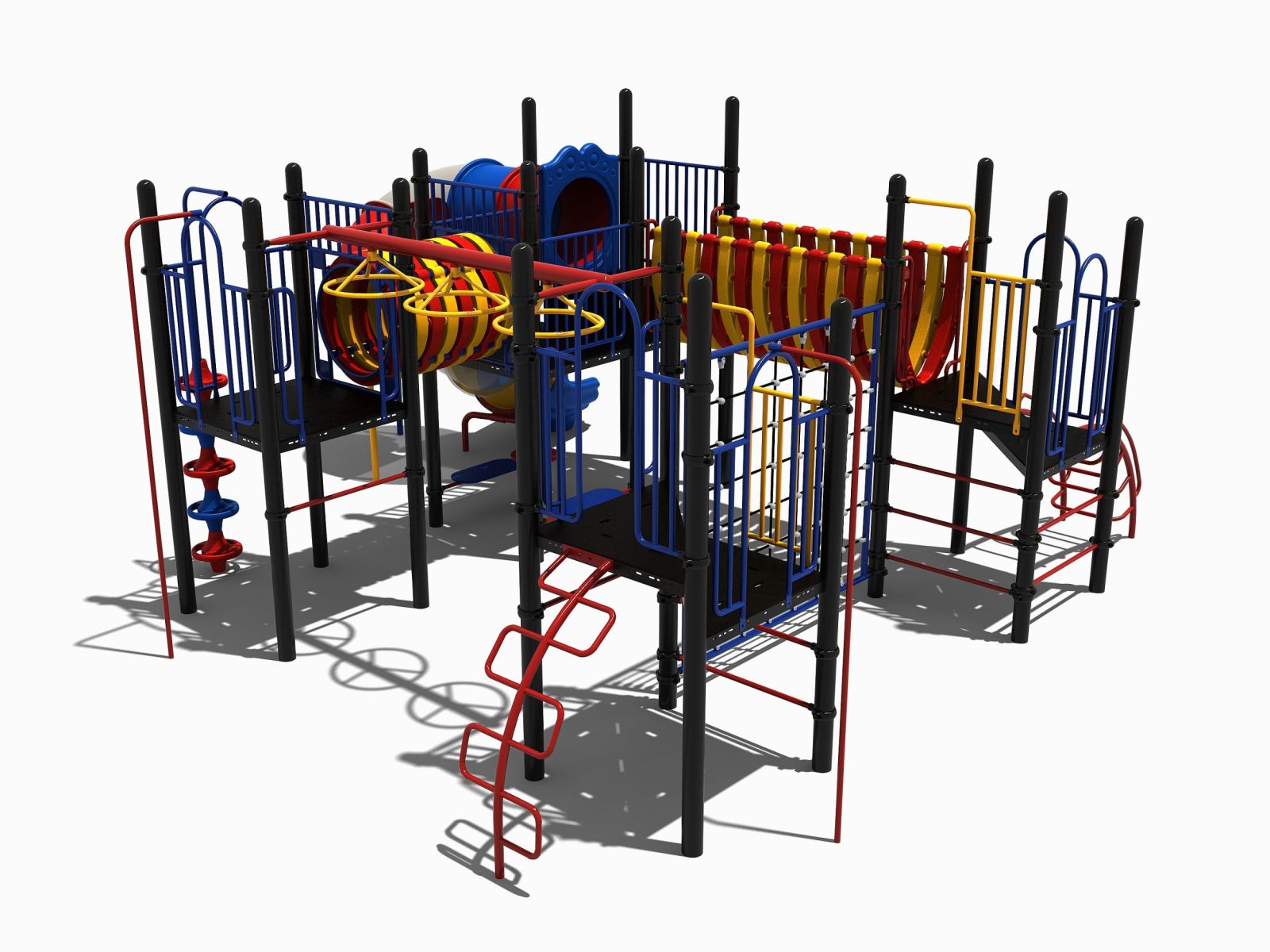 Het speeltoestel is opgebouwd uit vier platformen, twee vierkante en twee zandlopervormige plateaus (opgebouwd uit twee driehoekige vloeren). Aan alle platformen zijn opgangen gemaakt om naar boven en beneden te gaan. Je vindt onder andere een opgang met pionnen, een gebogen ladder, een gebogen slangentrap en verschillende klimrekken met horizontale spijlen. Aan twee platformen is een glijstang bevestigd en aan een derde platform vind je een grote tunnelglijbaan. Alle platformen zijn weer met elkaar verbonden door verschillende speelelementen zoals de dichte kruiptunnel, een halfopen balanceerbrug, een verticaal klimnet en de wielladder. Je kunt dus een compleet rondje maken zonder dat de voeten de vloer hoeven te raken.