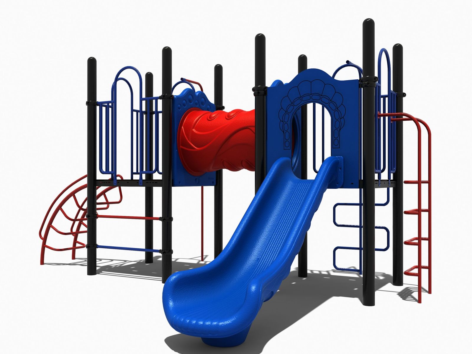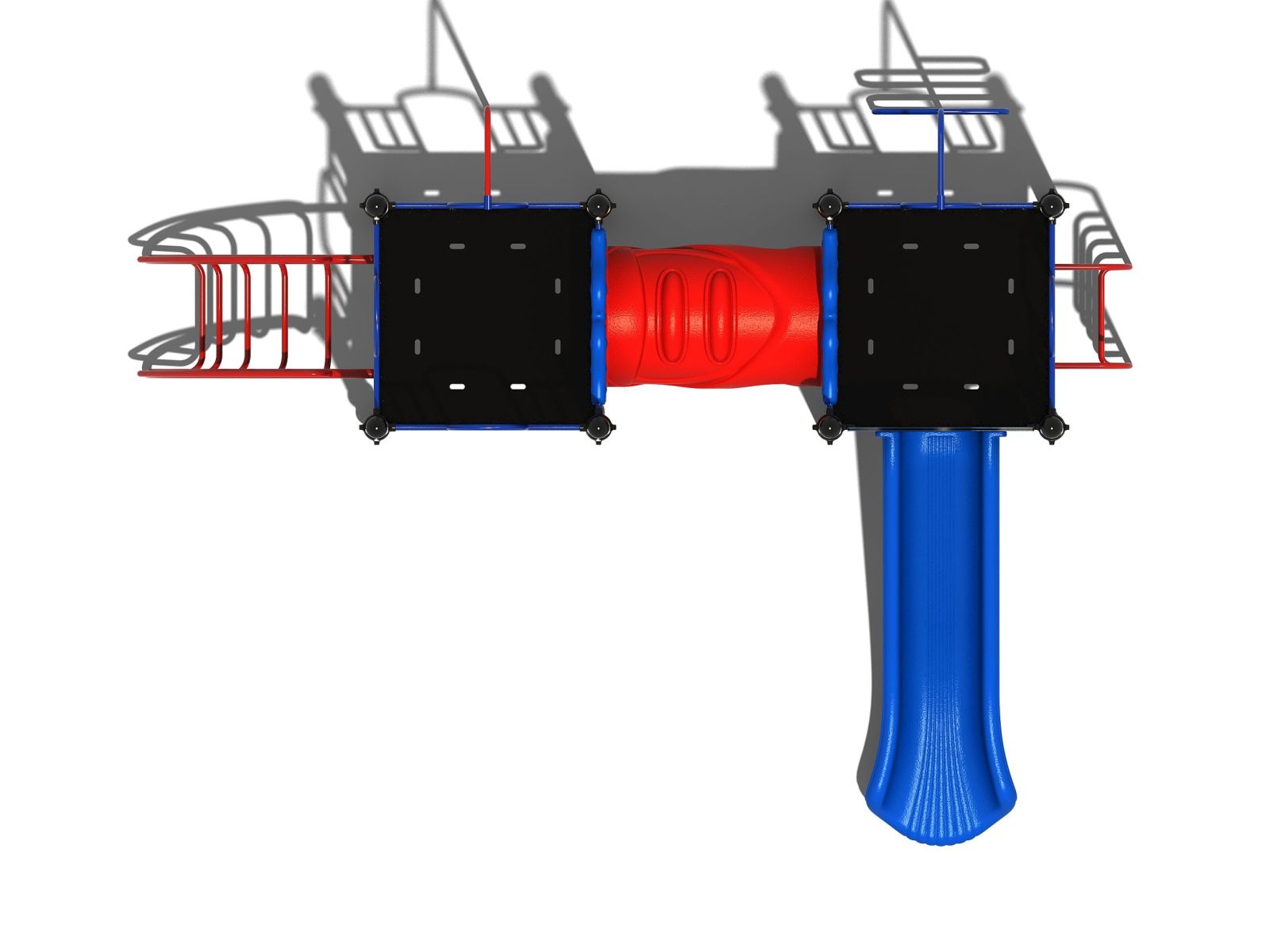 De basis van dit gecertificeerde speeltoestel zijn de twee platformen van 90 cm hoog die met elkaar verbonden worden door een opvallende kruiptunnel. Het driehoekige platform beklim je via de opgang met de kleurrijke doppen. Je moet dan wel via de kruipbuis om naar het andere vierkante platform te komen. De vloer met de kunststof glijbaan kun je ook bereiken met het gebogen klimrek. Door de beperkte hoogte is dit speeltoestel ook in het zand te plaatsen.