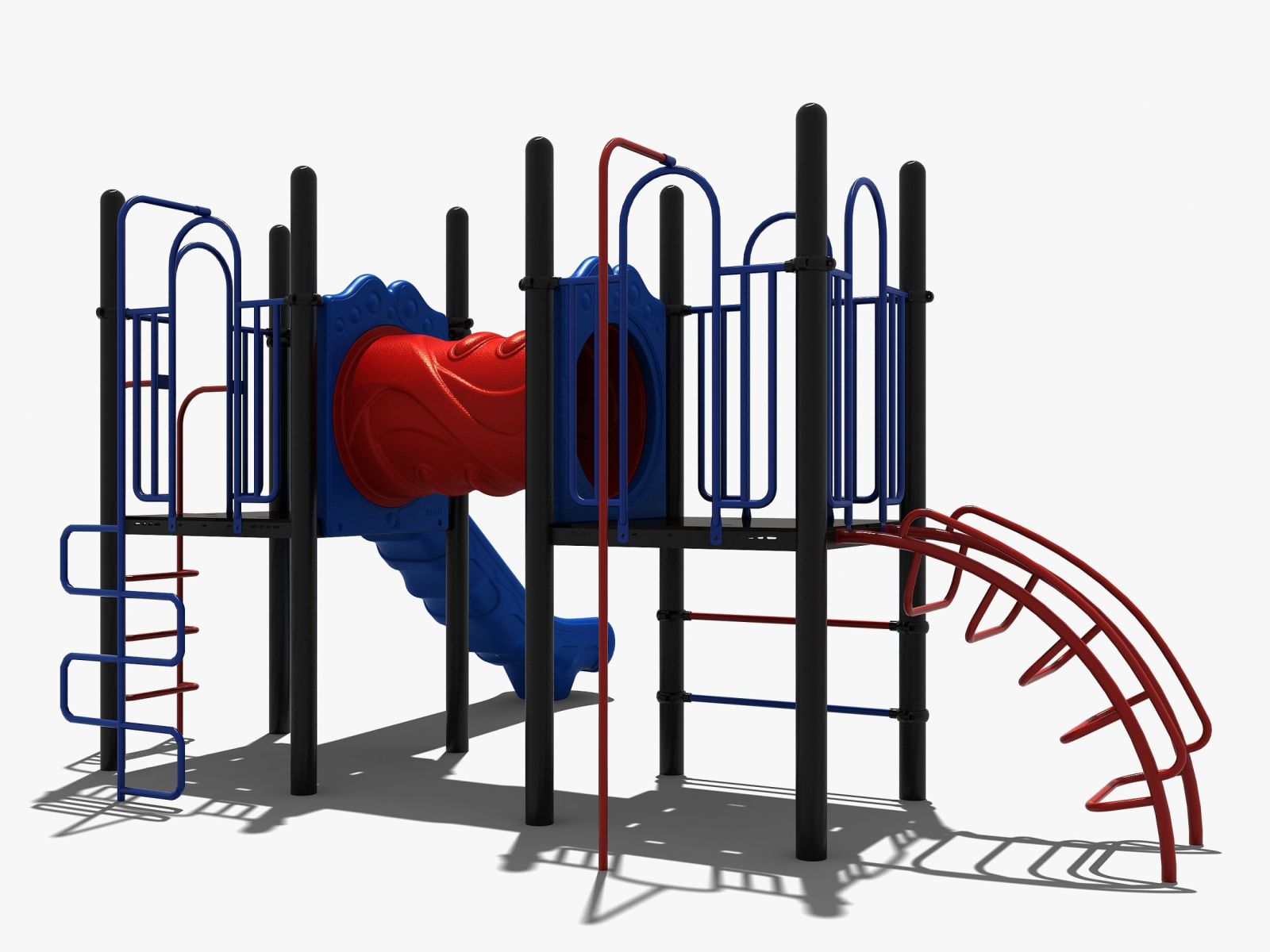 Dit combinatietoestel behoort tot de metaal en kunststof serie en is een eigen ontwerp van de klant. Hij heeft hierbij gebruik gemaakt van de TnT 3D-ontwerperDi, ons online tekenprogramma waarin iedereen een speeltoestel kan tekenen of een bestaand toestel kan aanpassen. Dit kan bijvoorbeeld door het speeltoestel uit te breiden met platformen, speelfuncties en andere opgangen naar de platformen. Dit kan ook door de kleuren van het speeltoestel te veranderen. Alleen de staanders en platformen worden standaard in zwart geleverd, voor de overige speelelementen kies je uit diverse kleuren. Op deze manier ontwerp je je eigen speeltoestel op maat.