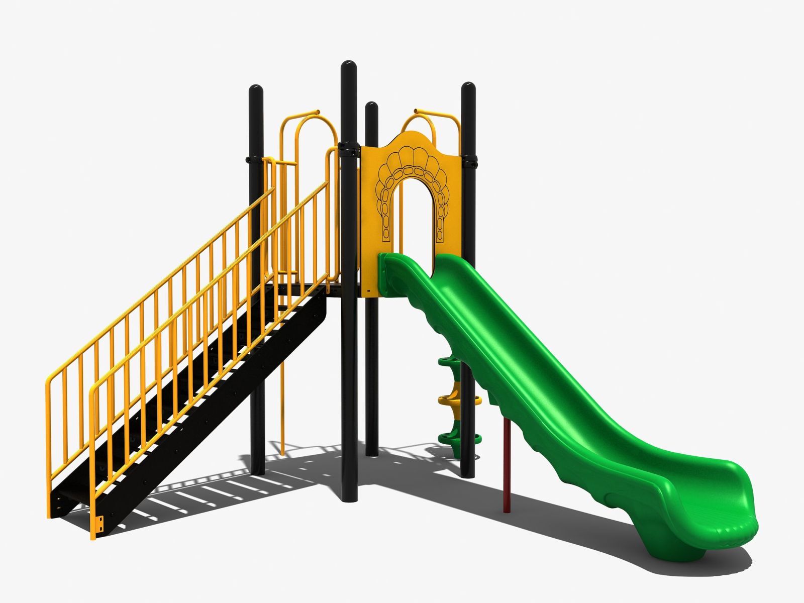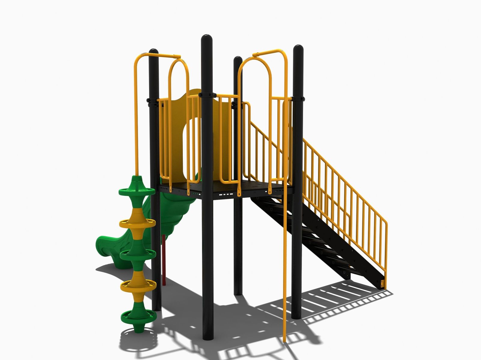 De kleintjes kunnen via de stevige metalen trap naar boven klimmen en via de lange kunststof glijbaan van maar liefst 150 cm weer naar beneden glijden. De oudere kinderen gaan natuurlijk niet via de vaste trap maar kiezen de opgang met de pionnen om boven te komen. Daarna glijden ze via de brandweerstang weer naar beneden.