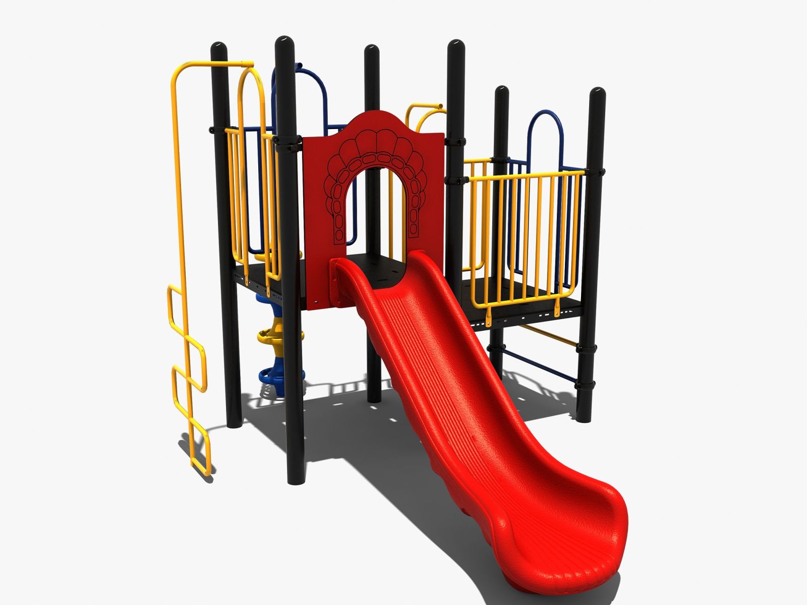 Dit speeltoestel bestaat uit twee platformen op verschillende hoogteniveaus. Je kunt direct naar een van de beide platformen klimmen, alleen is er geen stevige standaard trap naar boven. Het lage platform beklim je via de opgang met de stangen. Je kunt hier direct naar beneden glijden via de brandweerstang maar ook voor het andere platform kiezen om hier met de grote kunststof glijbaan naar beneden te roetsjen. Het hogere platform is overigens ook te beklimmen met de slangenopgang of de kunststof doppen. Je kunt met dit combinatietoestel dus alle kanten op.