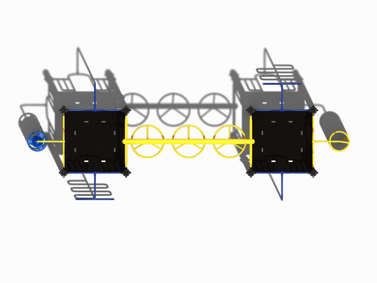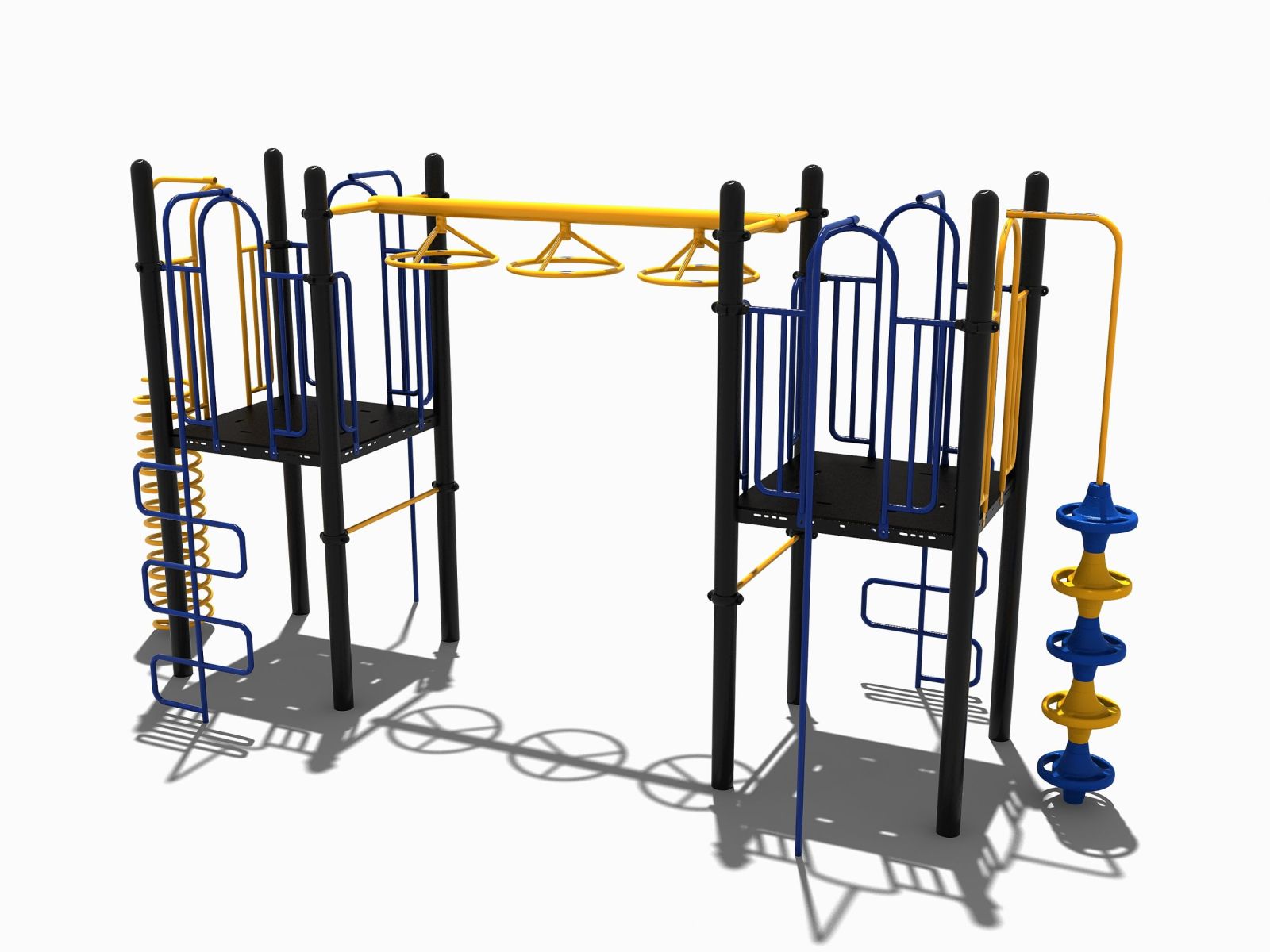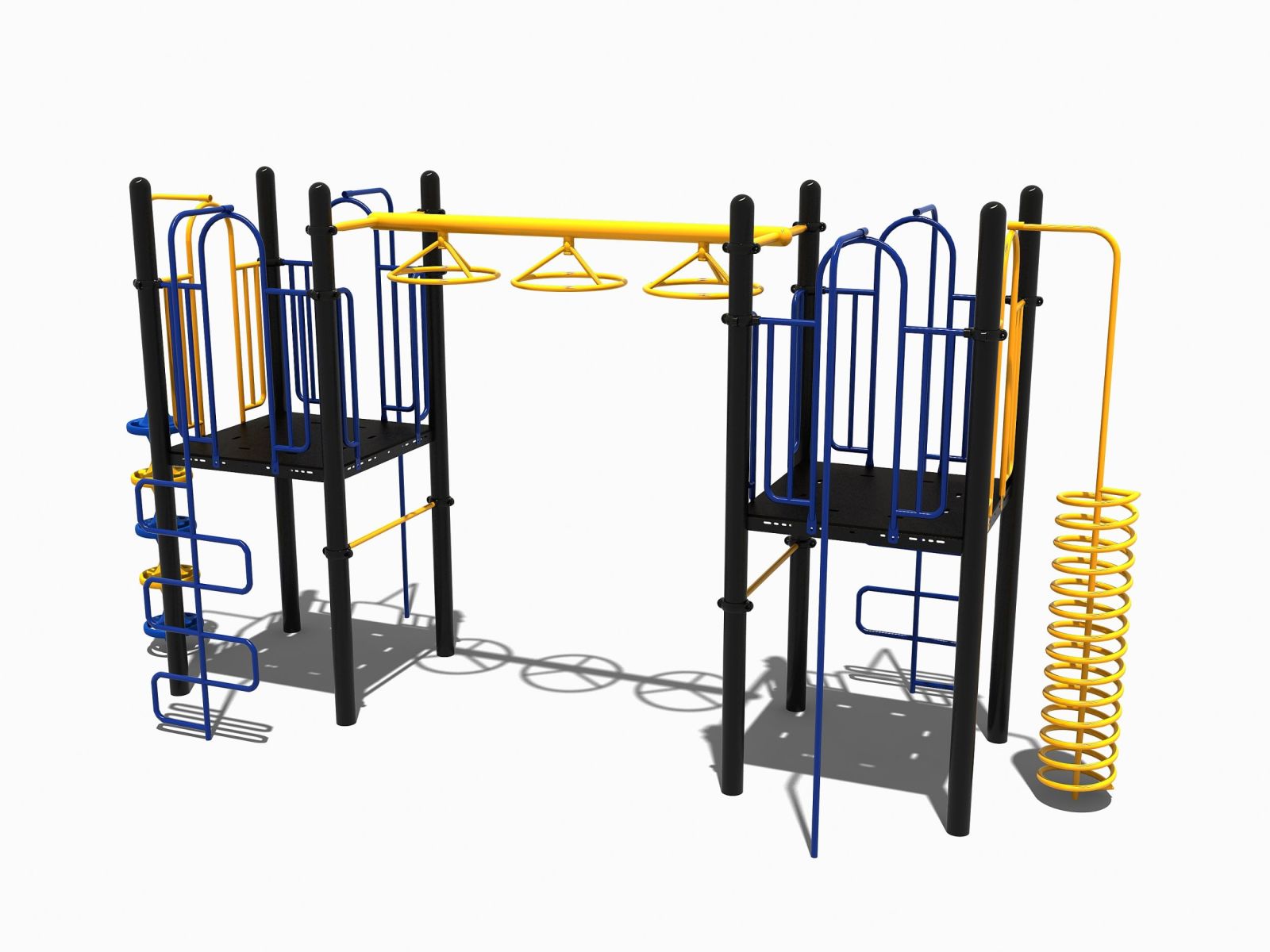 Dit speeltoestel bestaat uit 2 platformen dat met elkaar verbonden wordt door een wielladder. Dus wil je van de ene naar de andere kant dan moet je wel een echte krachtpatser zijn. Bovendien moet je van een kleine uitdaging houden om op een van de platformen te komen want een vaste trap naar boven is er niet. Dus kies je voor de opgang met de spiraal of een van de twee opgangen met de slangenladders. En ook de weg naar beneden gaat niet via een normale glijbaan. Dus neem je de brandweerstang of de spiraal naar beneden. Dit professionele speeltoestel is bij uitstek geschikt voor de oudere jeugd die wel van een kleine uitdaging houdt.