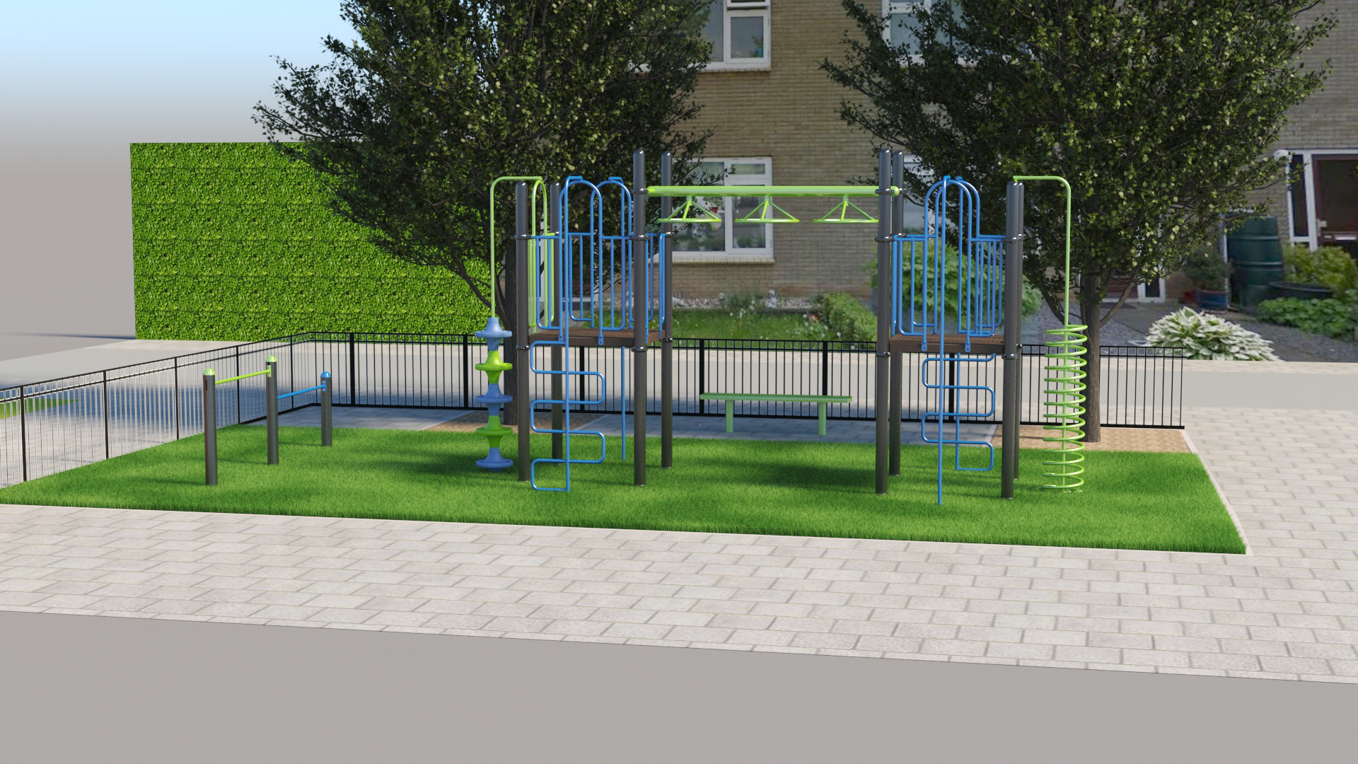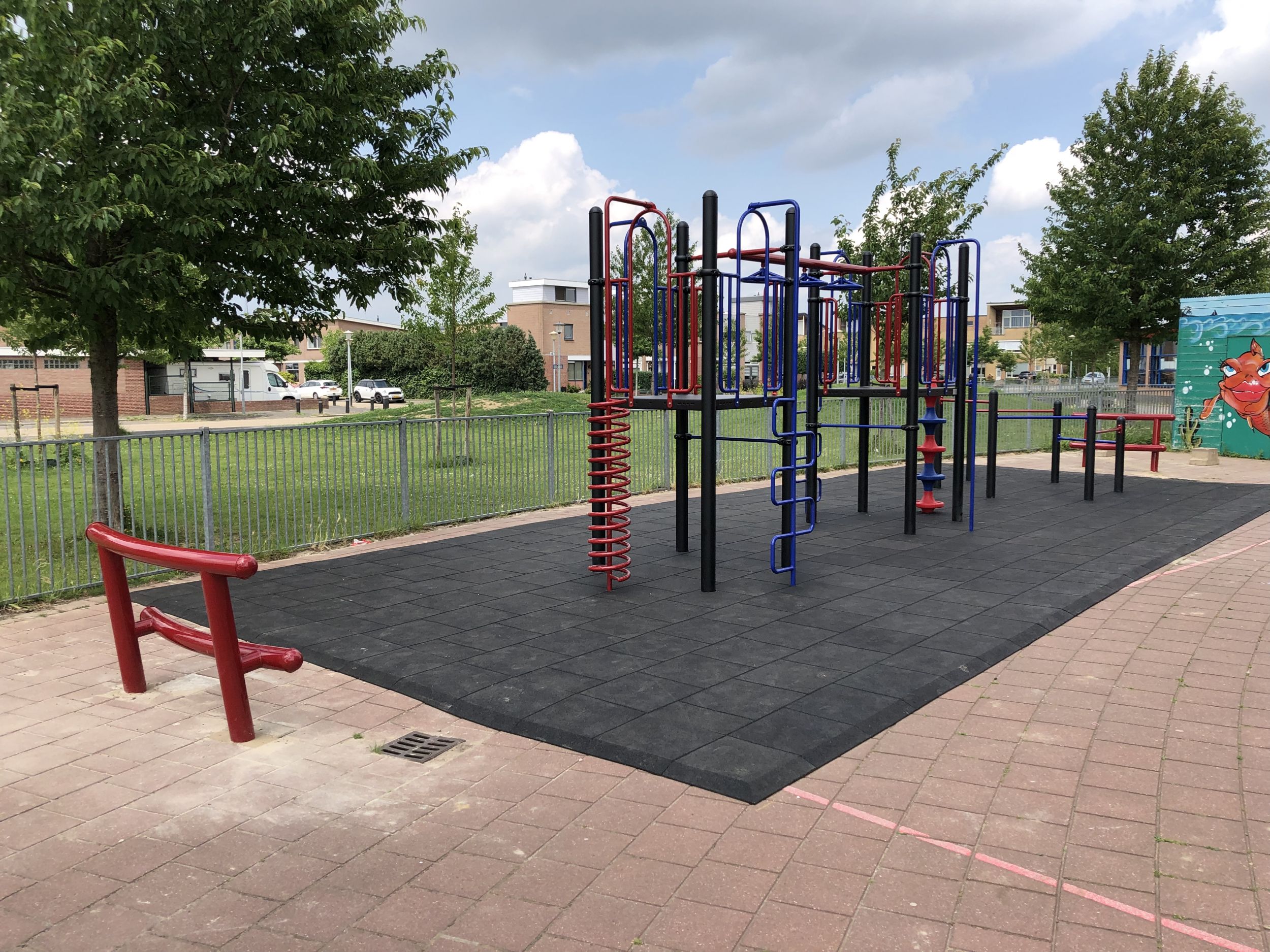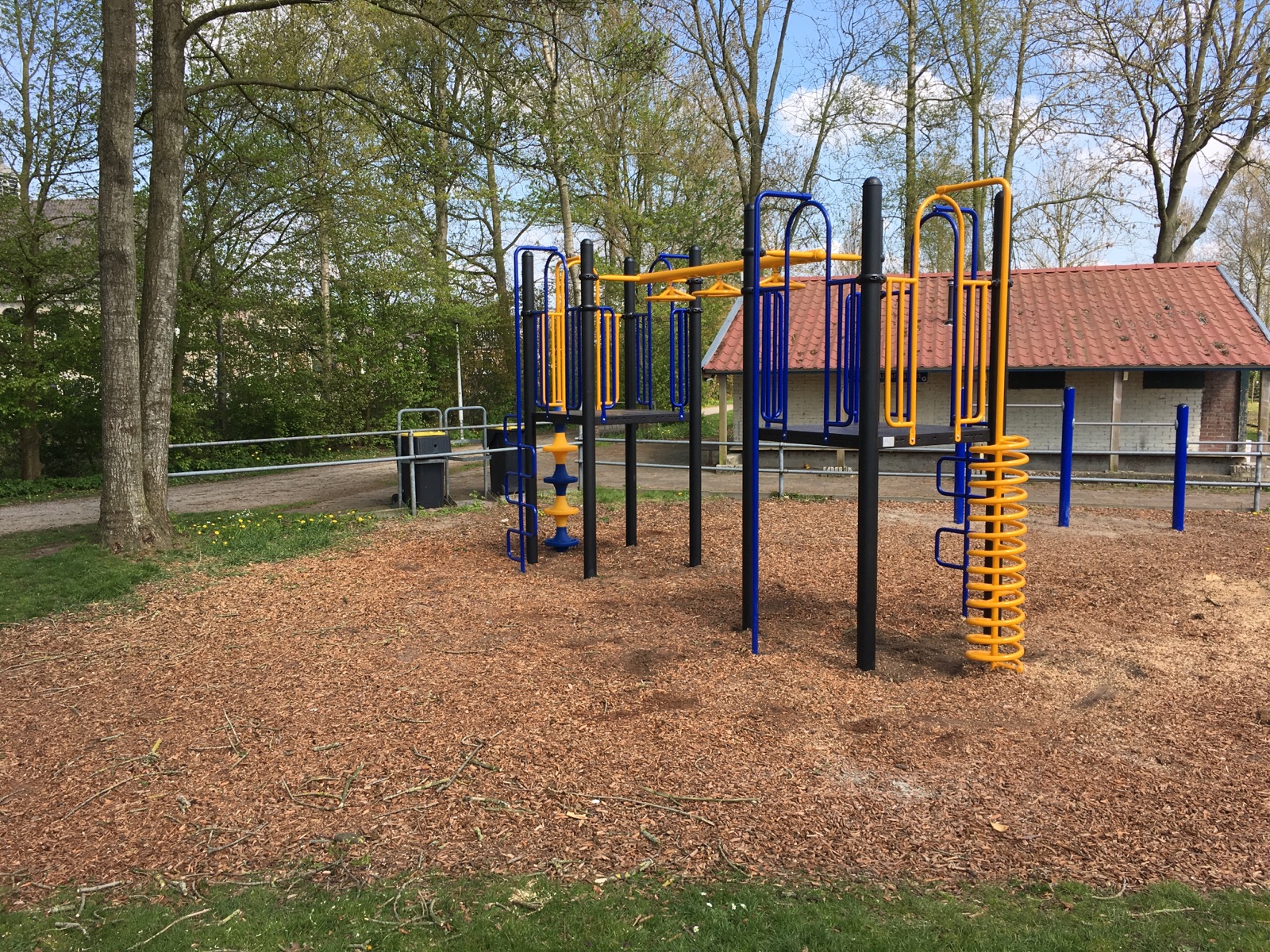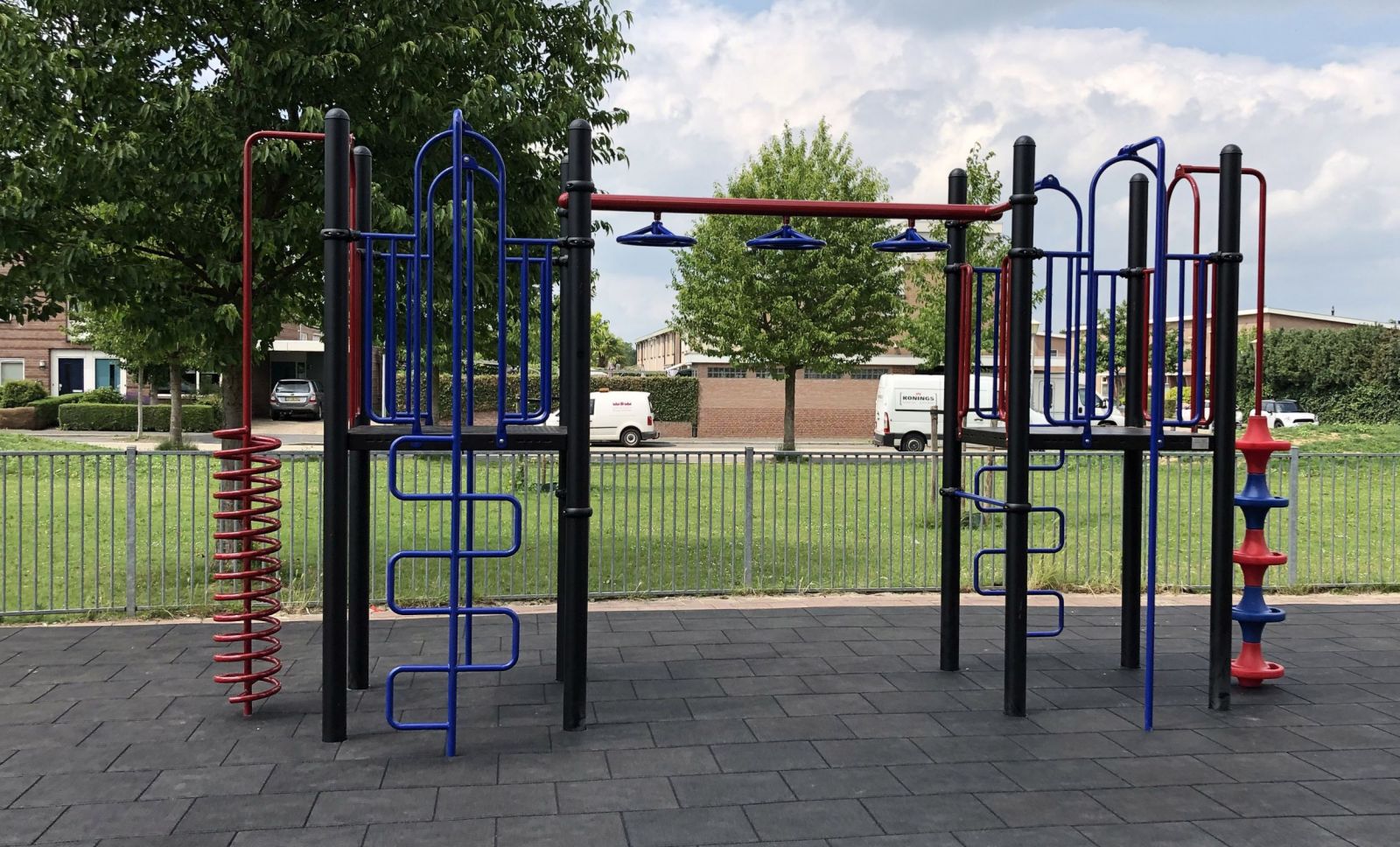 Robuust metalen speeltoestel met kunststof speelelementen