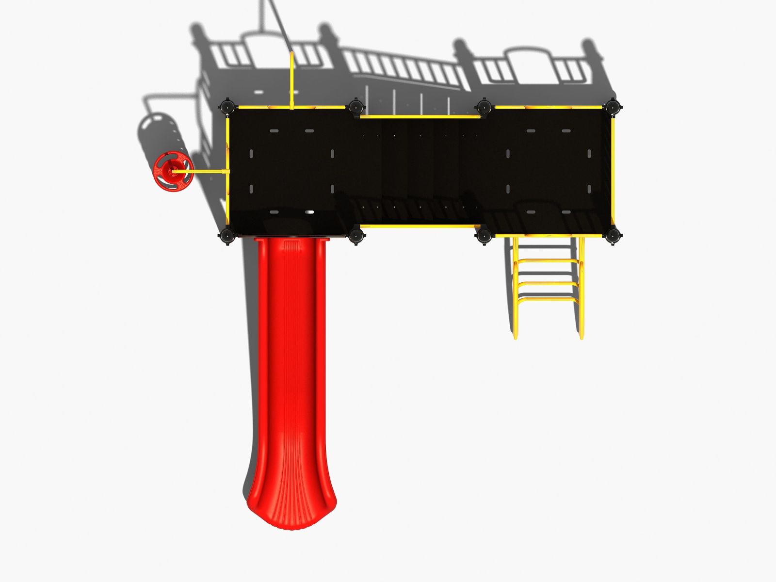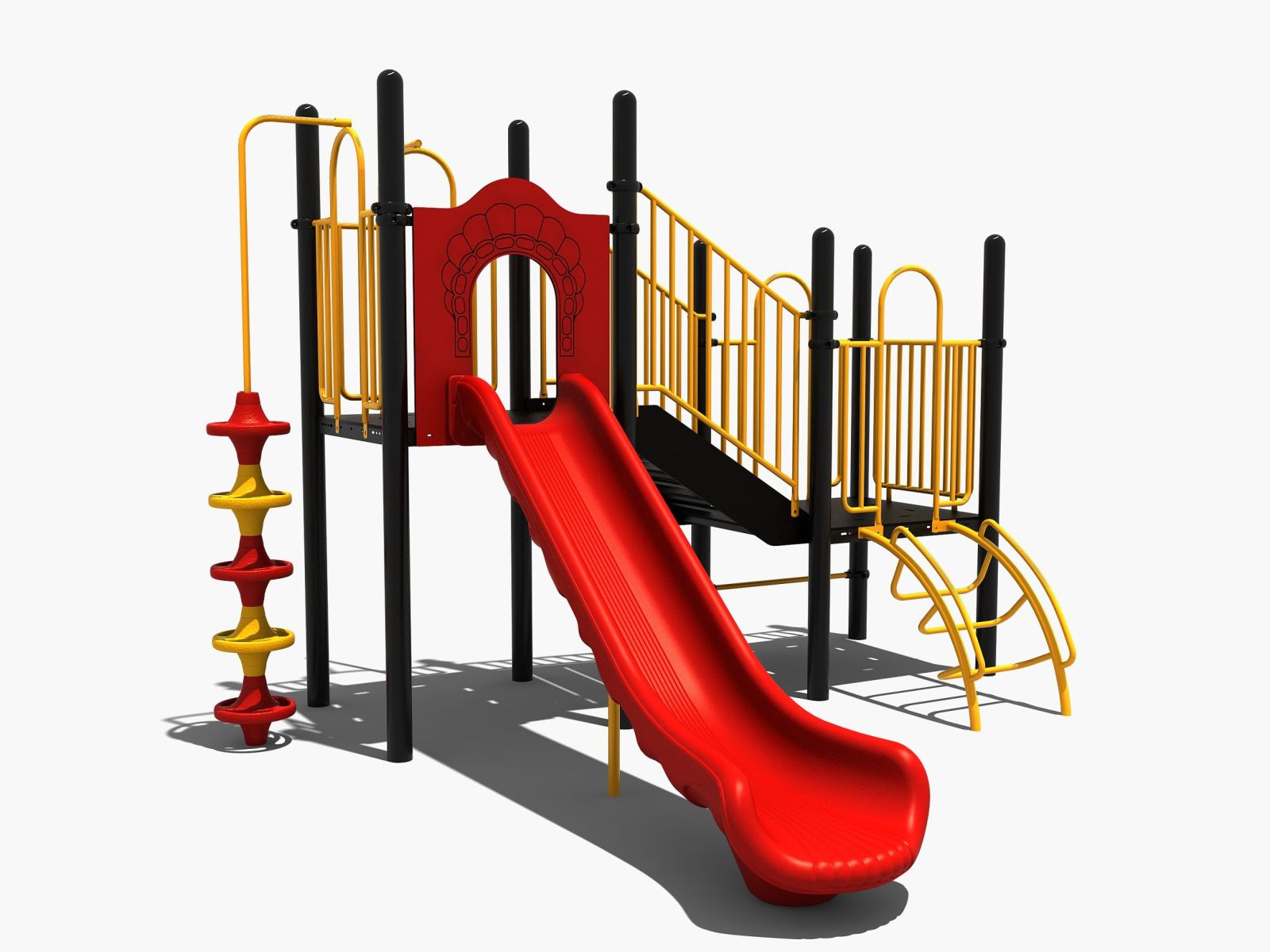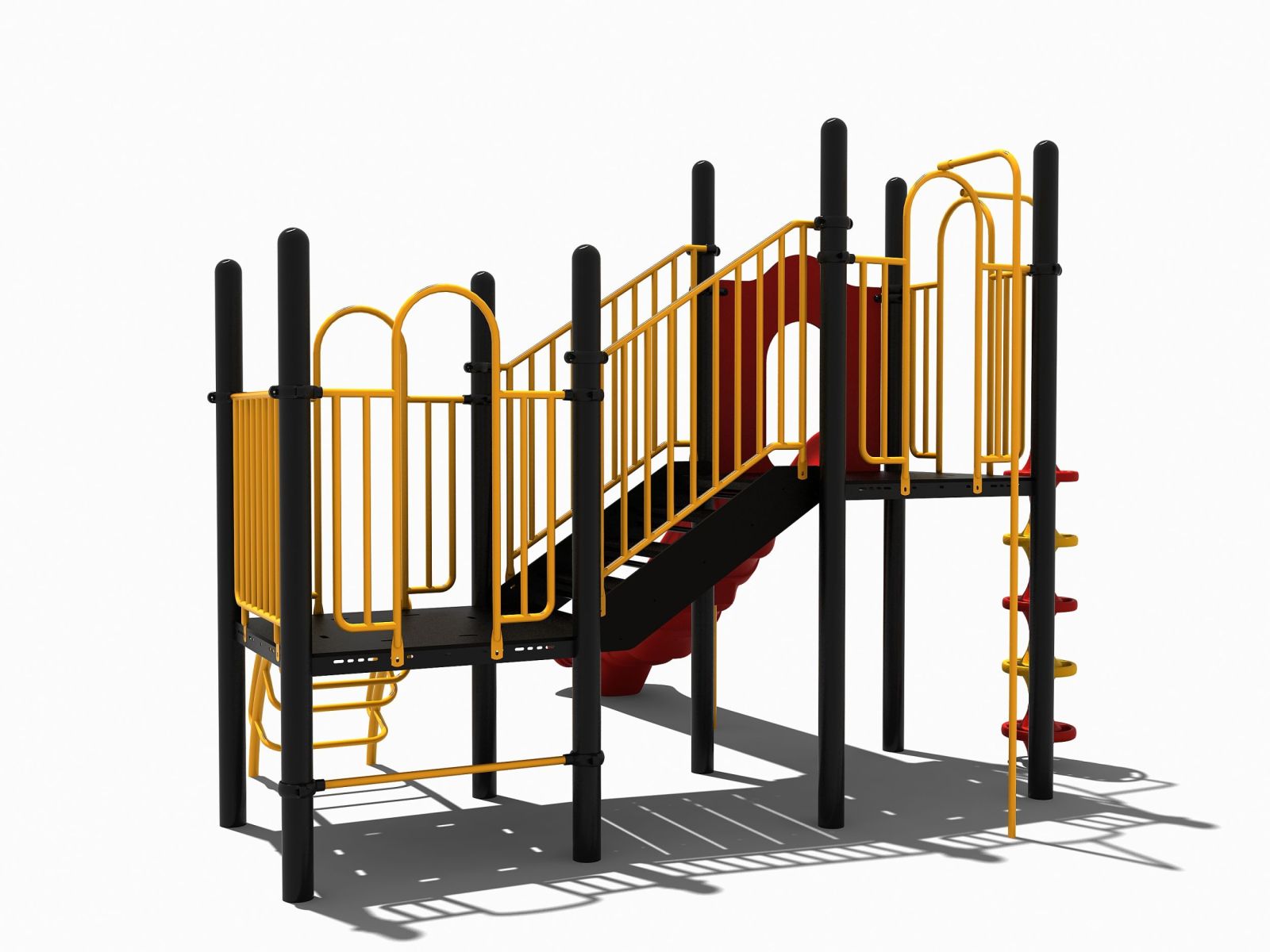 Het speeltoestel bestaat uit twee platformen op verschillende hoogteniveaus die met elkaar verbonden wordt door een schuin oplopende vloer. Door aan alle zijden gebruik te maken van spijlwanden hebben ook de jongere kinderen altijd een beschermd gevoel als ze op dit combinatietoestel willen spelen. Bovendien zijn alle zwarte vloeren gemaakt van staalbord met een rubber gecoate anti-slip afwerking om uitglijden te voorkomen. Het lage platform kun je opklimmen door een gebogen klimrek of het steile rek aan de andere zijde. Het hoge platform beklim je door de opgang met de doppen en via de glijbaan ben je zo weer beneden.