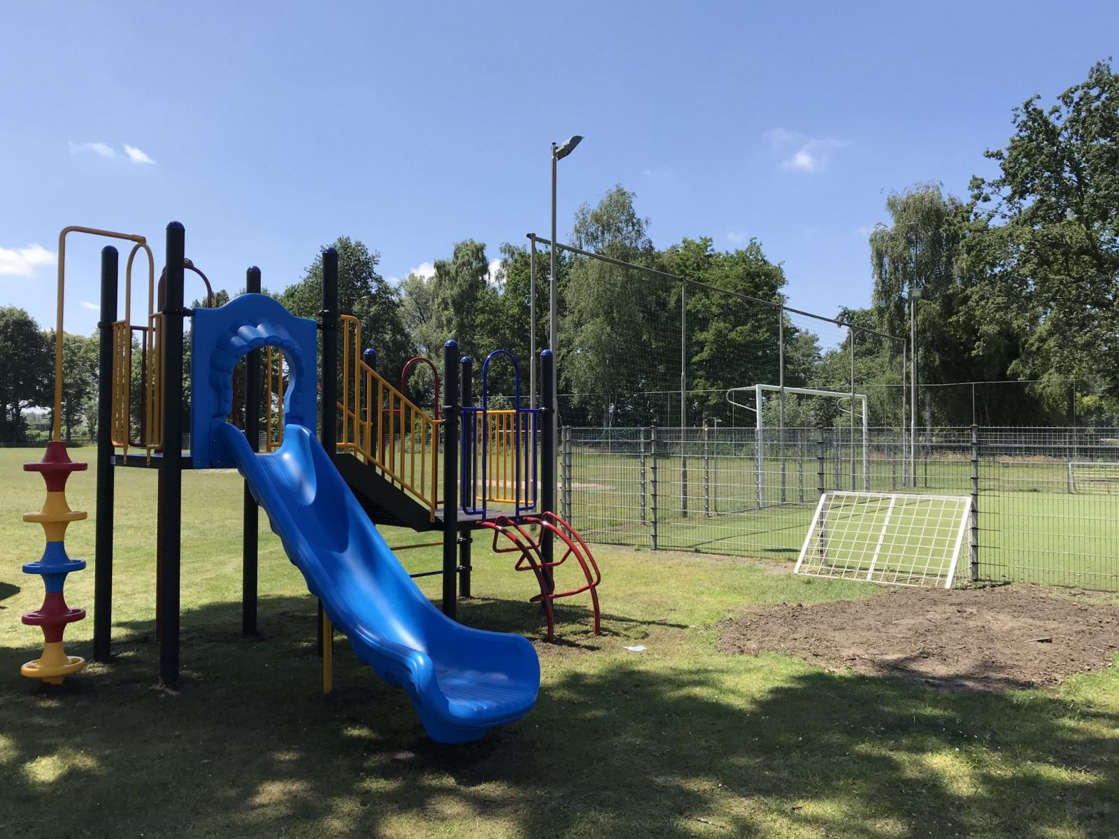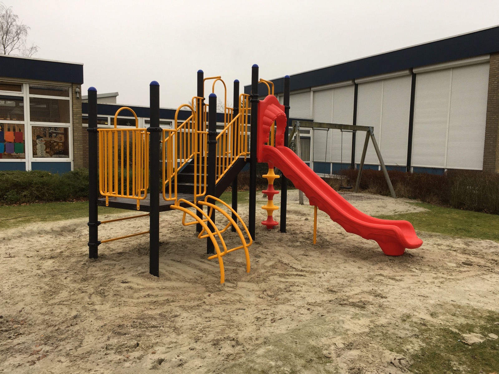 Als je op zoek bent naar een speeltoestel dat ook geschikt is voor de jongere doelgroep, dan is dit combinatietoestel met opvallende grote kunststof glijbaan een goed voorbeeld.