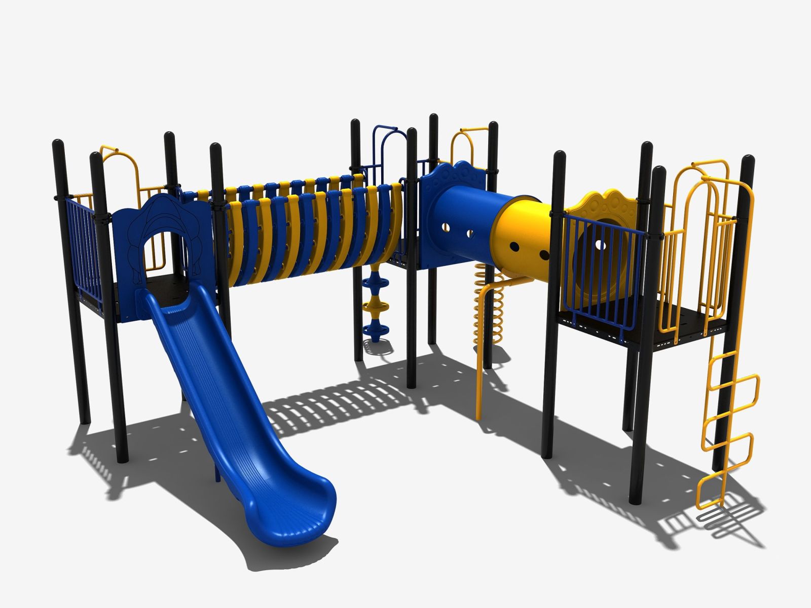 Dit klimtoestel heeft drie platformen die in een hoekmodel zijn opgesteld. De drie vloeren zijn met elkaar verbonden door een kruiptunnel en een halfdichte balanceertunnel. Bij twee platformen zijn opgangen geplaatst om naar boven te klimmen. Aan het ene platform is een slangenladder, als je voor deze kiest moet je via de kruiptunnel naar de andere vloer. Het tweede platform beklim je via de opgang met de doppen of de spiraalwikkel. Aan het derde platform zit een ruime kunststof glijbaan maar je kunt ook voor de glijstang kiezen om naar beneden af te zakken.