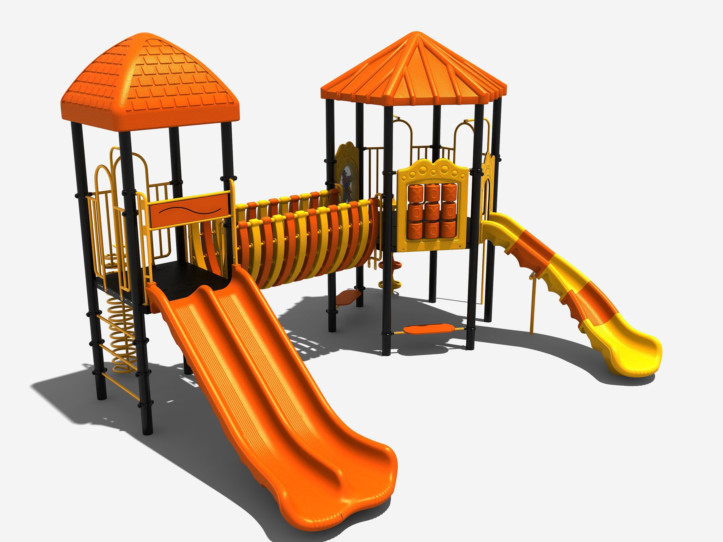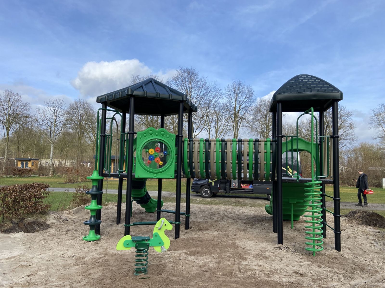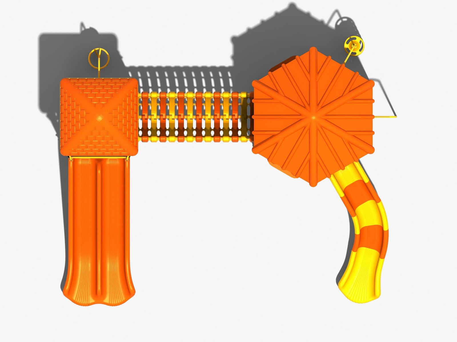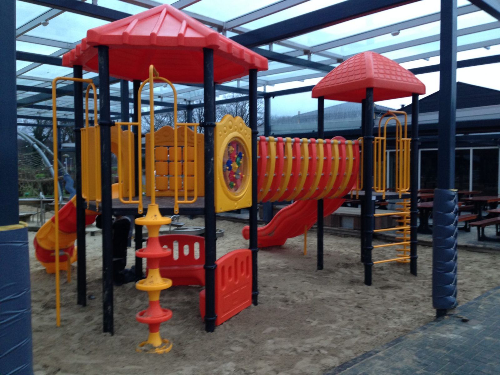 Maar dit combinatietoestel biedt veel meer dan alleen maar glijden. Het speeltoestel bestaat uit twee platformen die met elkaar verbonden zijn door een opvallende half open kunststof verbindingstunnel om doorheen te lopen of de kruipen. Het vierkant platform met de dubbele glijbaan beklim je door de spiraalopgang of het verticale klimrek en met de dubbele glijbaan sta je binnen no-time weer met beide voeten op de grond. Het zeshoekige platform kun je via de opgang met de kunststof doppen bereiken. Het leuke van dit platform is dat er in plaats van spijlhekken, educatieve spelpanelen zijn geplaatst. Hier kun je boven dus een spelletje drie op een rij spelen of de radertjes eens flink laten draaien. Wil je weer naar beneden dan glij je met een bochtje naar beneden. Onderaan dit platform is ook nog een mogelijkheid gemaakt om te gaan zitten. Plaats je dit speeltoestel in het zand dan heb je een lekker bankje om nog even in de zandbak te spelen. De kunststof dakjes boven de platformen beschermen je tegen de felle zon of een regenbuitje en maken dit speeltoestel helemaal af.