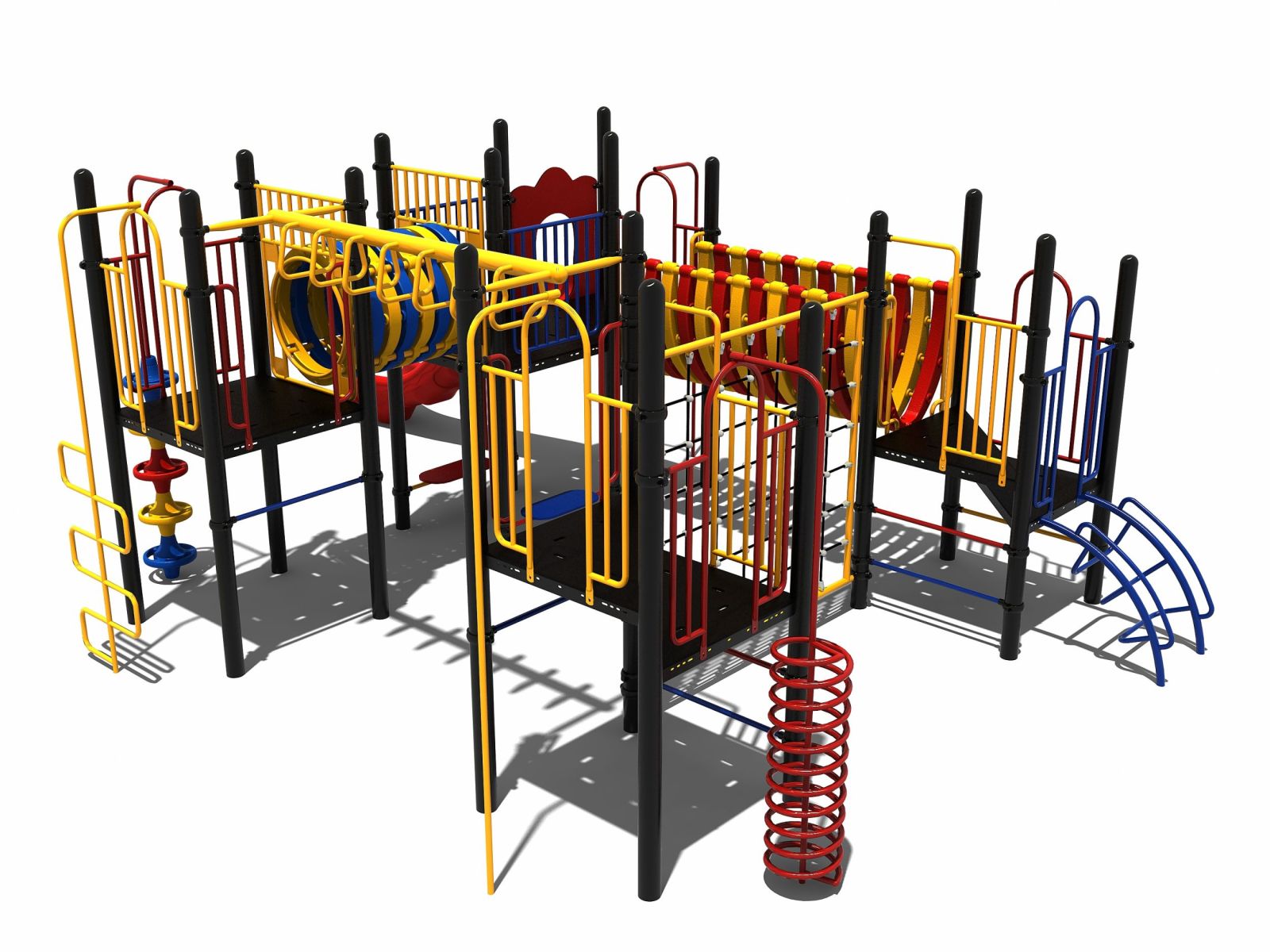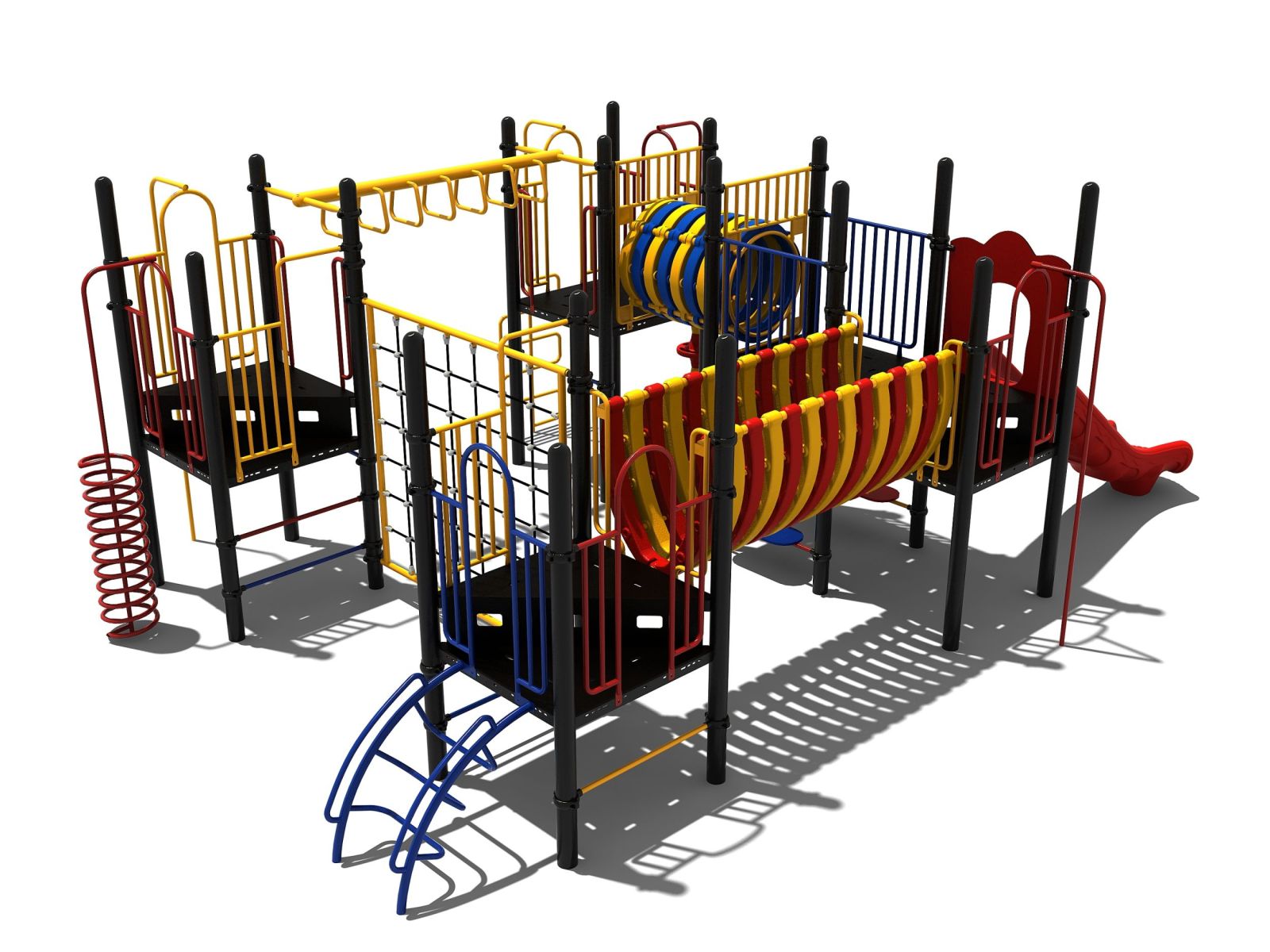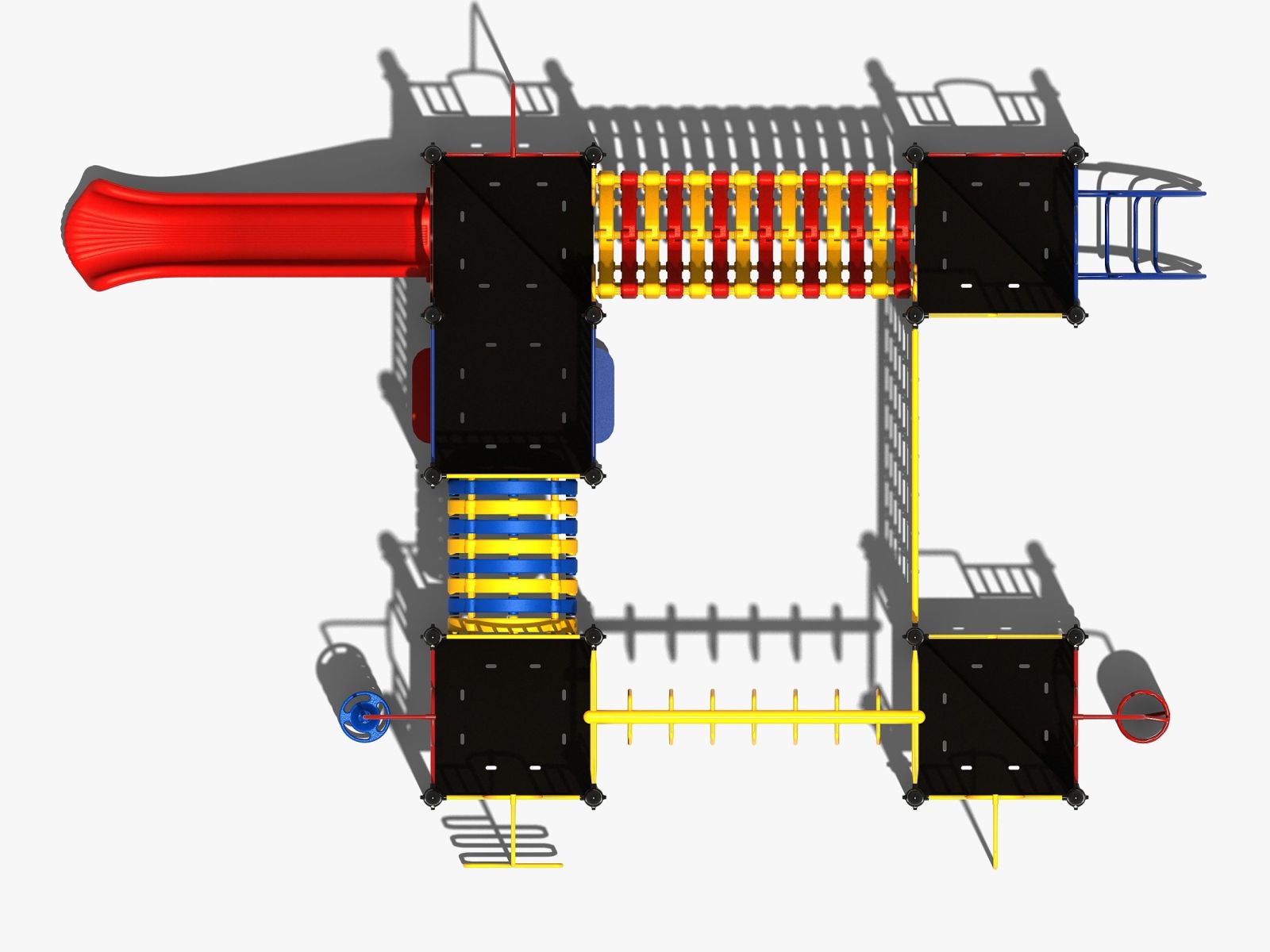 Een mooie bijkomstigheid van dit speeltoestel uit de metaal en kunststof lijn is dat je door verschillende kleuren voor de speelelementen te kiezen een compleet eigen speeltoestel op maat kunt maken. Alleen de staanders en vloeren zijn standaard zwart, voor de rest van de onderdelen is een omvangrijk kleurenpallet voorhanden, zowel voor de kunststof als de metalen onderdelen. Wil je de speelelementen of de kleuren van dit speeltoestel wijzigen, maak dan gebruik van de TnT 3D-ontwerper.