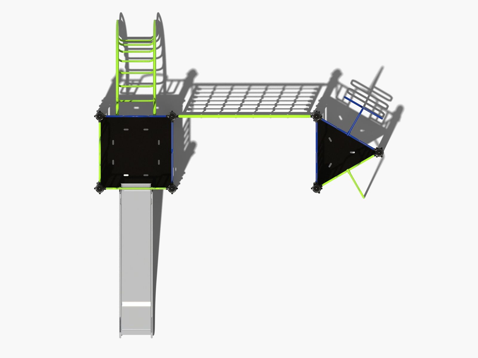 Het speeltoestel is opgebouwd uit twee platformen die met elkaar verbonden zijn door een klimnet. Aan het driehoekige platform zijn twee mogelijkheden geplaatst om naar boven te klimmen. Dit kan via de slangentrap of de horizontale spijlen aan het platform. Hier vind je ook een glijstang om als een brandweerman naar beneden te roetsjen. Het vierkante platform heeft aan beide kanten horizontale spijlen maar ook een gebogen klimrek. Aan dit ruime platform is een rvs glijbaan bevestigd. Het klimrek is voor de kinderen die wel een kleine uitdaging aan durven te gaan om van het ene naar het ander platform te komen zonder met de voeten de grond te raken. Het klimnet is gemaakt van stevig 6-draads staaltouw en kan tegen een stootje.