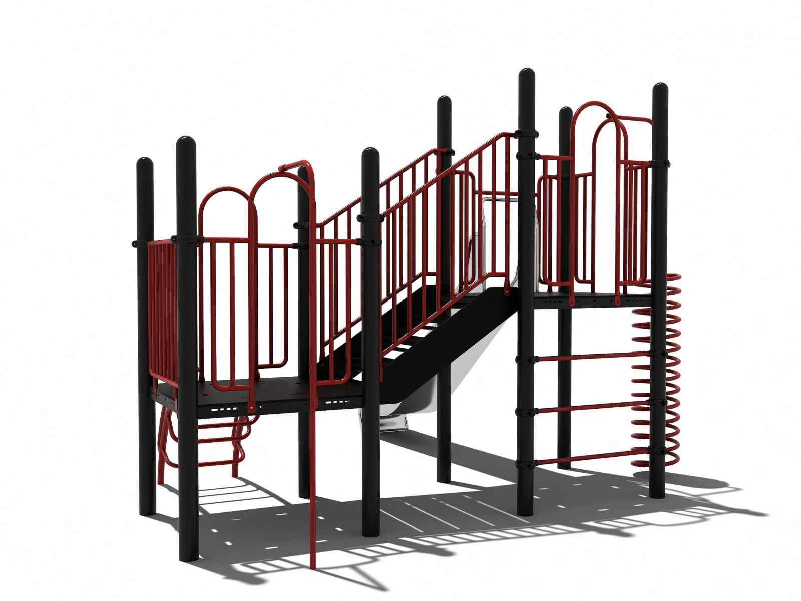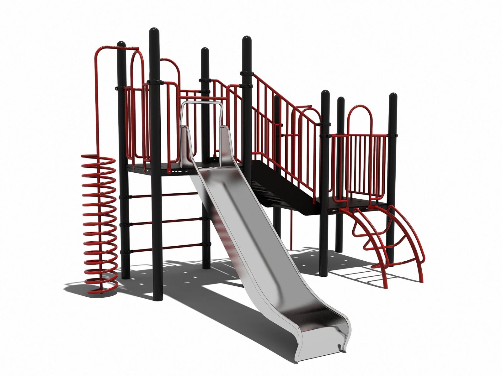Dit speeltoestel heeft platformen op verschillende hoogtes en een rvs glijbaan