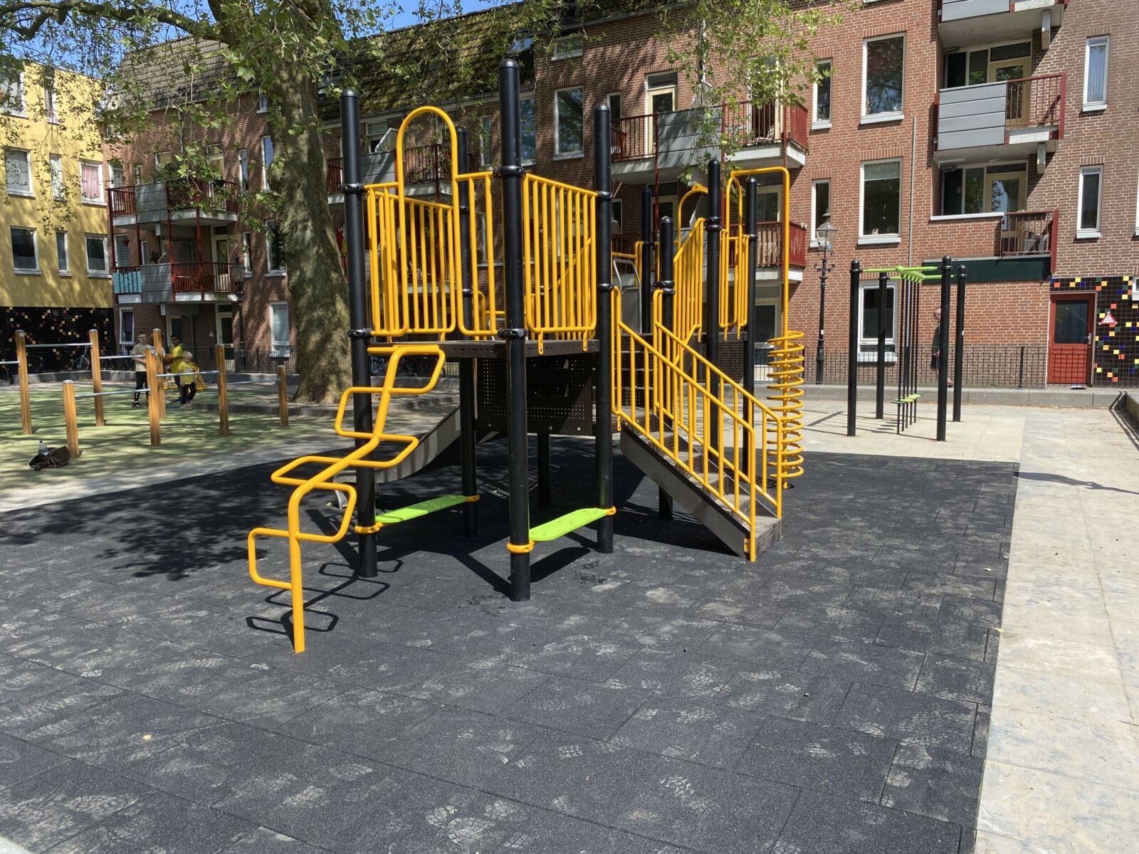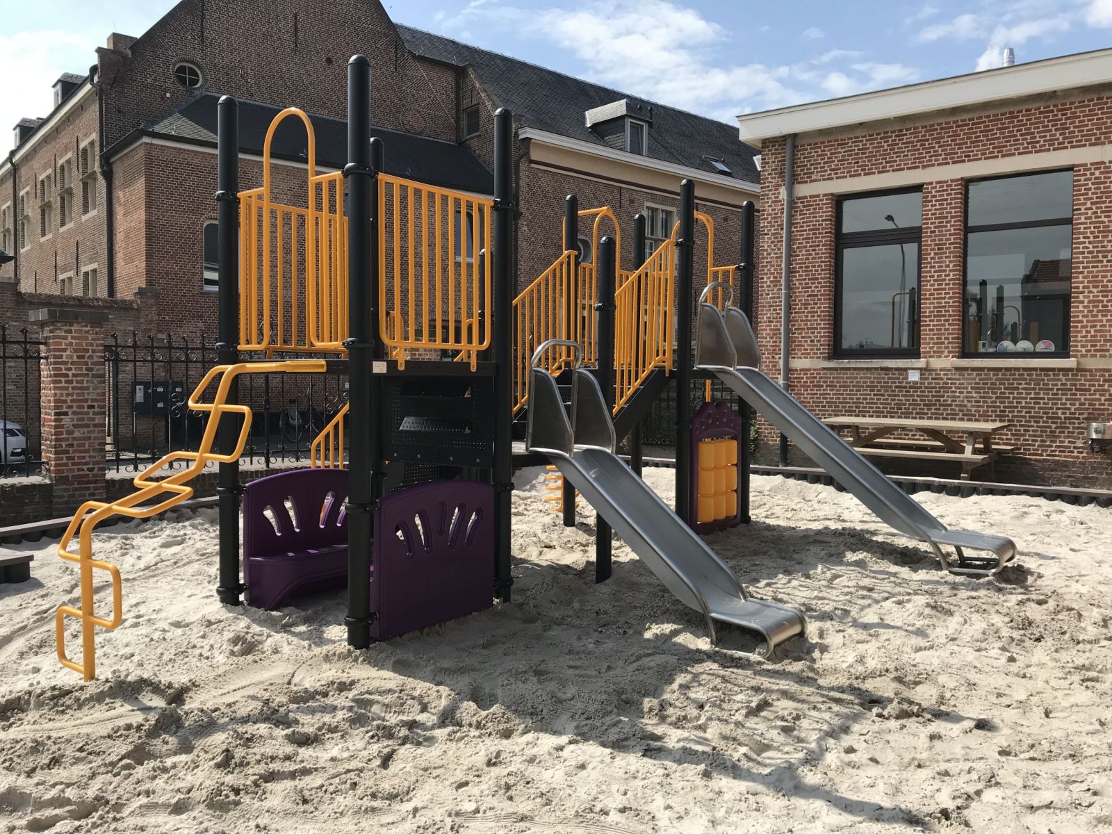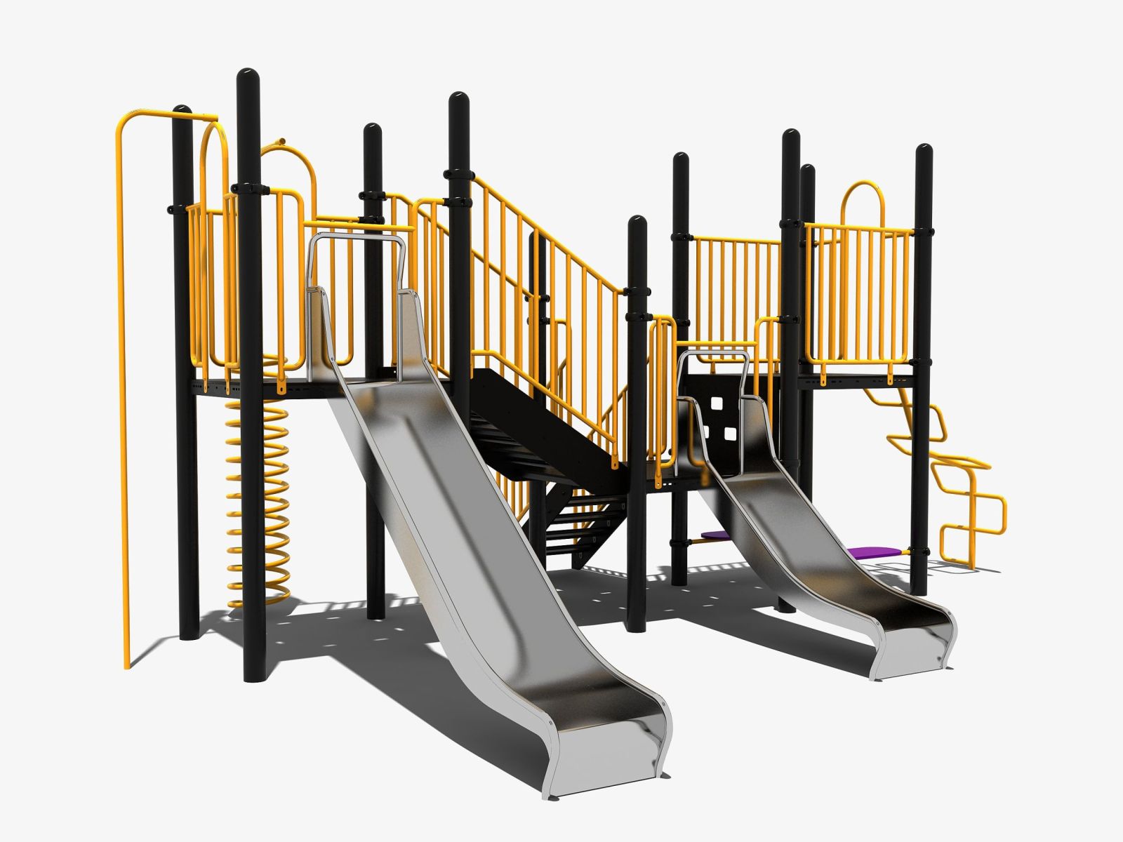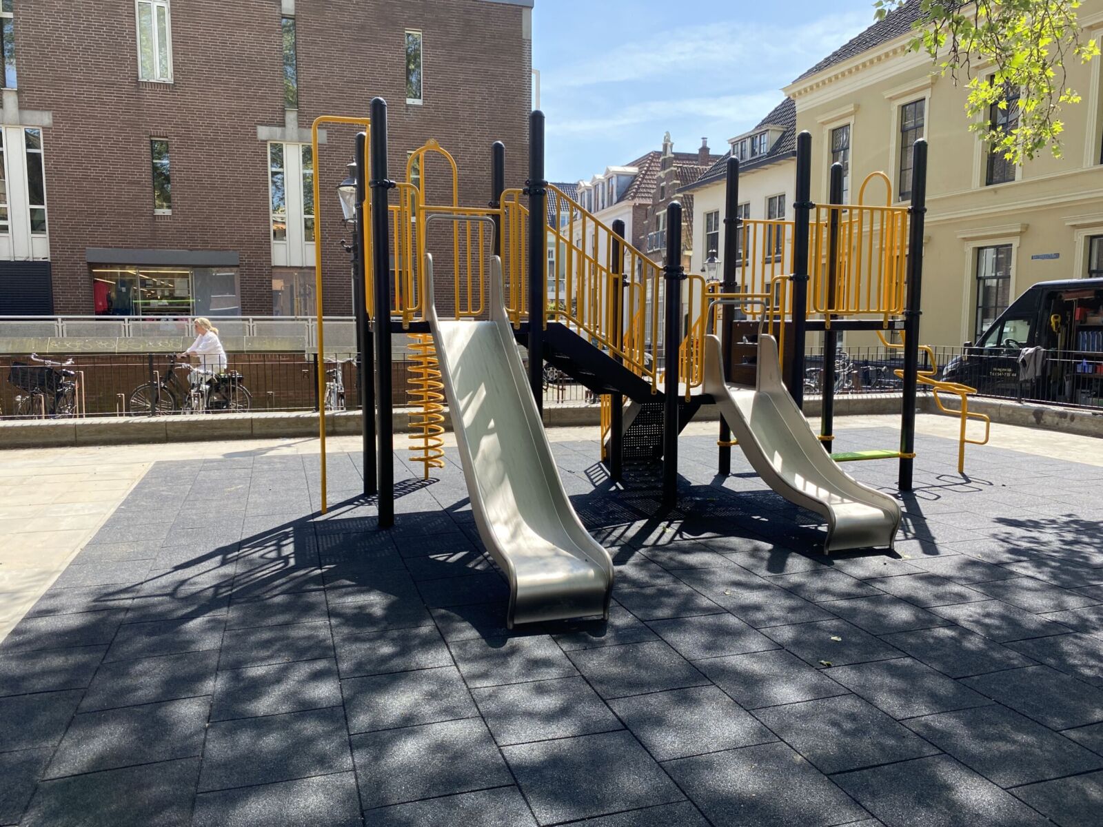Een combinatietoestel met hoogteverschillen en maar liefst twee rvs glijbanen en een glijstang.