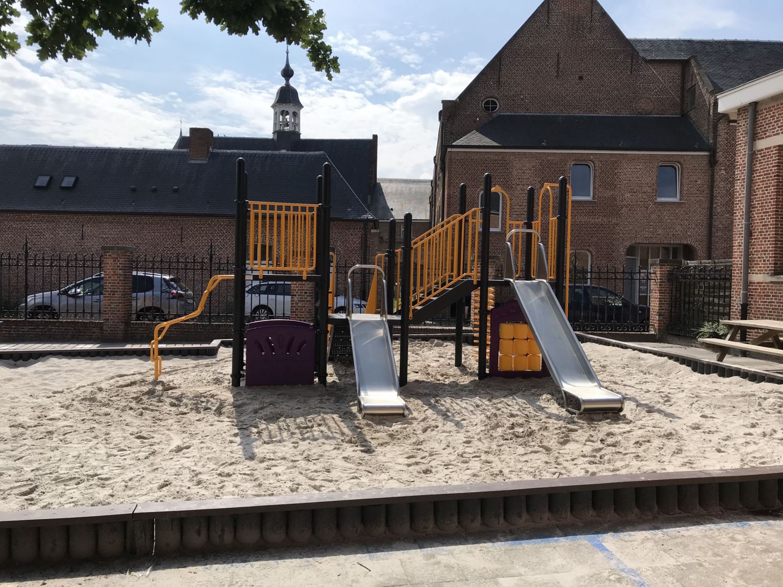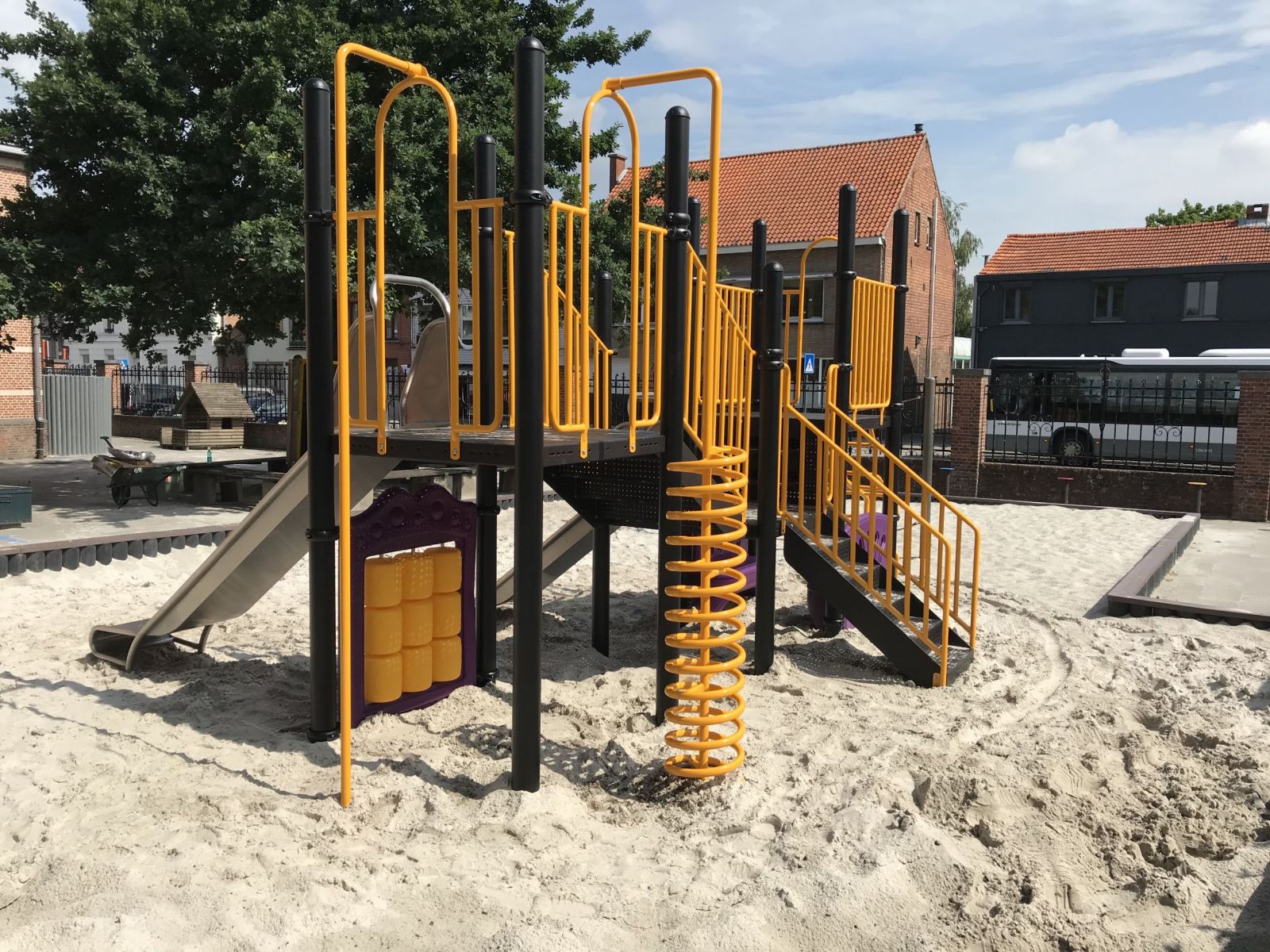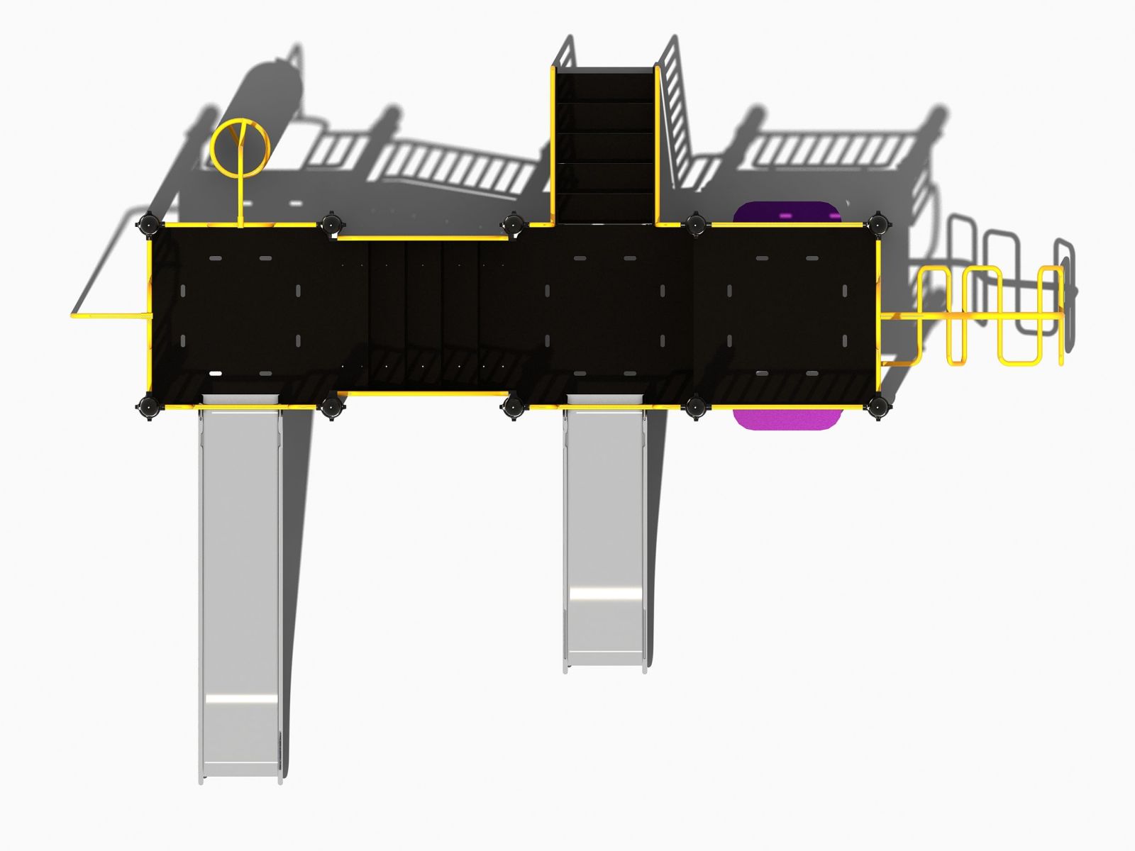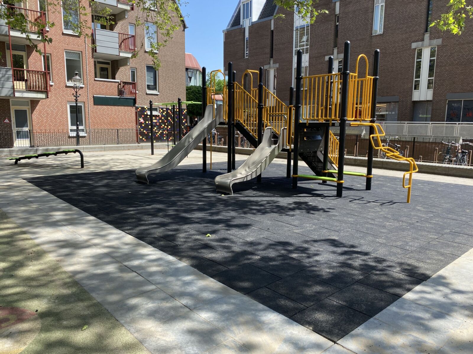 Een combinatietoestel met hoogteverschillen en maar liefst twee rvs glijbanen en een glijstang.