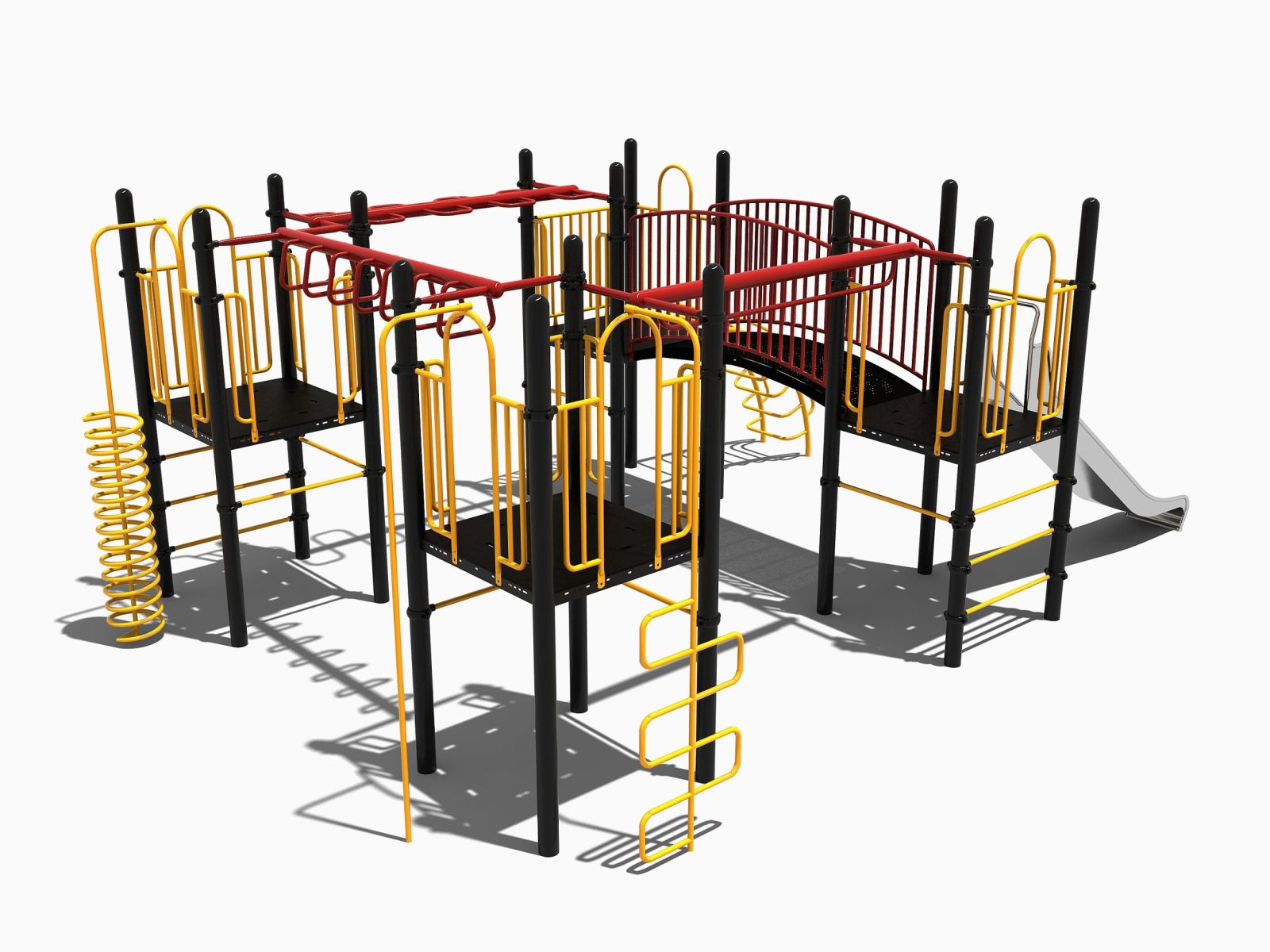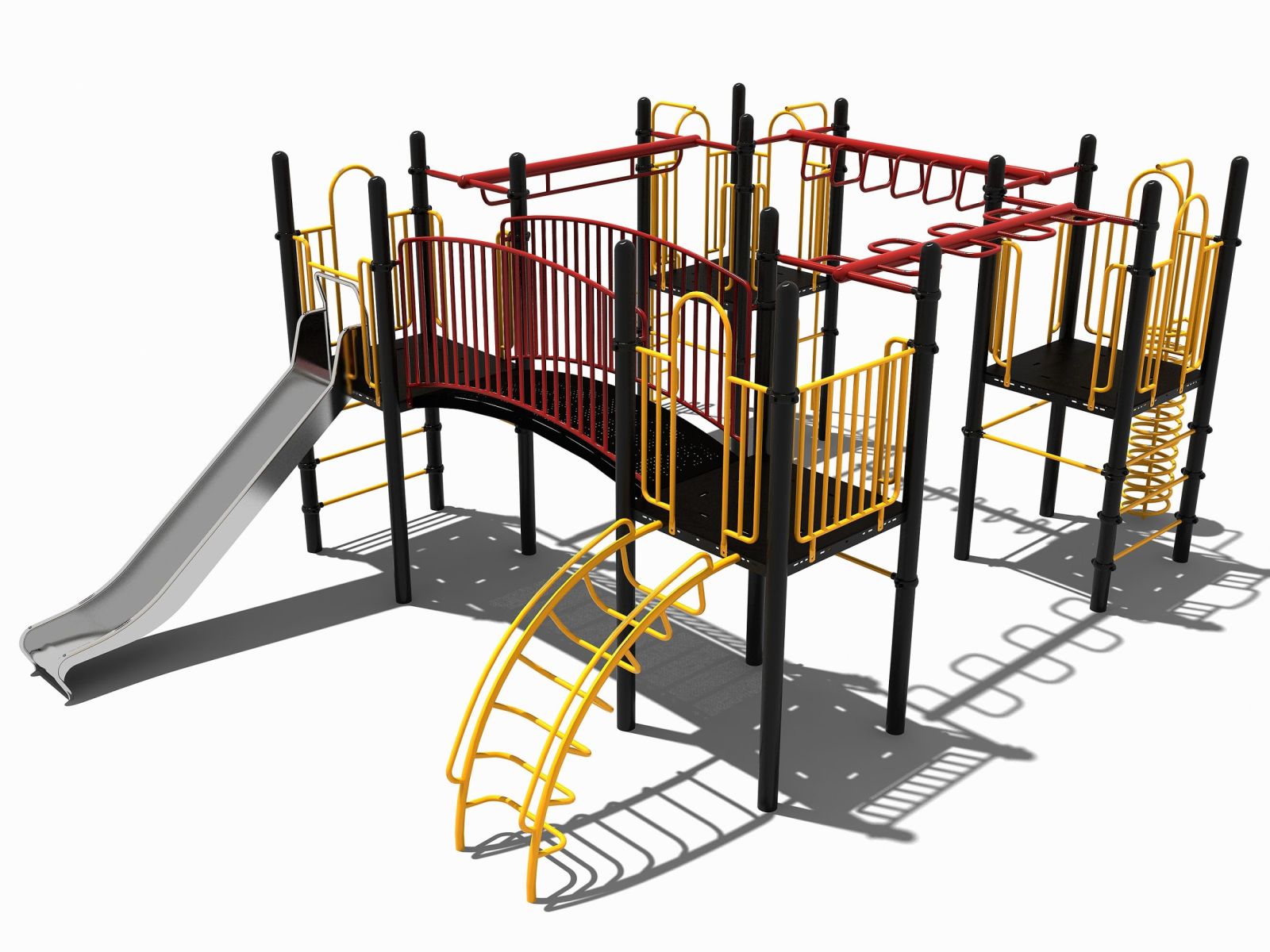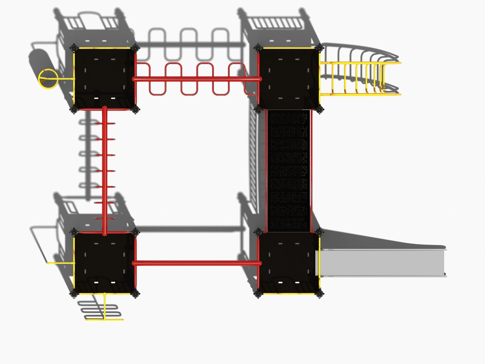 Uitgebreid combinatietoestel met met rvs glijbaan en rondgang. Dit speeltoestel met maar liefst vier platformen behoort tot de robuust metaal en rvs lijn. Dit betekent dat de glijbaan altijd van rvs is gemaakt en de rest van de onderdelen van sterk metaal.