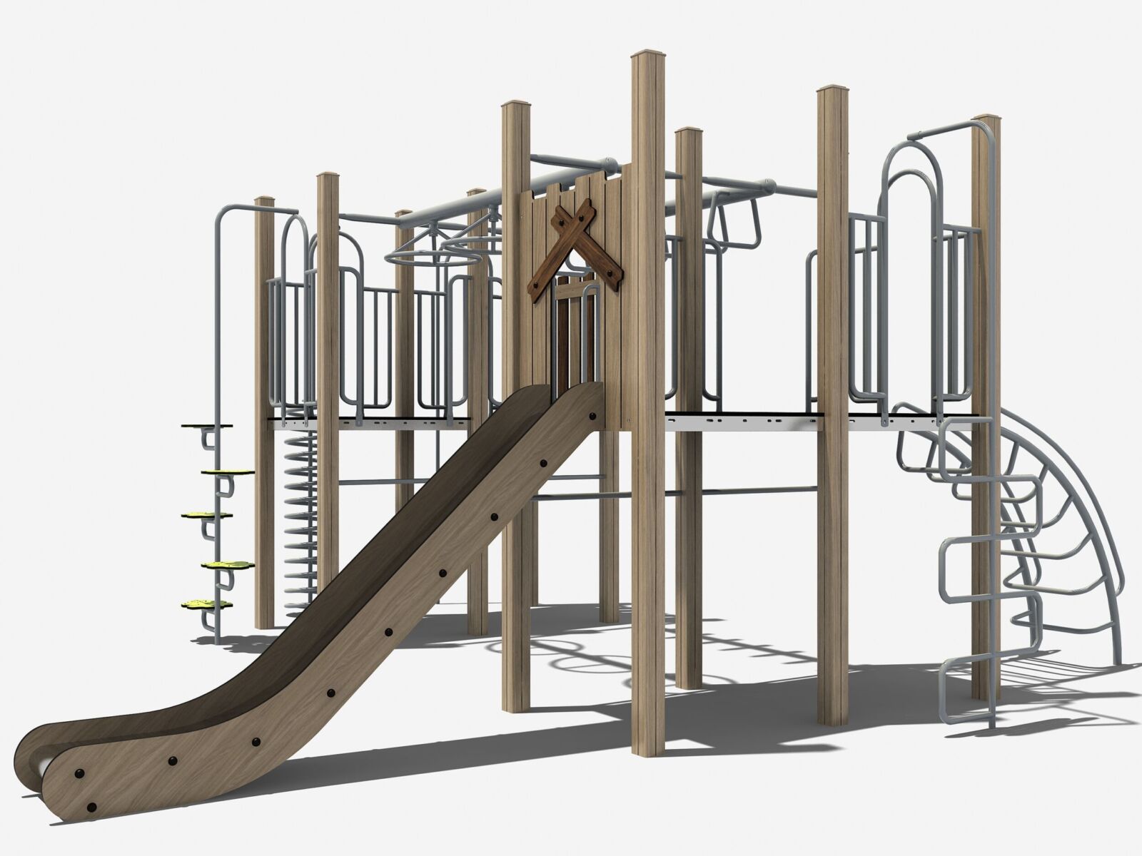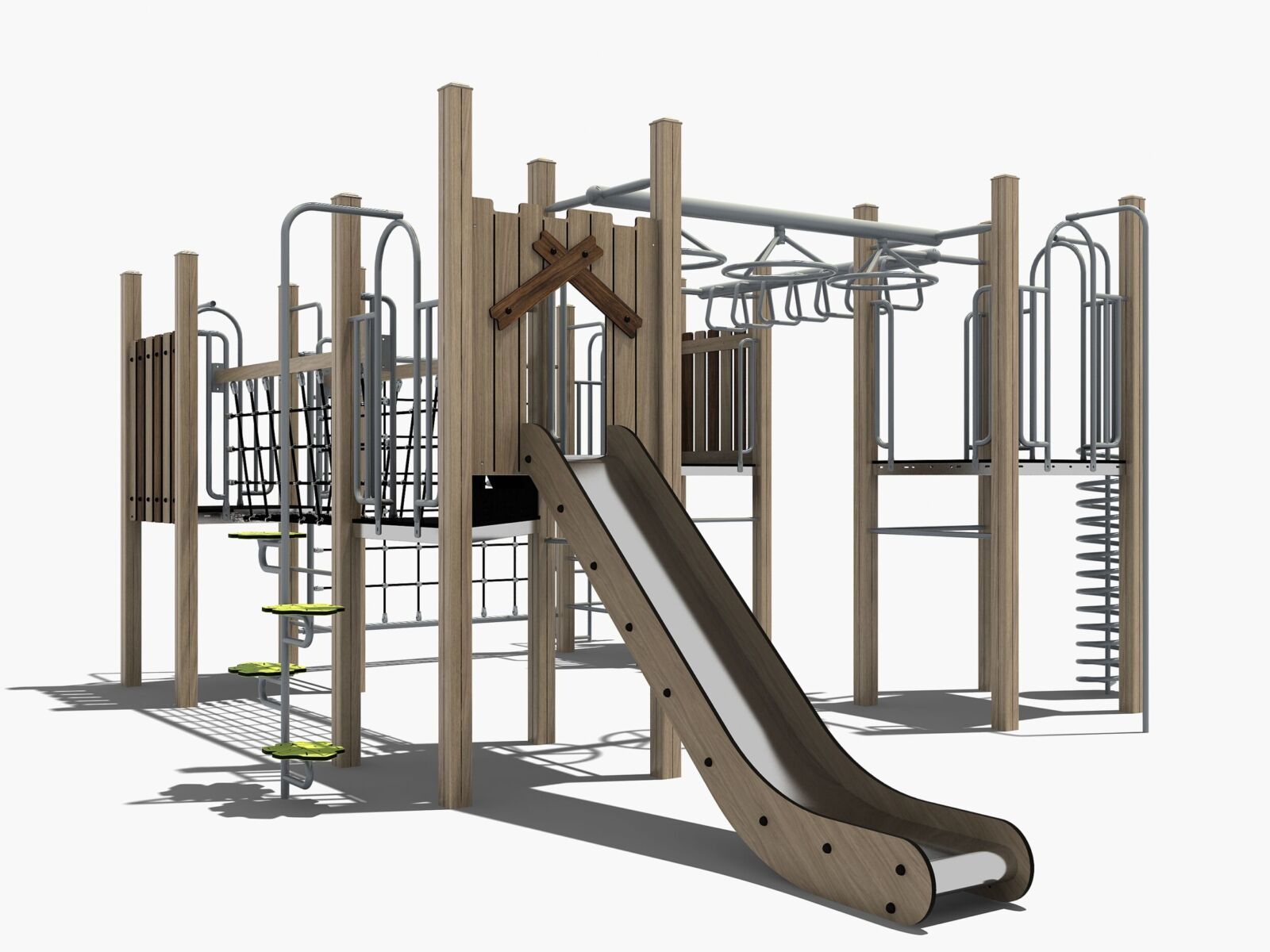 Dat hoeft niet. Hoewel veel mensen natuurlijke speeltoestellen associëren met (robinia) hout, kiest TnT bewust voor houtvrije materialen die een rustige uitstraling hebben maar duurzamer en onderhoudsarmer zijn.
