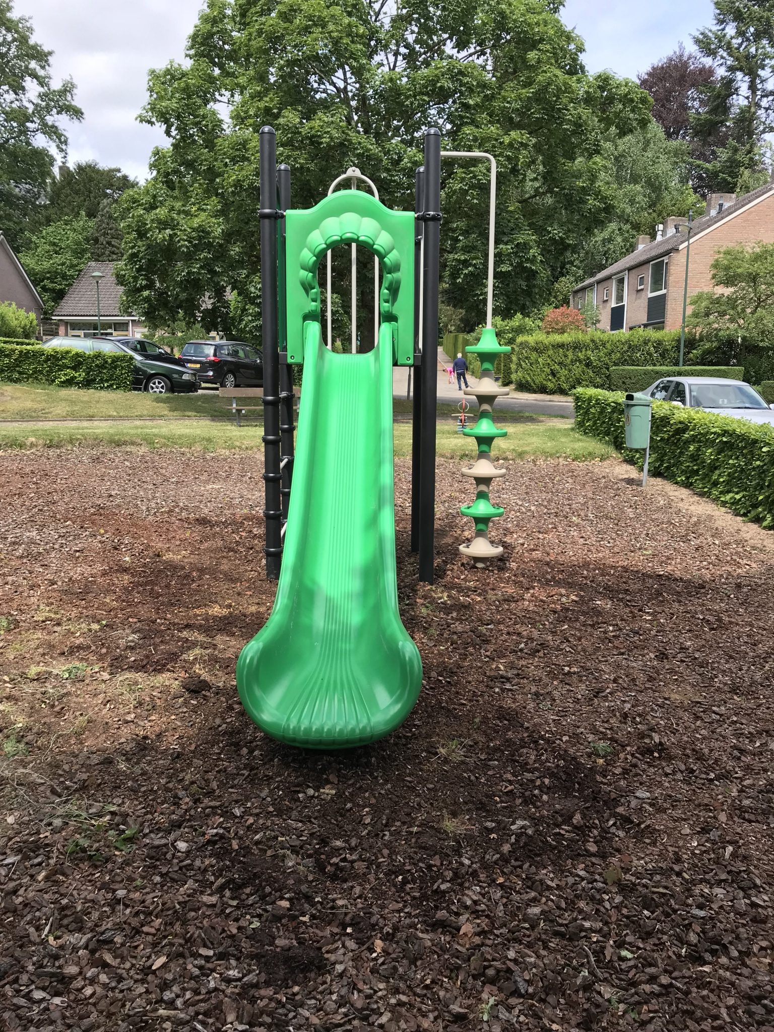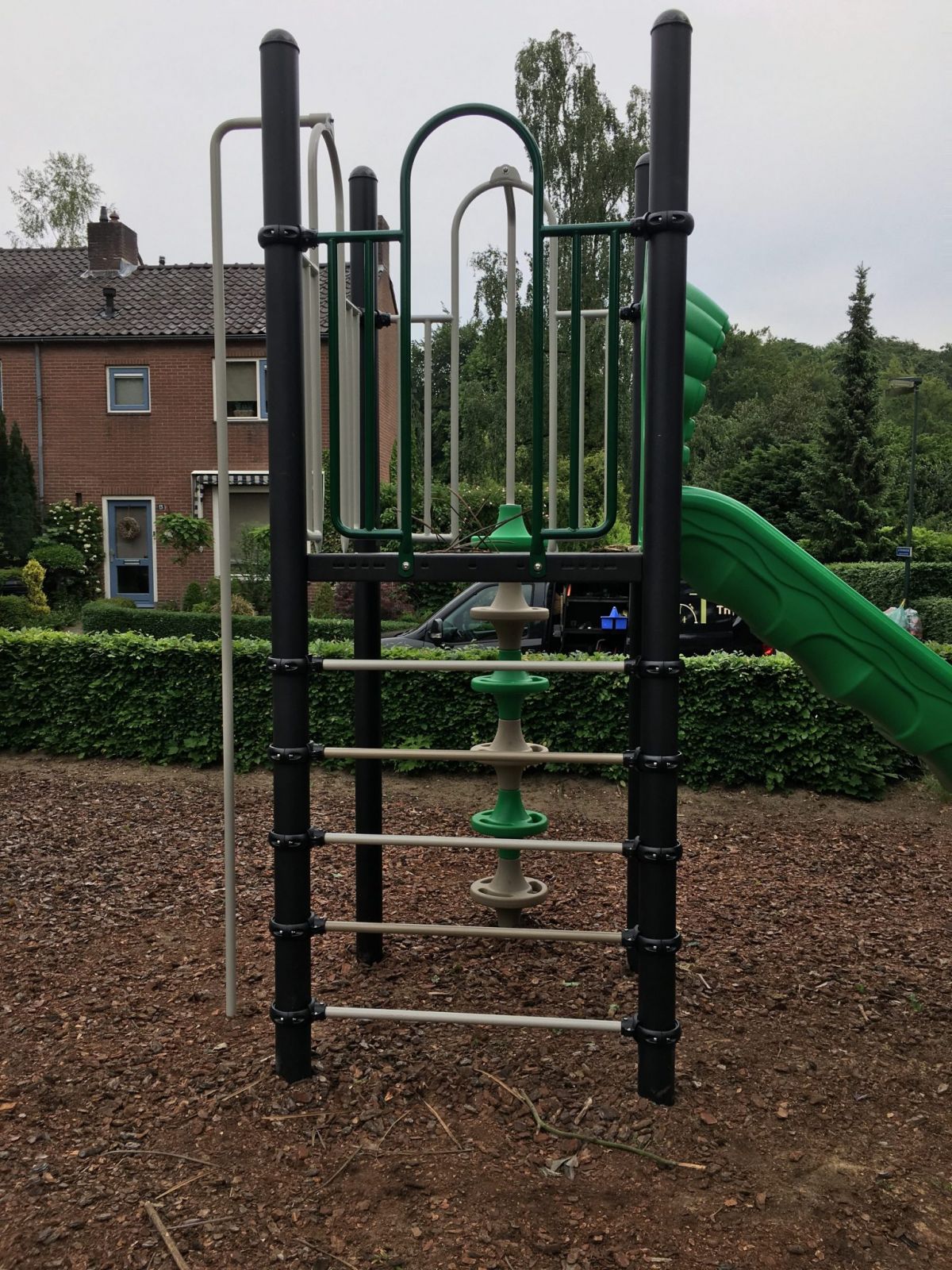 Klein maar fijn!! Een speeltoestel met 1 vloer en glijbaan van 180 cm geplaatst in de gemeente Rozendaal bij locatie de Moestuin.