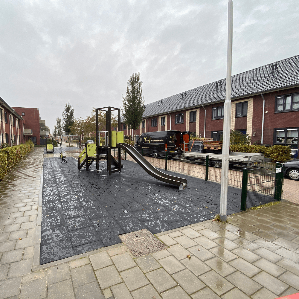 Onder de speeltoestellen aan de Van Kleefstraat lag kunstgras. We zijn begonnen om het kunstgras inclusief de valdempende platen onder het gras te verwijderen. De gemeente zorgde voor de afvoer van het gras met de onderplaten. Aangezien er onder rubber valtegels altijd straatwerk wordt aangebracht, was de volgende klus het aanbrengen van een laag geel zand waarin de betontegels zijn gelegd. Deze betontegels komen lager te liggen zodat, na het leggen van de rubber tegels, de hoogte van het oppervlak naadloos aansluit op de bestaande hoogte van de omgeving. Bij een oppervlakte van 165m2 is dit een precies klusje. Bovendien bleven de speeltoestellen staan dus moest het rubber op maat gezaagd worden rondom de staanders van de verschillende toestellen. Maar het eindresultaat mag er zijn want de speelplek in de wijk ligt er weer superstrak bij.