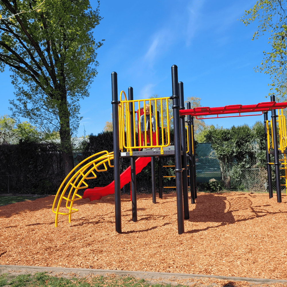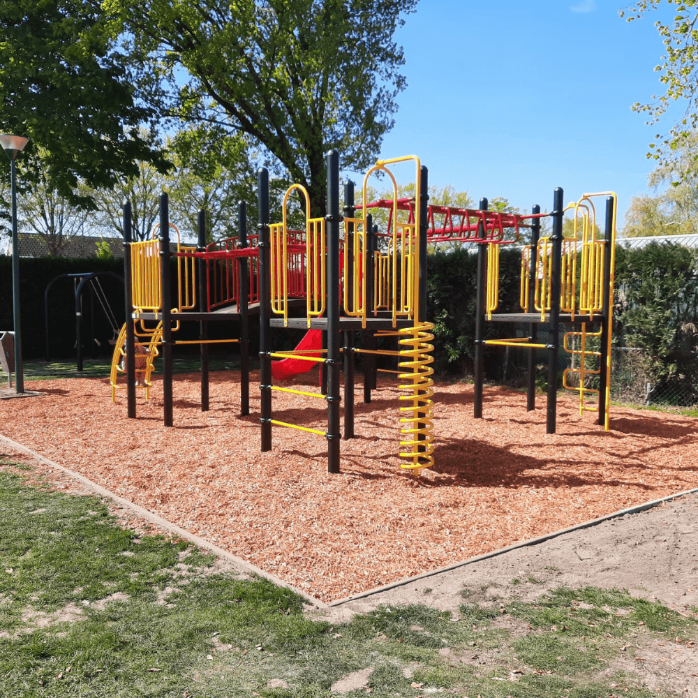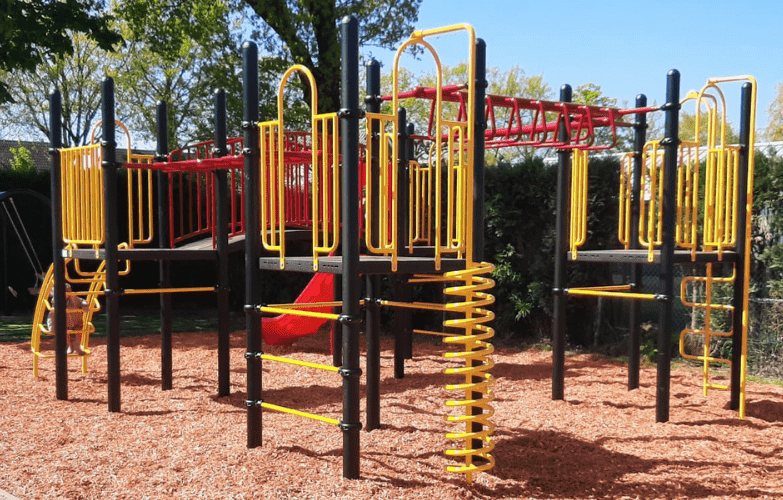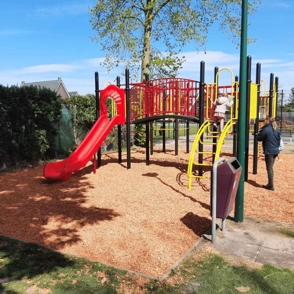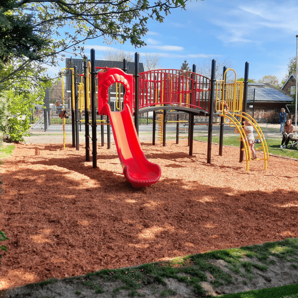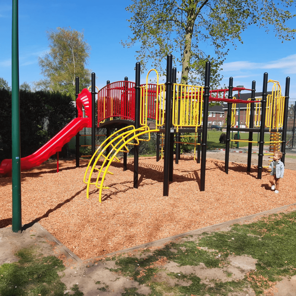 Er was nog wel wat grondwerk te verzetten alvorens met het plaatsen van het grote speeltoestel kon worden begonnen. Maar ook daar draaien onze montagemedewerkers hun hand niet voor om. Omdat voor het nieuwe speeltoestel meer ruimte nodig was, moest eerst het bestaande speelvak vergroot worden. Want er moet wel voldaan worden aan alle wettelijke eisen voor het plaatsen van professionele speeltoestellen, zoals de vrije ruimte die nodig is rondom het speeltoestel. Daarna werd het speeltoestel met de vier platformen neergezet. Alle platformen van dit speeltoestel zijn met elkaar verbonden door verschillende speelelementen. Je kunt via de wielladder, rekstok of ringladder hangend en slingerend als een aap van het ene naar het andere platform. Dat is niet de makkelijkste weg want je hebt hiervoor wel goede armspieren en behoorlijk wat behendigheid nodig. Maar twee van de vloeren zijn ook verbonden met een gebogen loopbrug met veilige leuningen. Aan de vier platformen zijn verschillende opgangen gemaakt om naar boven en beneden te klimmen. Dat kan via het gebogen klimrek, ladders, spiraalwikkel of de slangentrap. Voor een snelle afdaling kies je voor de kunststofglijbaan of de glijstang de weg naar beneden. In verband met de hoogte van dit speeltoestel moet wel rekening worden gehouden met geschikte valondergrond. Moers Belang heeft hier gekozen voor dekowood houtsnippers.