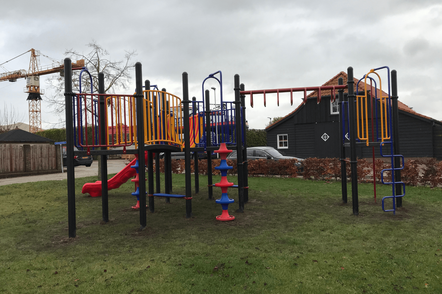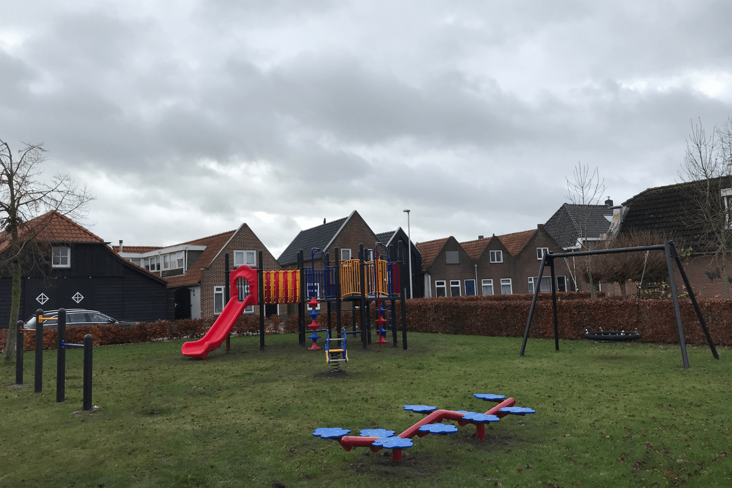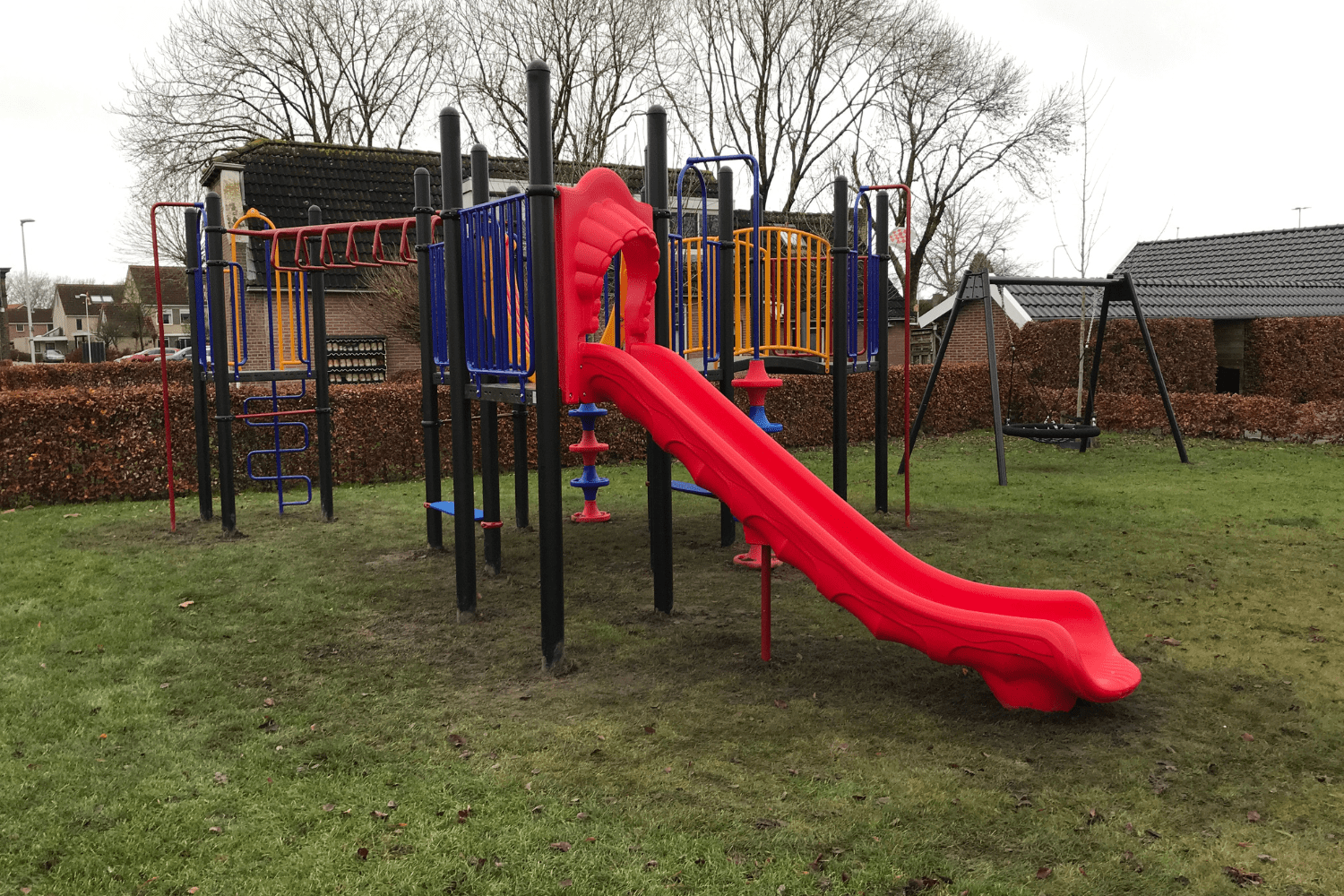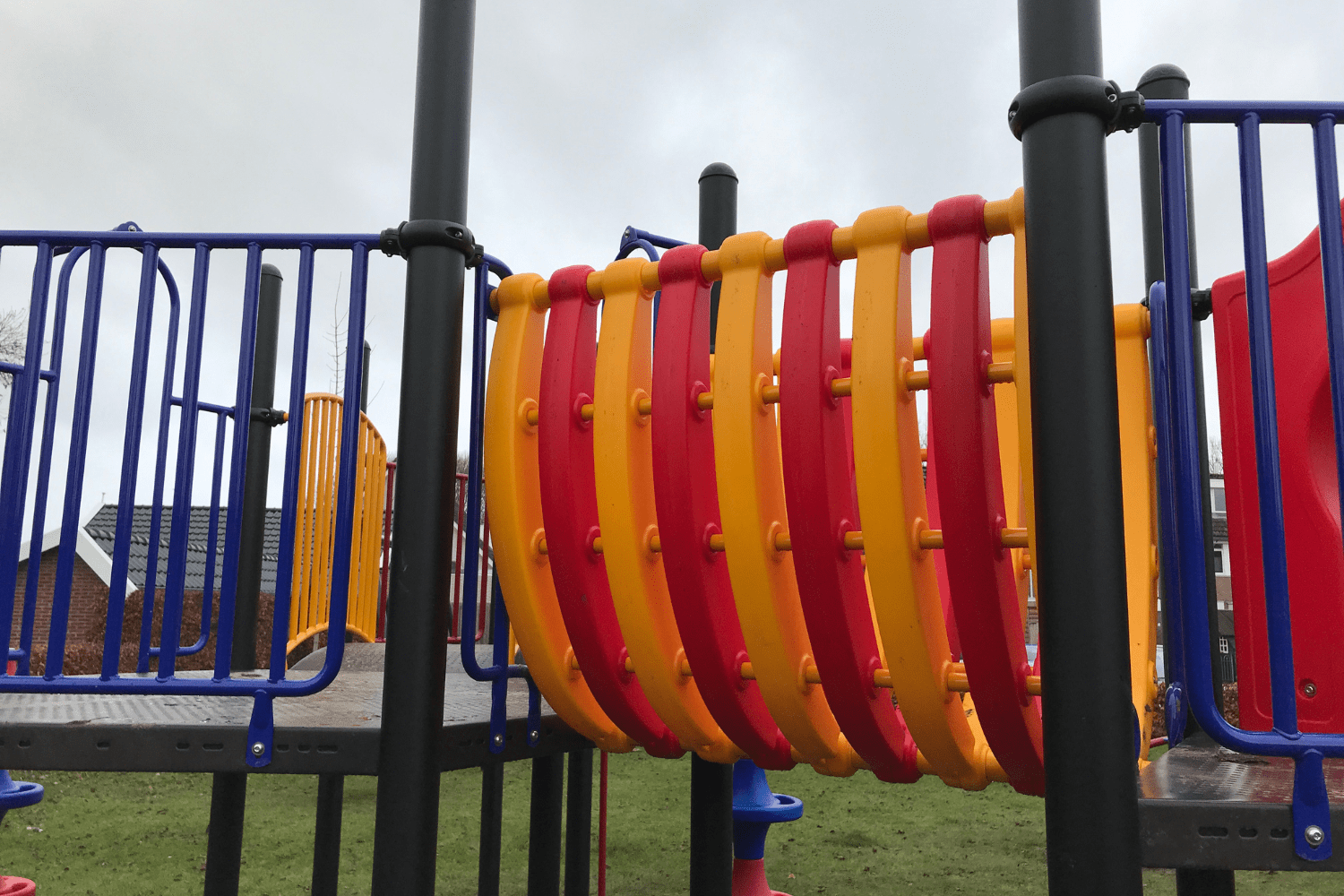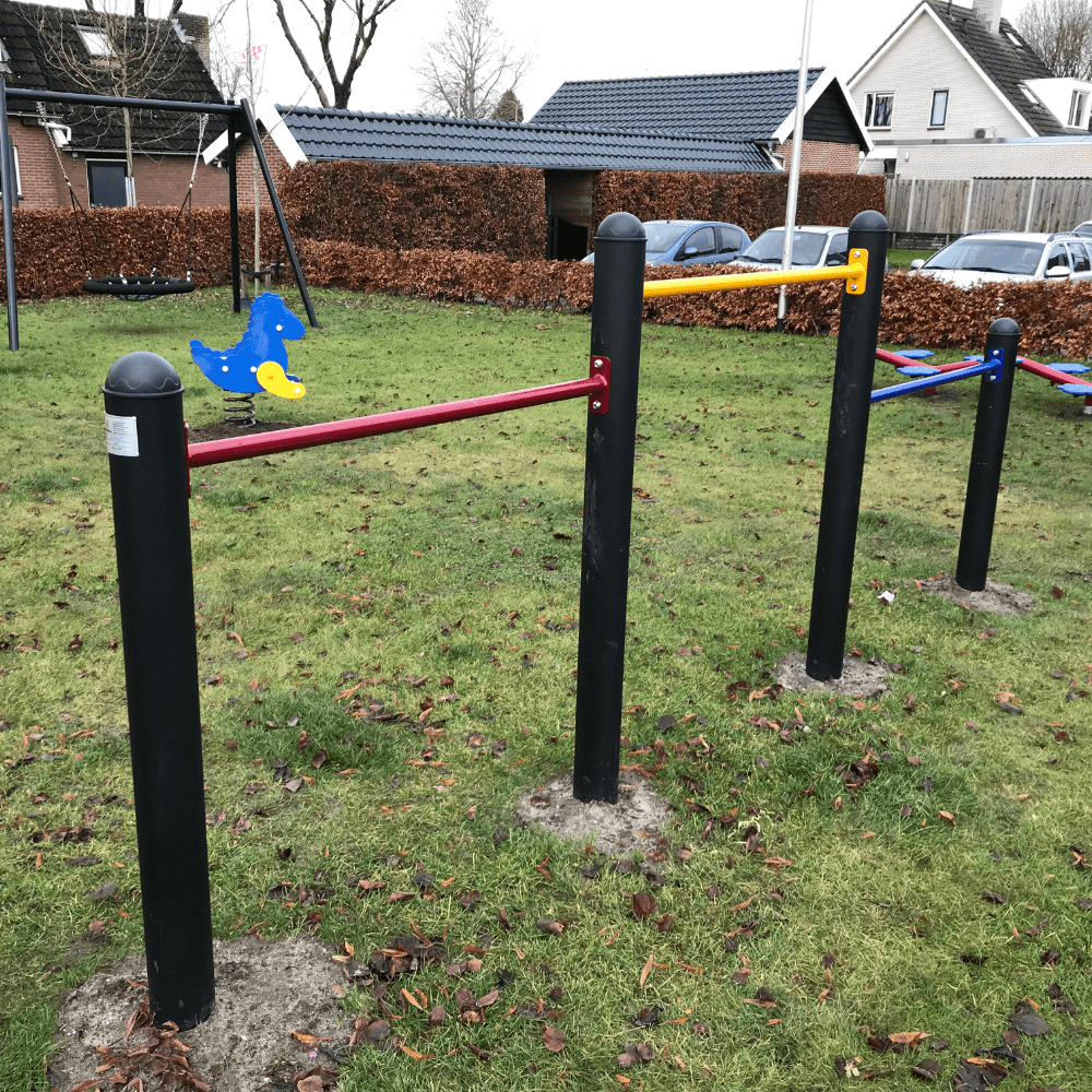 Wat voor de vogelnestschommel geldt, geldt ook voor het duikelrek. Een echte klassieker die al jaren mee doet op schoolpleinen en in speeltuinen. Wie herinnert zich niet de duikelkunsten die je op het duikelrek hebt geleerd? In ieder geval de meeste meisje wel (gek hè dat jongens er toch minder op spelen). Het driedelige duikelrek in Zwartsluis heeft duikelstangen in rood, geel en blauw. En laten dit nou exact dezelfde kleuren zijn als van het grote speeltoestel?