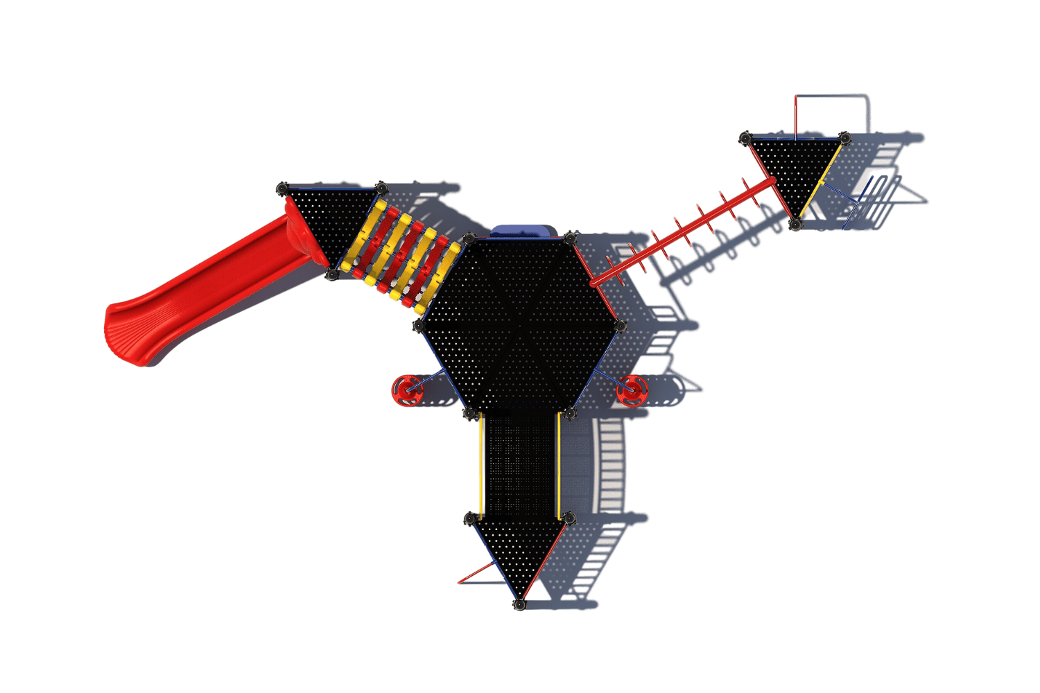 Het pronkstuk in de nieuwe speeltuin is wel het zelfontworpen speeltoestel dat de gemeente Zwartewaterland in de TnT 3D-ontwerper heeft getekend.De basis van deze speeltoren vormt het grote zeshoekige platform in het midden. Van daaruit kun je drie kanten uit om op de andere platformen te komen. Deze vloeren zijn allemaal driehoekig. Aan de grote zeskantige vloer vind je twee opgangen met gekleurde doppen. Hiermee kun je het grote platform beklimmen of afgaan. Sta je op het platform dan loop/kruip je via de halfopen elementen-tunnel naar het platform met de kunststof glijbaan voor een snelle roetsj naar beneden. Voel jij je meer een brandweerman dan loop je via de brug naar het andere platform om via de glijstang weer met beide voetjes op de grond te komen. Maar ben je een Tarzan dan kies je voor de zwaarste weg en ga je hangend via de ringladder naar het platform met nog een glijstang en een slangenopgang. Onder de grootste speeltoren zijn zitbankjes gemaakt. Alle speelelementen en leuningen zijn uitgevoerd in de kleuren geel, blauw en rood. Deze kleuren zijn zelf door de gemeente Zwartewaterland gekozen.