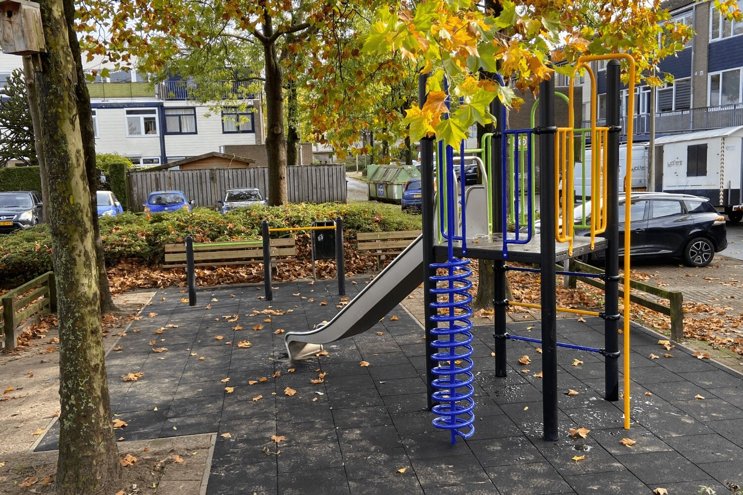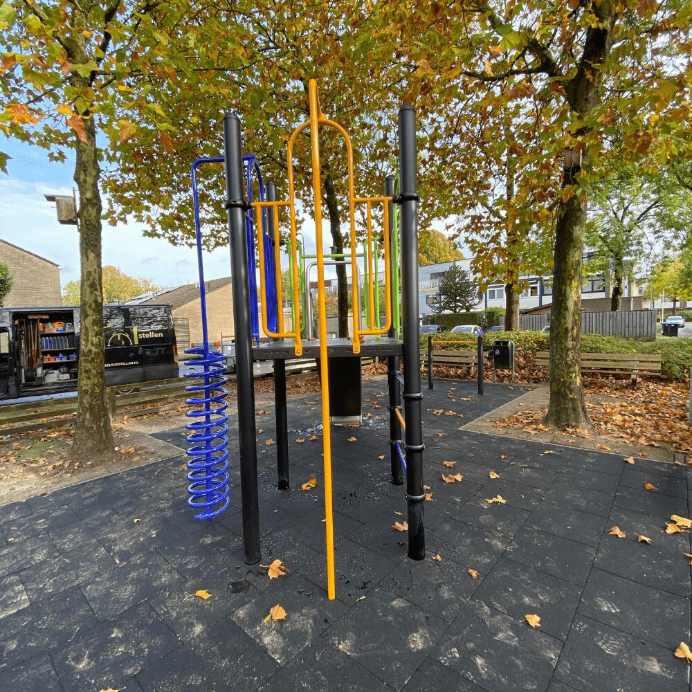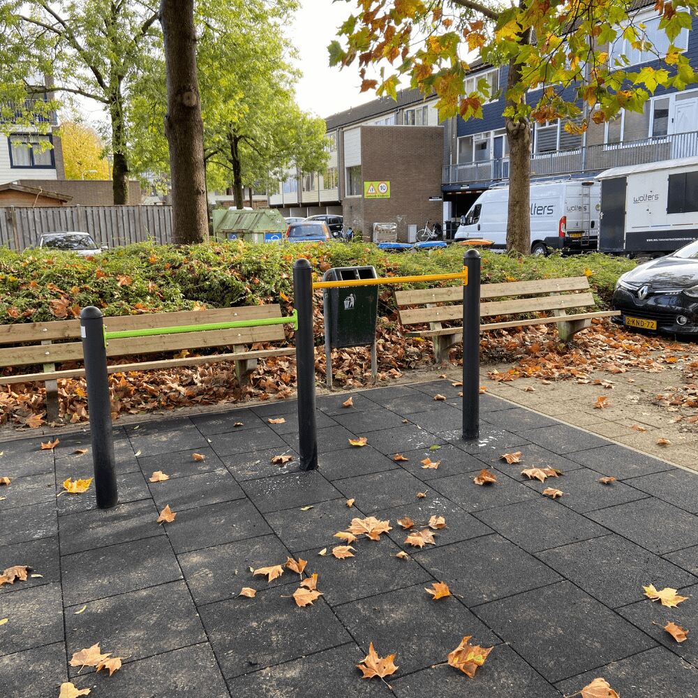 Ook hebben we voor de kinderen in de buurt een nieuw tweedelig duikelrek geplaatst. De strakke zwarte staanders in combinatie met de duikelstangen in lime en geel steken mooi af tegen de zwarte ondergrond.