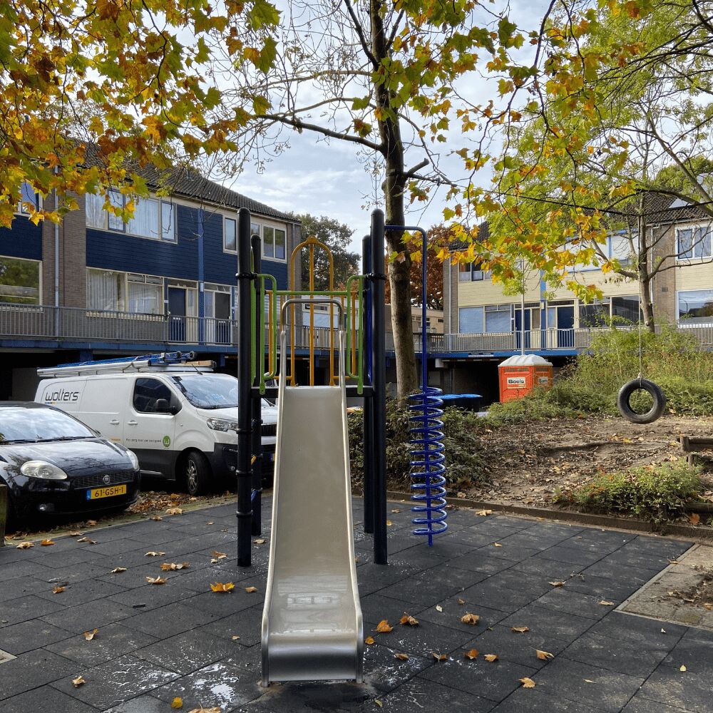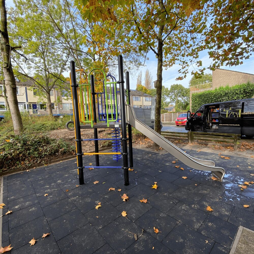 Omdat wij al eerder hebben geleverd aan de gemeente Deventer viel de keuze opnieuw op twee speeltoestellen uit de robuust metaal en rvs lijn van TnT. Echter het speelplekje is qua oppervlakte niet erg groot dus moest er rekening worden gehouden met de beschikbare ruimte en de vrije ruimte die rondom professionele speeltoestellen is vereist. Dus koos Groenbedrijf Deventer voor een compact klimtoestel met een glijbaan. Dit metalen speeltoestel heeft alleen speelelementen van gegalvaniseerd metaal en een roestvast stalen glijbaan.