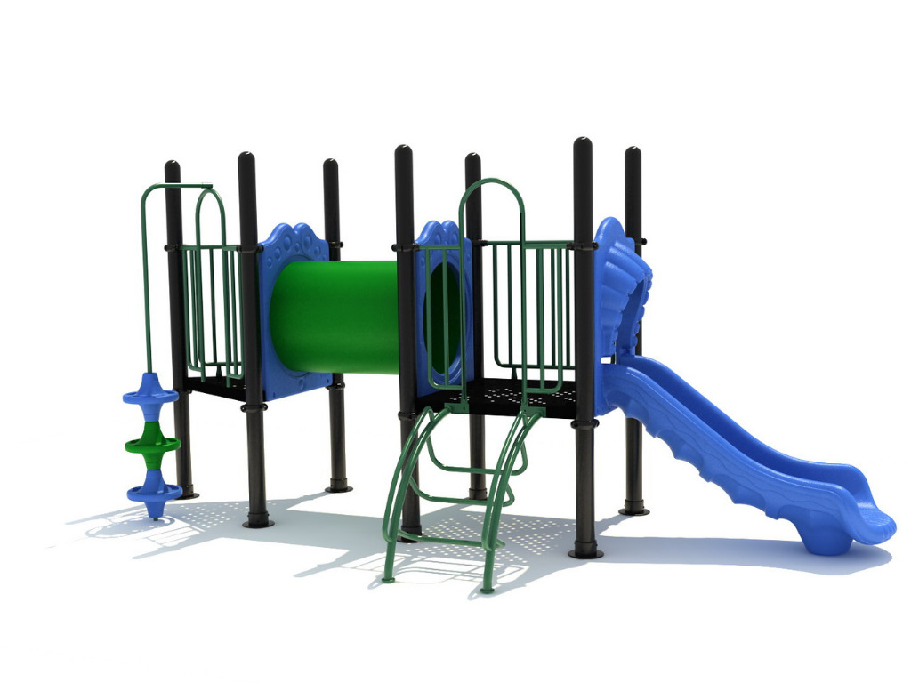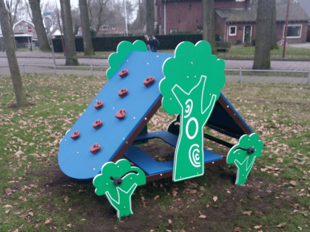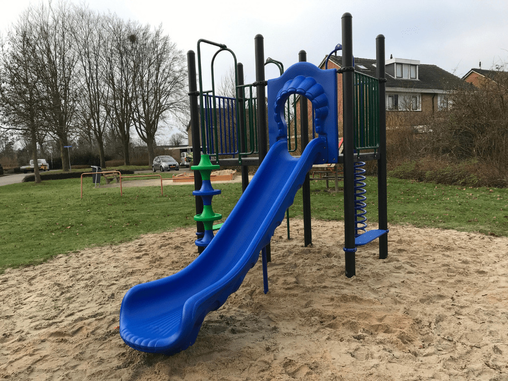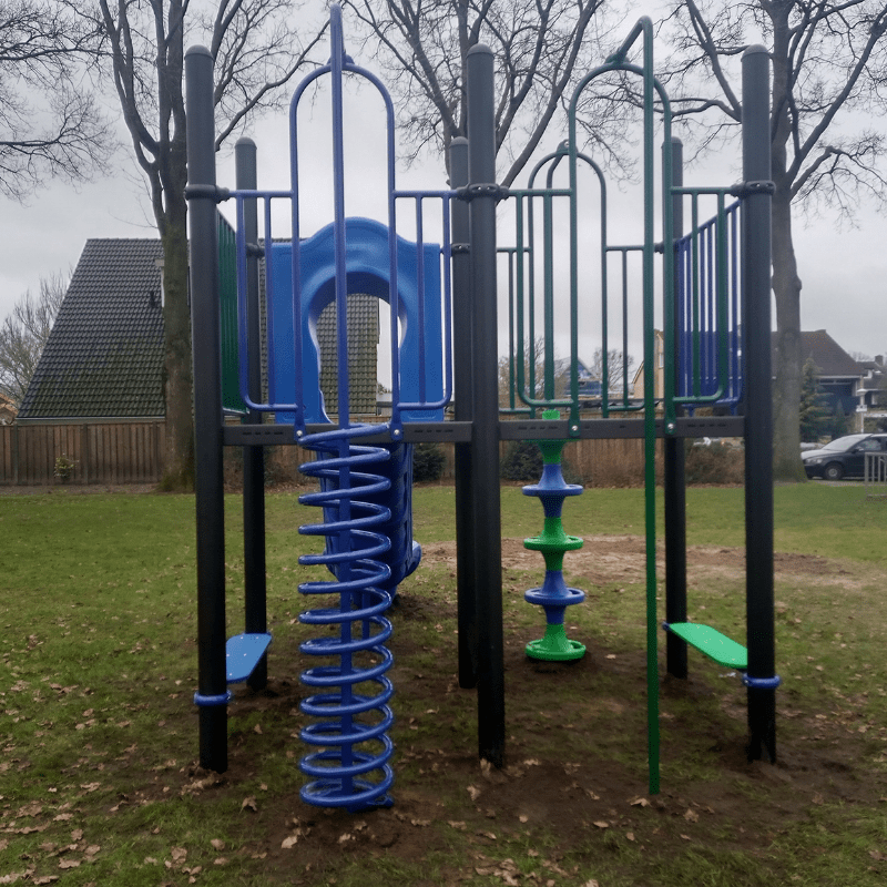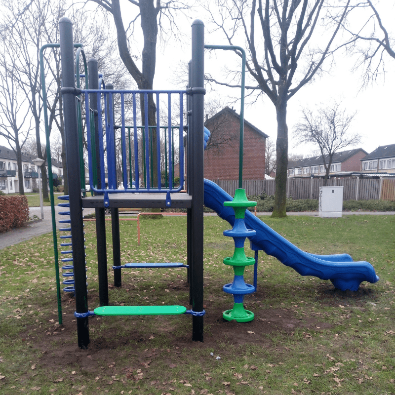 Aan de Schout Doddestraat vind je ook een combinatietoestel in het blauw met groen. Dit speeltoestel is door zijn beperkte hoogte ideaal voor de jongere kinderen uit de buurt. De twee platformen zijn maar 90 cm hoog en met elkaar verbonden door een veilige dichte kruiptunnel. Het driehoekige platform beklim je via de opgang met de kleurrijke doppen. Via de kruipbuis kom je op het vierkante platform. De vloer met de kunststof glijbaan kun je ook bereiken met het gebogen klimrek. Dat deze speelplek echt voor de kleintjes is, bewijst wel de aanvulling met twee leuke veerfiguren uit het assortiment van KBT.