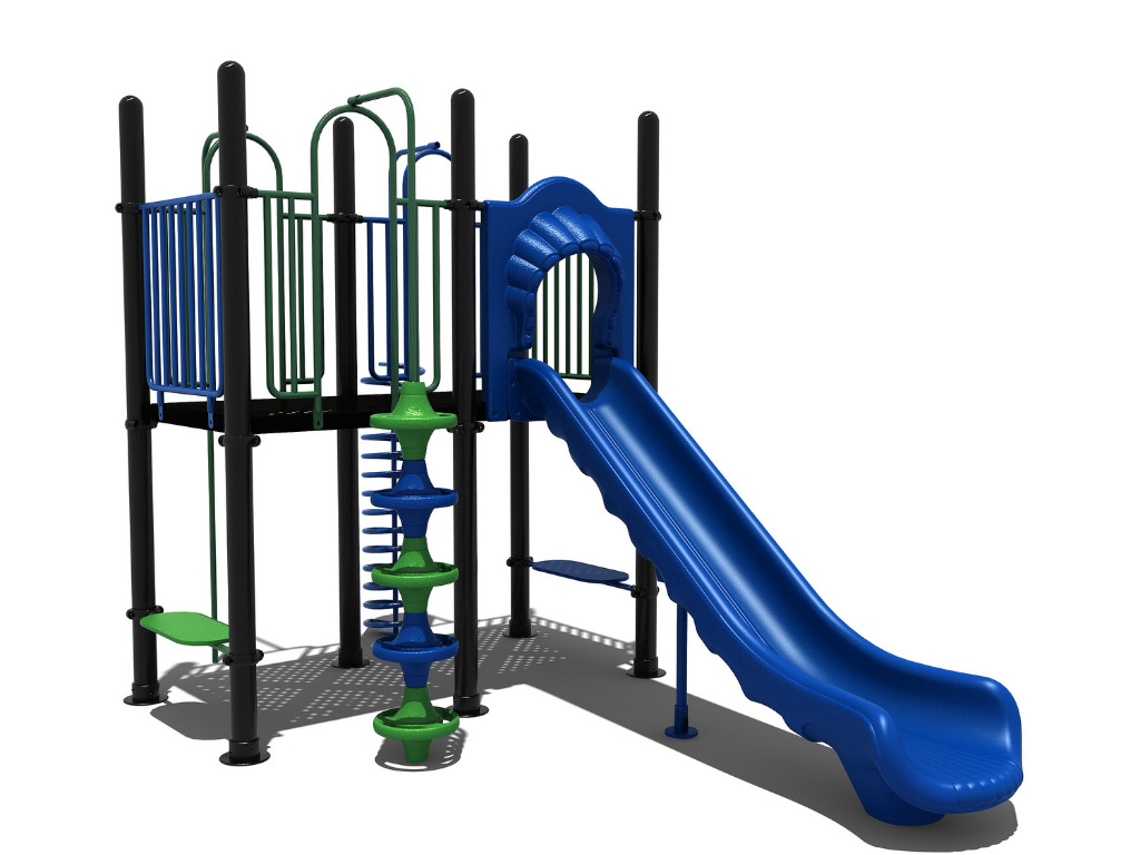 Zowel op de speelplek aan De Wulp, Aalscholver en de Dunantstraat is eenzelfde combinatietoestel geplaatst. Deze klimtoren met glijbaan bestaat uit een groot platform waaraan meerdere speelelementen zijn bevestigd. Er zijn verschillende manier om naar het dubbele platform te klimmen. Dit kan via de opgang met de doppen maar ook via de spiraal. Sta je eenmaal boven dan glij je via de robuuste kunststof glijbaan weer naar beneden of je neemt als een echte brandweerman de glijstang. Onder het platform zijn twee plateautjes gemaakt om op te zitten. Voor dit speeltoestel is gekozen voor de kleuren blauw en groen. Een mooie kleurencombinatie die rustig overkomt. Maar voor dit speeltoestel geldt – net als bij de andere speeltoestellen uit de metaal- en kunststofserie – dat je zelf de kleuren mag bepalen. Zo kun je de uitstraling van je speeltoestel helemaal naar eigen wens aanpassen. Naast het combinatietoestel is er aan de Dunantstraat ook nog een dubbele schommel met zitjes geplaatst.