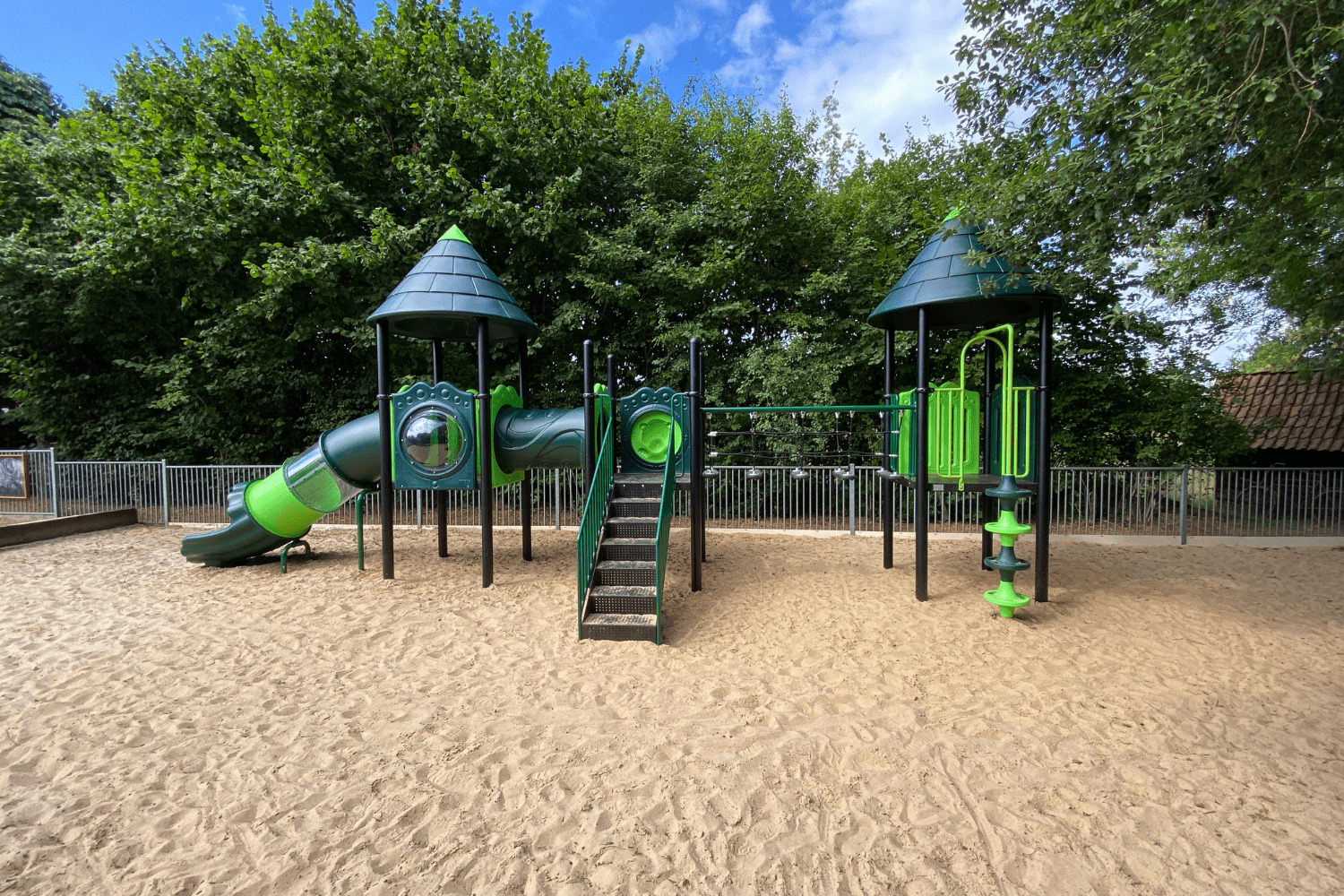 Ter gelegenheid van het heuglijke feit tekende de directrice Sandra Veehof zelf een speeltoestel in onze TnT 3D-ontwerper om het cadeau te geven aan alle kinderen die het kinderdagverblijf, de peuteropvang en de naschoolse opvang bezoeken. En wat een mooi speeltoestel is het geworden in die prachtige kleuren van donkergroen met speelse limegroene accenten, die de ontwerpster zelf heeft uitgekozen. Je eigen kleuren bepalen is overigens een gratis optie van TnT Speeltoestellen.