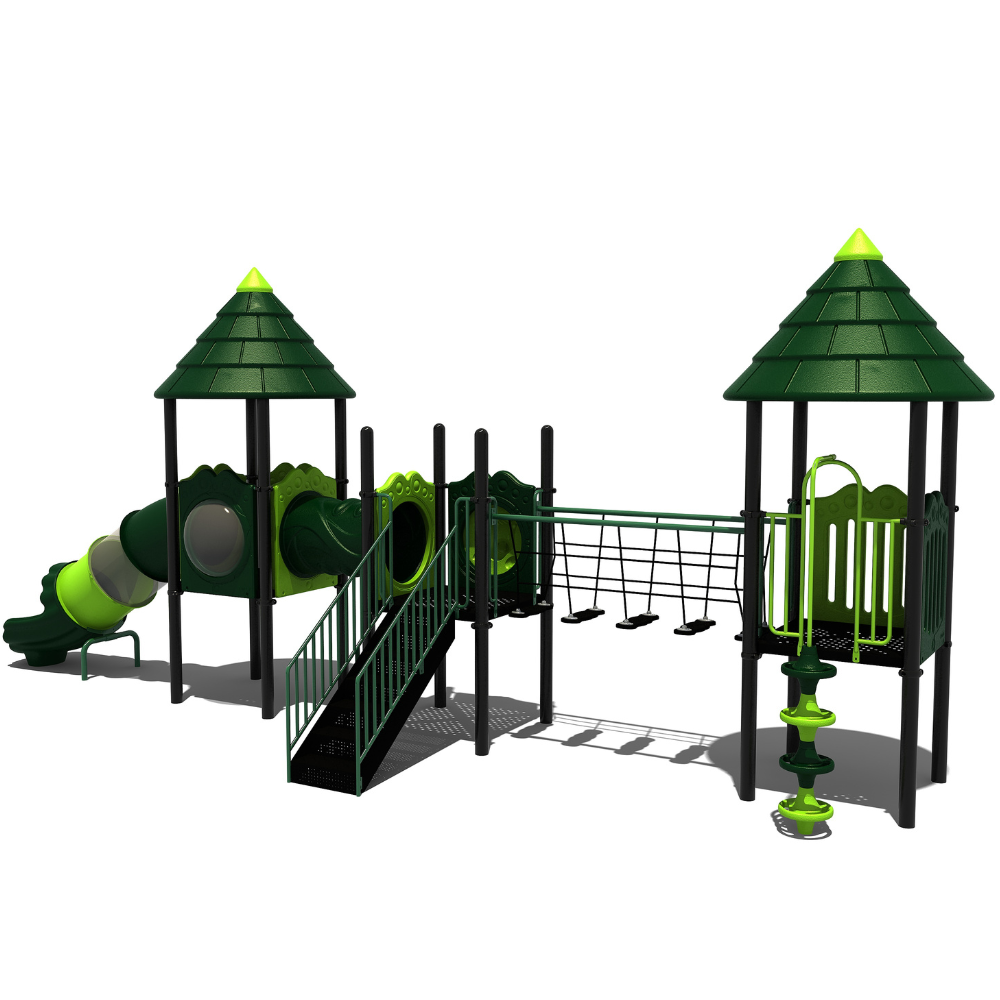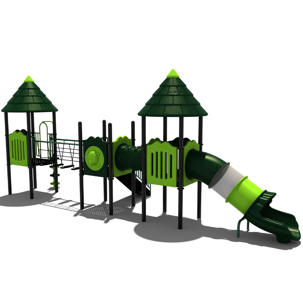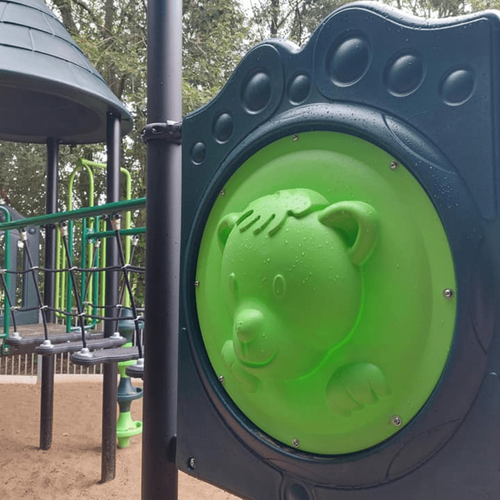 Het speeltoestel behoort tot onze metaal- en kunststoflijn en bevat zowel metalen als kunststof speelelementen. Het combinatietoestel bestaat uit drie platformen die in een lijn zijn geplaatst omdat rekening moest worden gehouden met de bestaande ruimte en de vrije ruimte rondom het speeltoestel. Aan het achterste platform is een doppenopgang geplaatst om naar boven of beneden te klimmen. Via de balanceerstepjes voorzien van een veilige leuning met voldoende beveiliging loop je naar het tweede platform. Aan deze vloer zit een robuuste trap naar boven met een stevige leuning. Dit middelste platform heeft een bijzonder tintje door een opvallend detail in de wand van het platform. Want als je aan de buitenkant naar boven kijkt dan zie je een duidelijk (Bommel de) Beerhoofd verwerkt. Vanaf het middenplatform kruip je via de kruiptunnel naar het platform met de dichte tunnelglijbaan van waaruit je heerlijk naar beneden roetsjt. De beide buitenste platformen zijn voorzien van een dakje met een speels limegroen accentje.