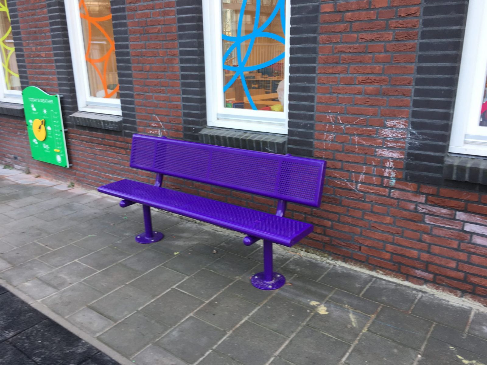 Kleuren zijn belangrijk voor kinderen, ze hebben aantrekkingskracht en stimuleren de creativiteit, emoties en het onderbewustzijn van kinderen. En kleur heeft dit speeltoestel zeker, de zwarte palen en kruipbuis komen mooi uit met de oranje, gele en groene elementen van het toestel. Dat geldt ook voor de twee losse speelpanelen die aan de muur zijn bevestigd. Maar deze hebben niet alleen een opvallende kleur, ze zijn ook nog eens leerzaam Met deze spelpanelen oefenen kinderen op een speelse manier de basisbegrippen als bijvoorbeeld tellen en klok kijken. Over nog meer kleur gesproken, wat vinden jullie van de paarse metalen zitbank op de speelplaats?