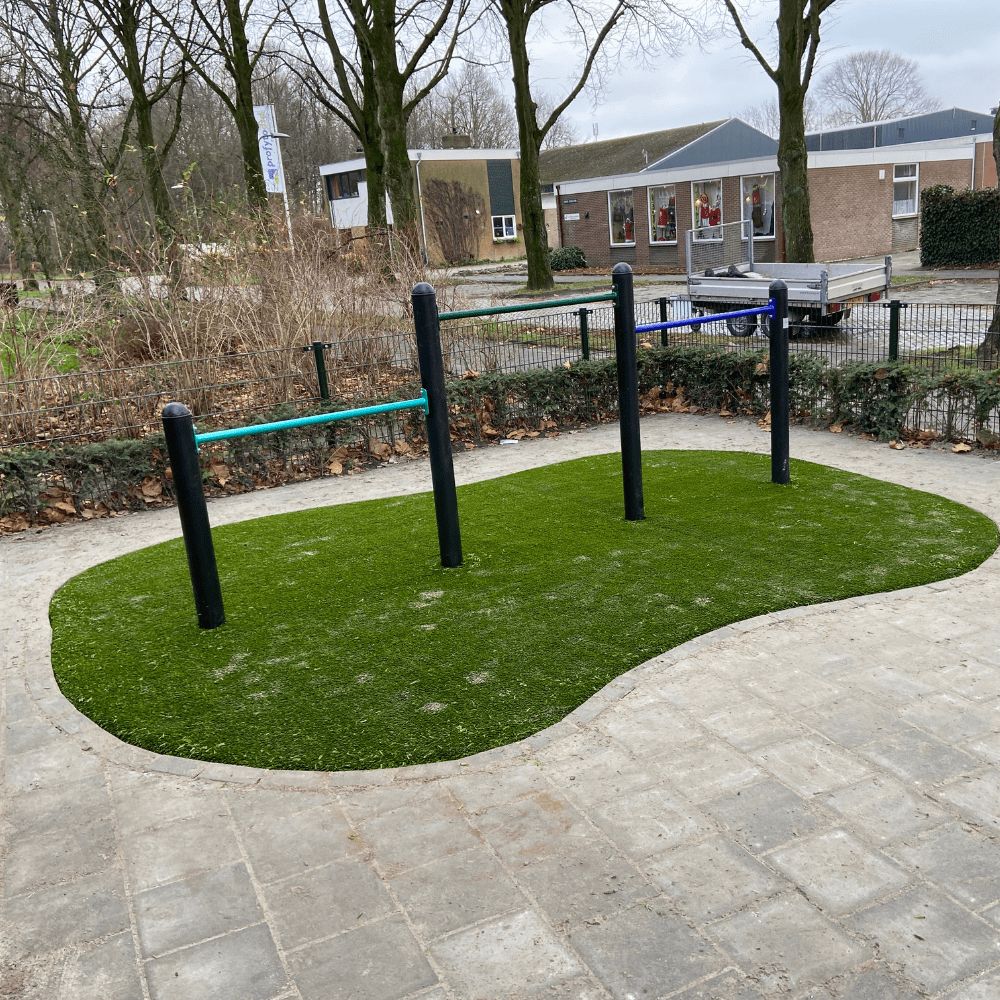 Het kinderdagverblijf heeft zelf de kleuren gekozen voor het speeltoestel. Het fellere groen gecombineerd met blauw past uitstekend bij de ondergrond. Ook voor de duikelrekken geldt dat je zelf de kleuren van de duikelstangen mag kiezen. Hanse Panse Kevertje koos voor drie verschillende kleuren maar uiteraard kun je ook voor bijvoorbeeld een kleur gaan.