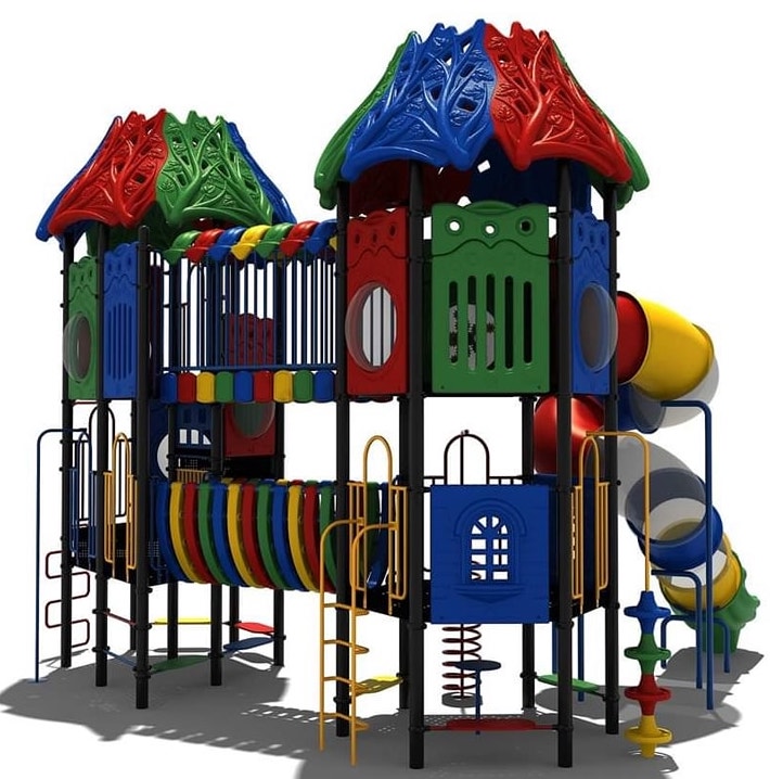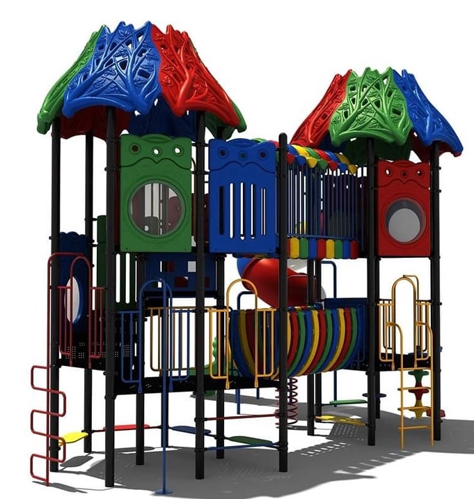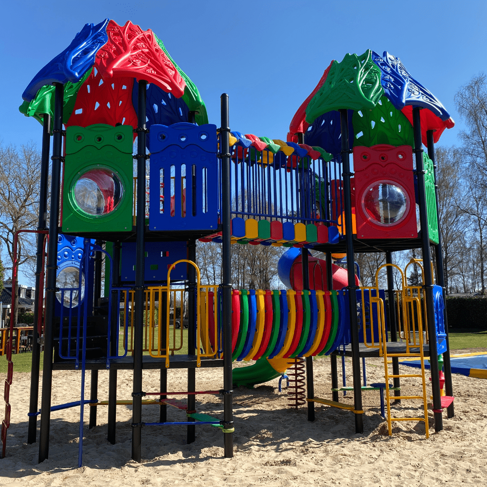 En wat heeft dit speeltoestel veel te bieden! De basis van het speeltoestel bestaat uit twee speeltorens die met elkaar verbonden zijn door diverse speelelementen. Elke toren bestaat uit twee verdiepingen en de afwerking met het speelse dak maakt dit combinatietoestel helemaal af. Een ander opvallend detail is dat alle vloeren zijn omgeven door gekleurde (spel)panelen met onder andere doorkijkjes naar buiten.