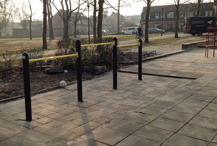 Schoolplein van basisschool De Wingerd in Nijverdal voorzien van een uitdagend klimtoestel, een schommel en een duikelrek.