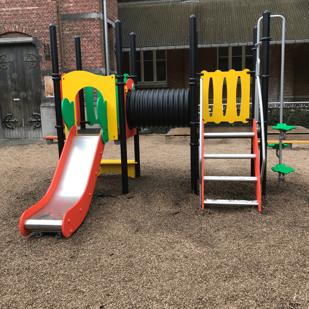 Basisschool Sint Maria is een school met diversiteit en telt meer dan 20 verschillende nationaliteiten. Deze school gaat uit van de visie dat het “gemiddelde kind” niet bestaat en zorgt daarom zoveel als mogelijk is voor onderwijs op maat. Deze grote basisschool heeft zijn lokalen midden in de stad Antwerpen op een plek die karakter en geschiedenis uitstraalt en als speelplaats een gigantisch kloostertuin van 5000m2 heeft. Als het weer het toelaat wordt er daarom buiten gegeten en heerlijk buiten gespeeld. En daar leveren wij als TnT Speeltoestellen graag een bijdrage aan.