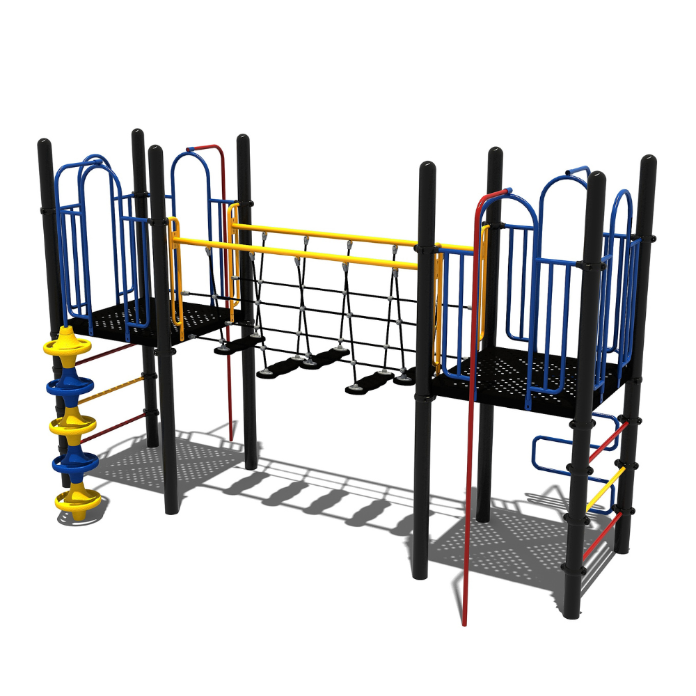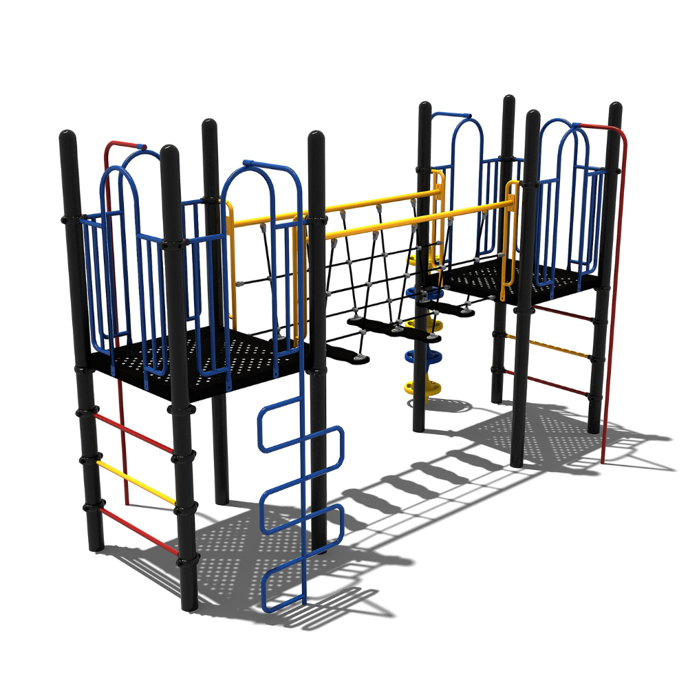 De USV heeft gekozen voor een speeltoestel met twee platformen. Deze vloeren zijn met elkaar verbonden door een balanceerbrug met stepjes. Aan de beide platformen zijn diverse speelelementen bevestigd voor de gang naar boven of beneden. Zo vind je aan het ene platform horizontale spijlen, de slangentrap en een glijstang om als de brandweer naar beneden te glijden. Aan de andere vloer komen de horizontale ladder en de glijstang nog een keer terug maar hier vind je ook een opgang met de doppen.