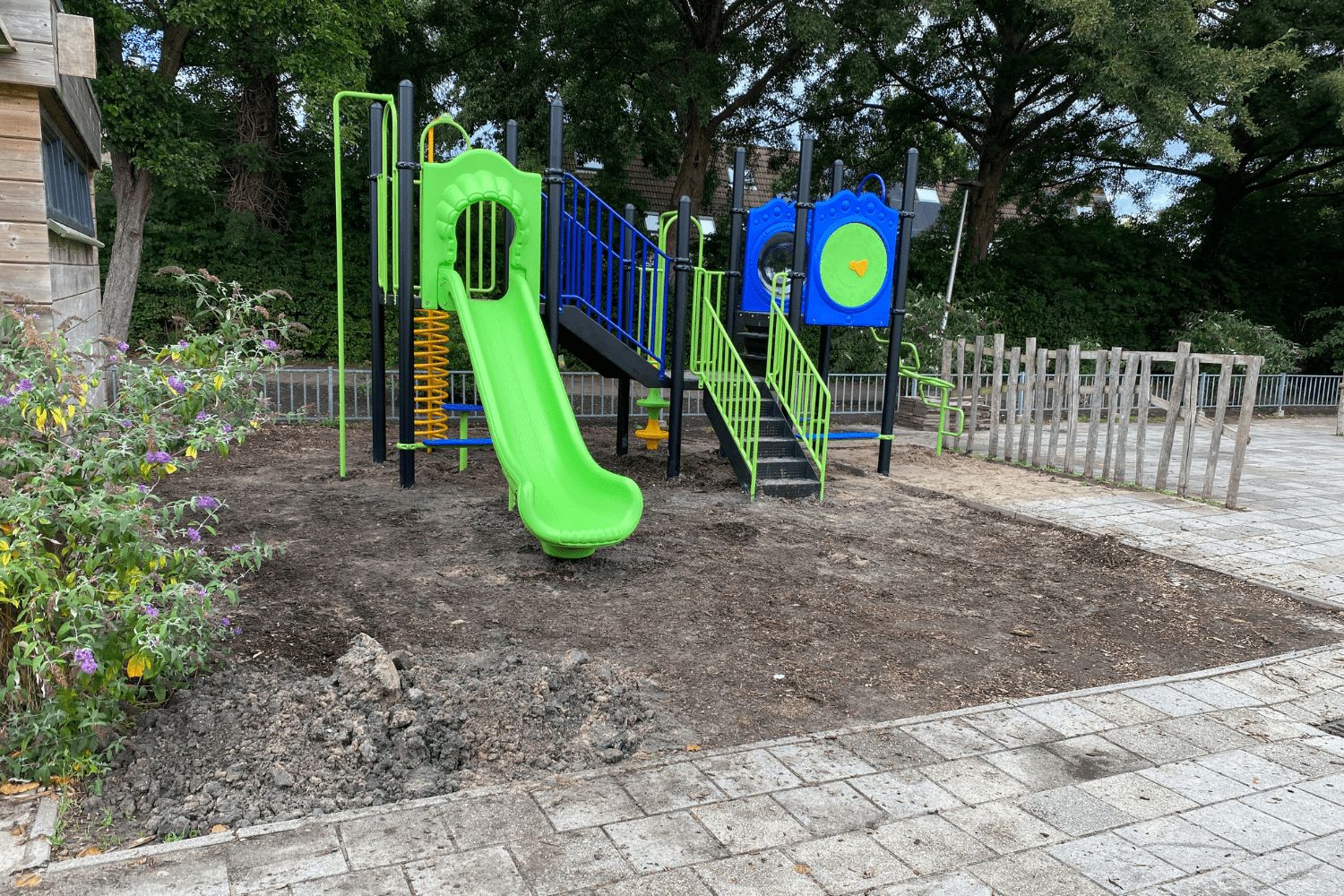 Fleurig speeltoestel op schoolplein De Achtbaan in Voorhout