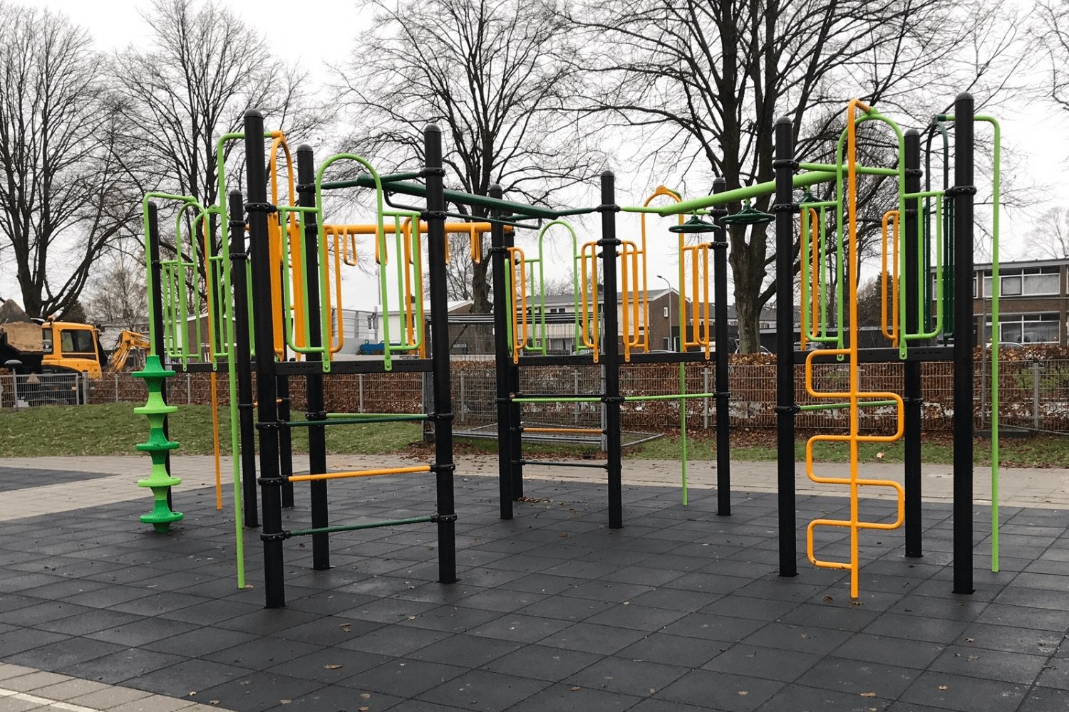 Het klimtoestel heeft een valhoogte van meer dan 150 cm en dat betekent dat hier valdemping ondergelegd moet worden. De school koos voor rubber tegels. Door deze rubber tegels op verlaagde betontegels te leggen, maak je een stevige en veilige oppervlakte. De betontegels zorgen ervoor dat de rubber tegels goed blijven liggen en niet verzakken in het zand en de rubber ondergrond dempt een eventuele val van de kinderen. Naast deze uitstekende valdemping zijn rubber tegels recyclebaar, eenvoudig schoon te maken en gaan ze jaren mee.