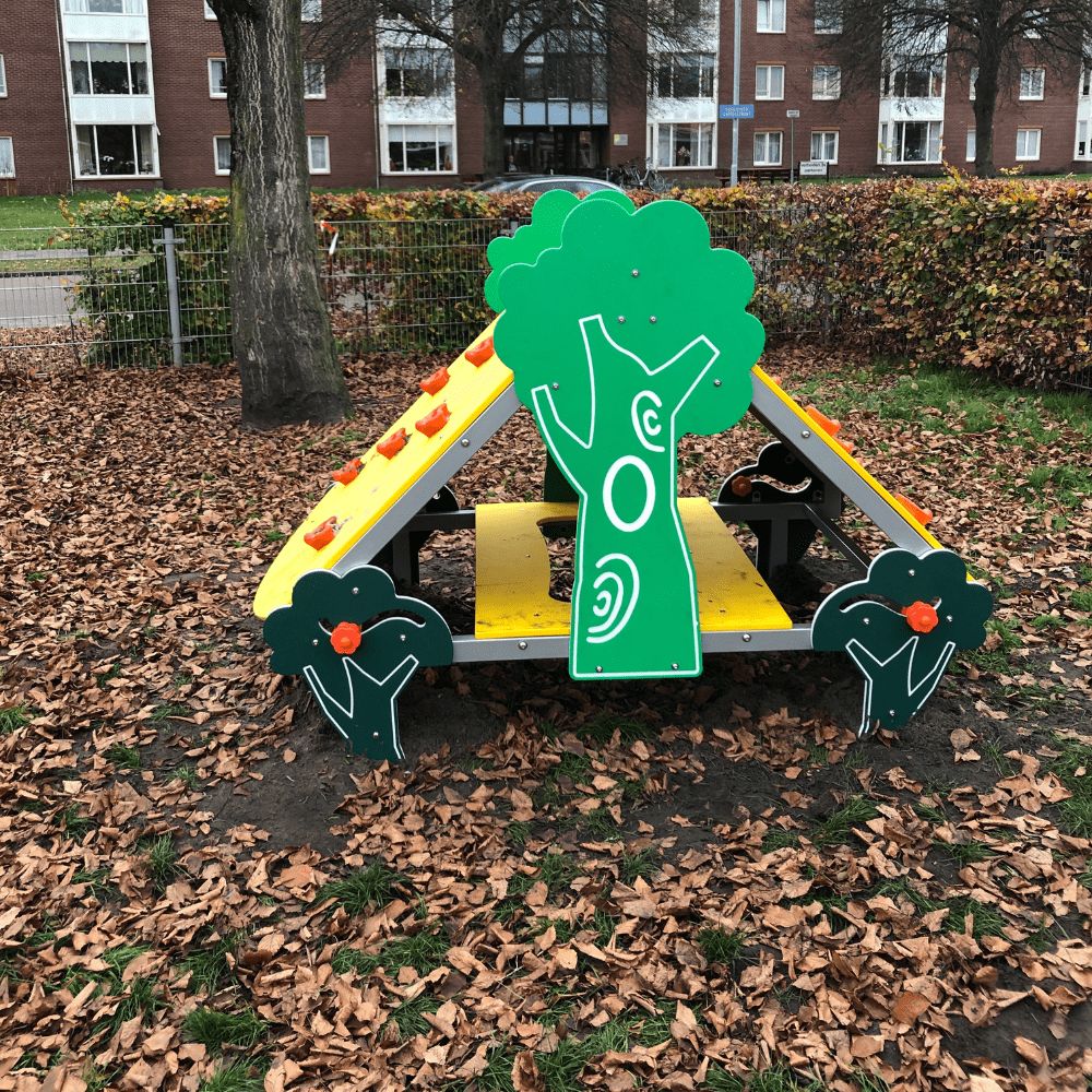 In samenwerking met onze partner Luduq mochten wij een aantal nieuwe speeltoestellen op het schoolplein plaatsen, aangevuld met drie stevige picknickbanken. Voor het grote klimtoestel ging de school eerst aan de slag in onze TnT 3D-ontwerper. In dit online programma werd een speeltoestel op maat getekend volledig volgens de wensen van de school en de kinderen. En wat dit speeltoestel nog unieker maakt is dat de kleuren zorgvuldig zijn afgestemd op het schoolgebouw en het logo van OBS De Vlinder. De vrolijke groen- en geeltinten geven het toestel een frisse en herkenbare uitstraling die goed aansluit bij de identiteit van de school.