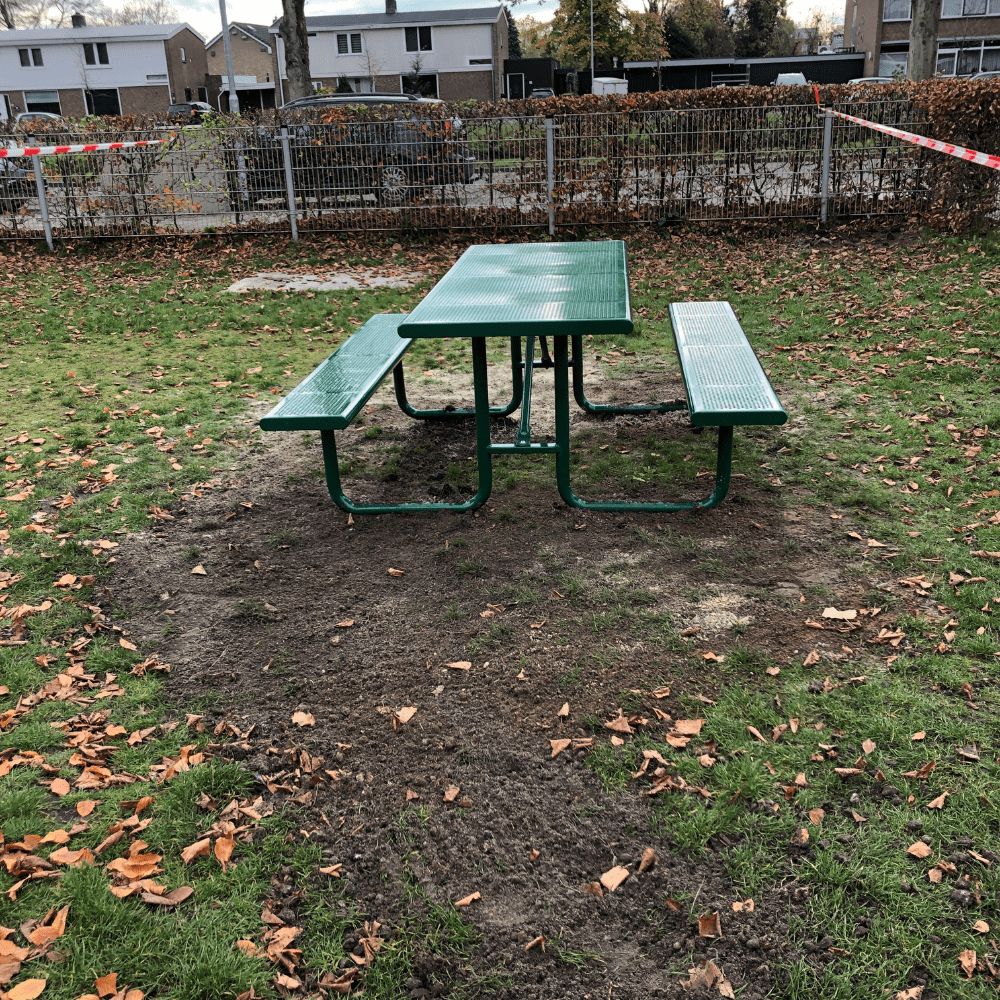 Het schoolplein is verder uitgebreid met extra zitplaatsen in de vorm van metalen picknickbanken. Op drie plekken is een picknickbank neergezet voor een fijne zitplek waar kinderen bij goed weer ook makkelijk aanschuiven voor het nuttigen van hun boterhammen en drinken. Het voordeel is dat de tafel erg handig is voor meegebrachte etenswaren en je er ook nog eens uitstekend aan kunt tekenen of knutselen. Deze robuuste metalen picknickbanken zijn er in verschillende kleuren maar OBS De Vlinder koos voor de donkergroene uitvoering.