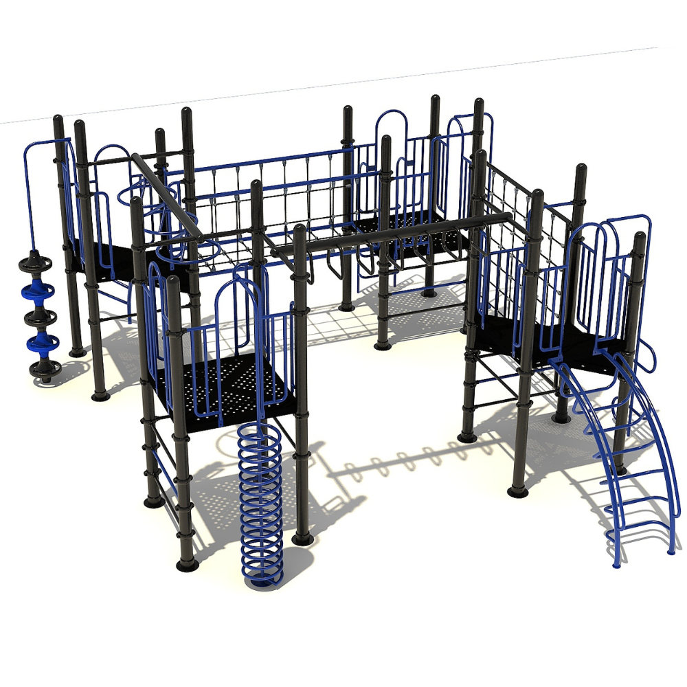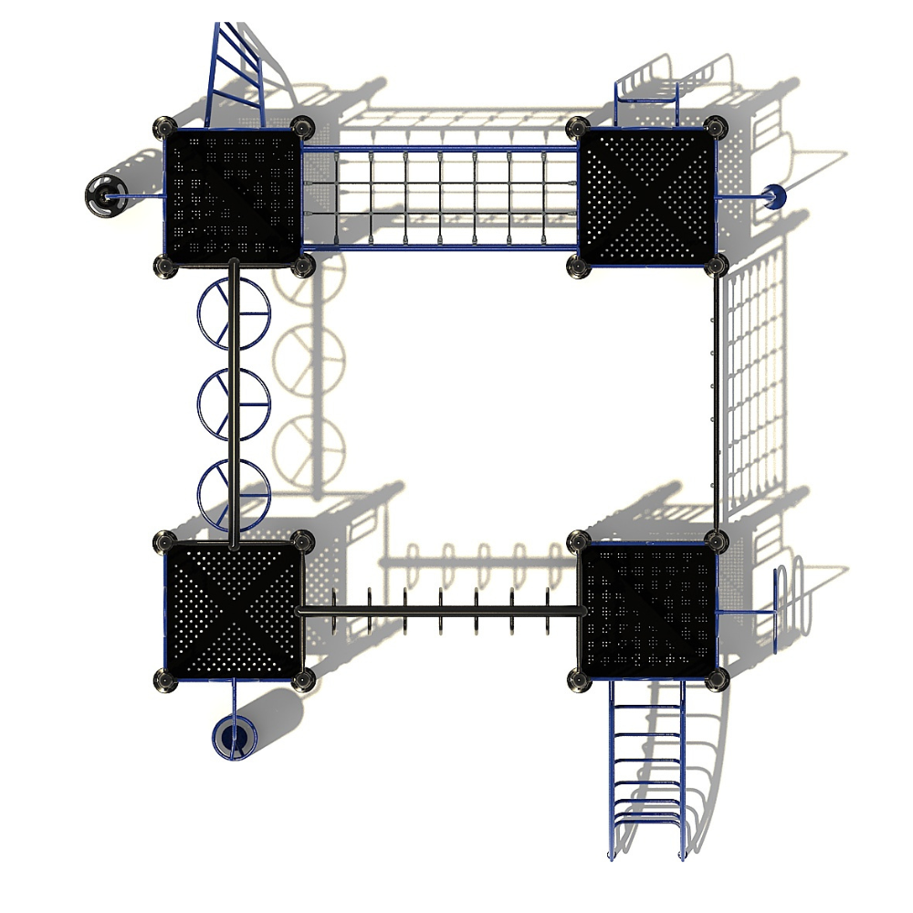 De Canadaschool begon al creatief met de basis van het speeltoestel, namelijk met de vloeren. Het grote speeltoestel heeft vier platformen, die allemaal met elkaar verbonden zijn door verschillende speelelementen. Twee platformen hebben vierkante vloeren maar voor de twee andere platformen is gekozen om twee driehoekige vloeren met een klein hoogteverschil te laten plaatsen. Vanuit het bovenaanzicht lijken het nu vierkante vloeren maar dat zijn ze niet. Aan deze platformen zijn verschillende opgangen geplaatst om naar boven of beneden te klimmen of te glijden. Zo zijn er maar liefst acht verschillende mogelijkheden zoals een gebogen klimrek, een doppenopgang, een ladder, een slangentrap, de spiraalwikkel, horizontale spijlenopgang en een heuse glijstang om als een brandweerman naar beneden te glijden. De platformen zijn met elkaar verbonden door een verticaal klimnet, een touwenbrug en door twee hangelementen, de ringladder en de wielladder. Voor deze twee laatste heb je wel spierkracht en behendigheid nodig om naar de overkant te komen. Maar in principe kun je het hele speeltoestel rond zonder dat de voetjes de vloer raken.