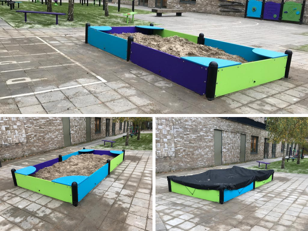 Om het schoolplein te completeren is op de tegelvloer een ruime zandbak met vier handige zitjes neergezet. Want zand mag, net als een duikelrek, ook niet ontbreken, vooral niet voor de allerkleinsten. Bij deze zandbak is ook een net geleverd om het zand te beschermen tegen viezigheid en kattenuitwerpselen. En net als de zandbak passen de kleuren van de drie spelpanelen weer heel mooi bij de rest van de speeltoestellen. Deze speelpanelen vormen leerzame elementen op een schoolplein. Ze leren kinderen basisbeginselen, zoals hier het klok kijken, tellen met het slangenspel of gewoon een leuk spelletje spelen. Om het geheel helemaal af te maken, is nog gekozen voor een ballenvanger om gooi- en vangvaardigheden te oefenen of een leuk ballenspel in teamverband te spelen.