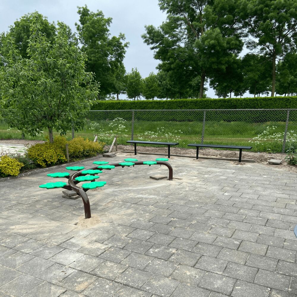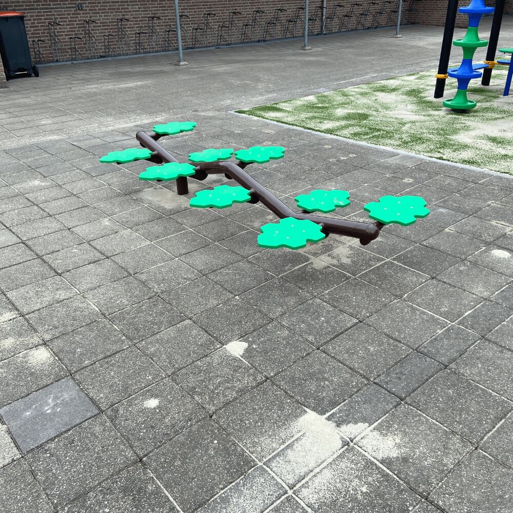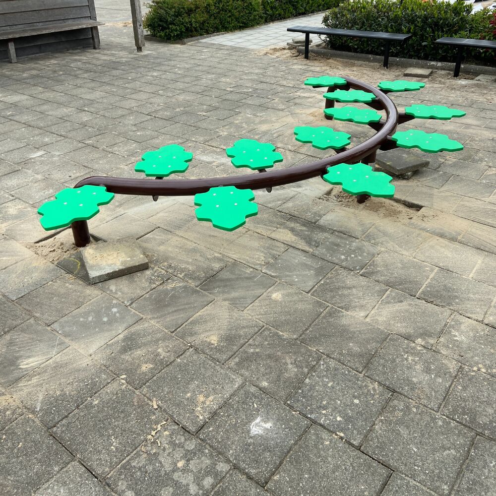 Balanceren mocht ook niet op de speelplaats ontbreken. De keuze hiervoor viel op de balanceerbalken met de bladeren. Logisch, deze balanceertoestellen mogen op de tegels, ze zijn mooi compact van formaat en het zijn betaalbare speeltoestellen. En dan vergeten we nog te zeggen dat ze ook een meerwaarde zijn, zowel in speelwaarde alsook als bijdrage voor de ontwikkeling van balans en het evenwichtsgevoel van de kinderen. Er zijn twee verschillende bladerbalken geleverd, de halfronde uitvoering is nieuw en hebben we voor de eerste keer geplaatst, voor de andere geldt exemplaar nummer 70. Dit betekent dat dit balanceertoestel al op 69 andere speelplekken is neergezet.