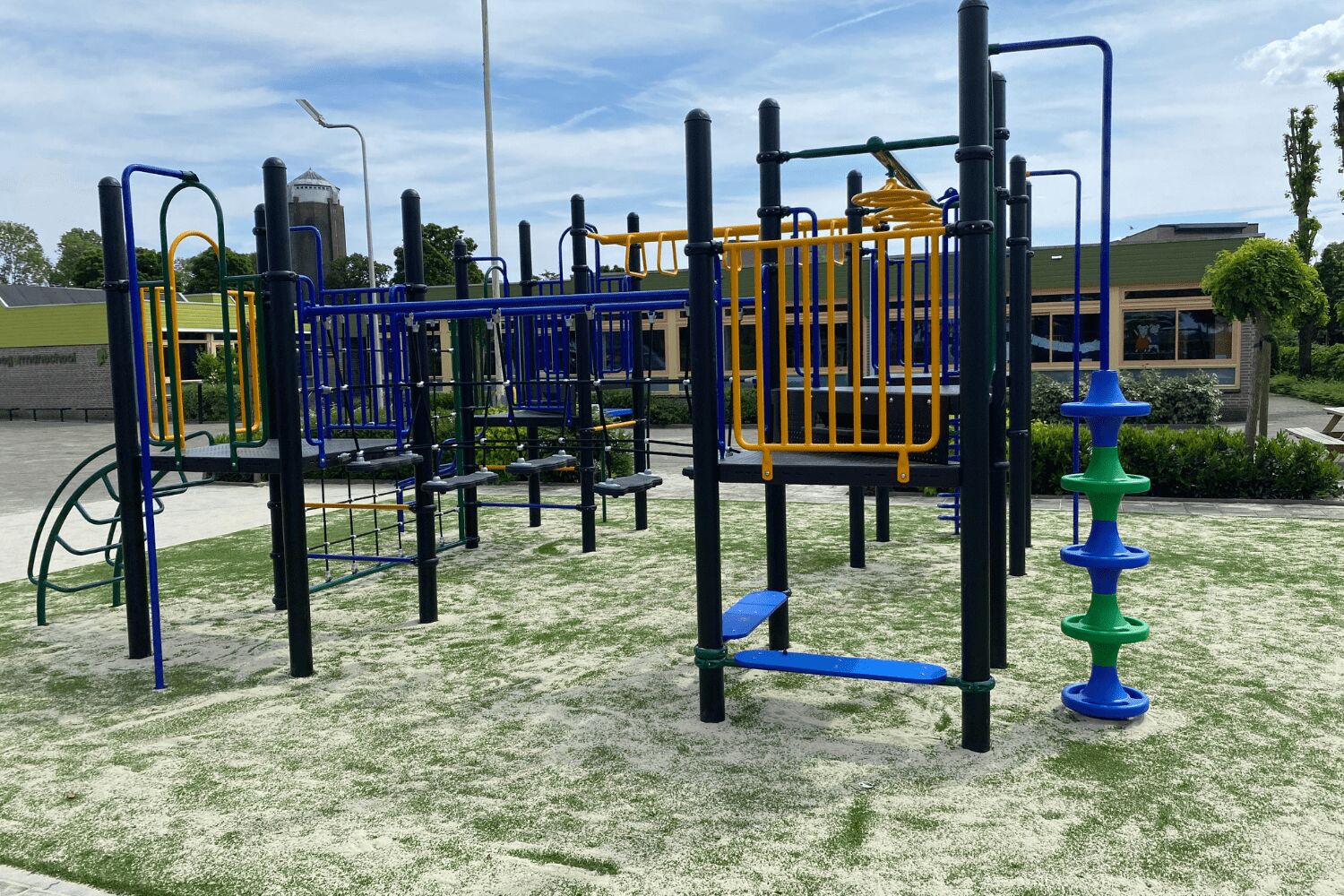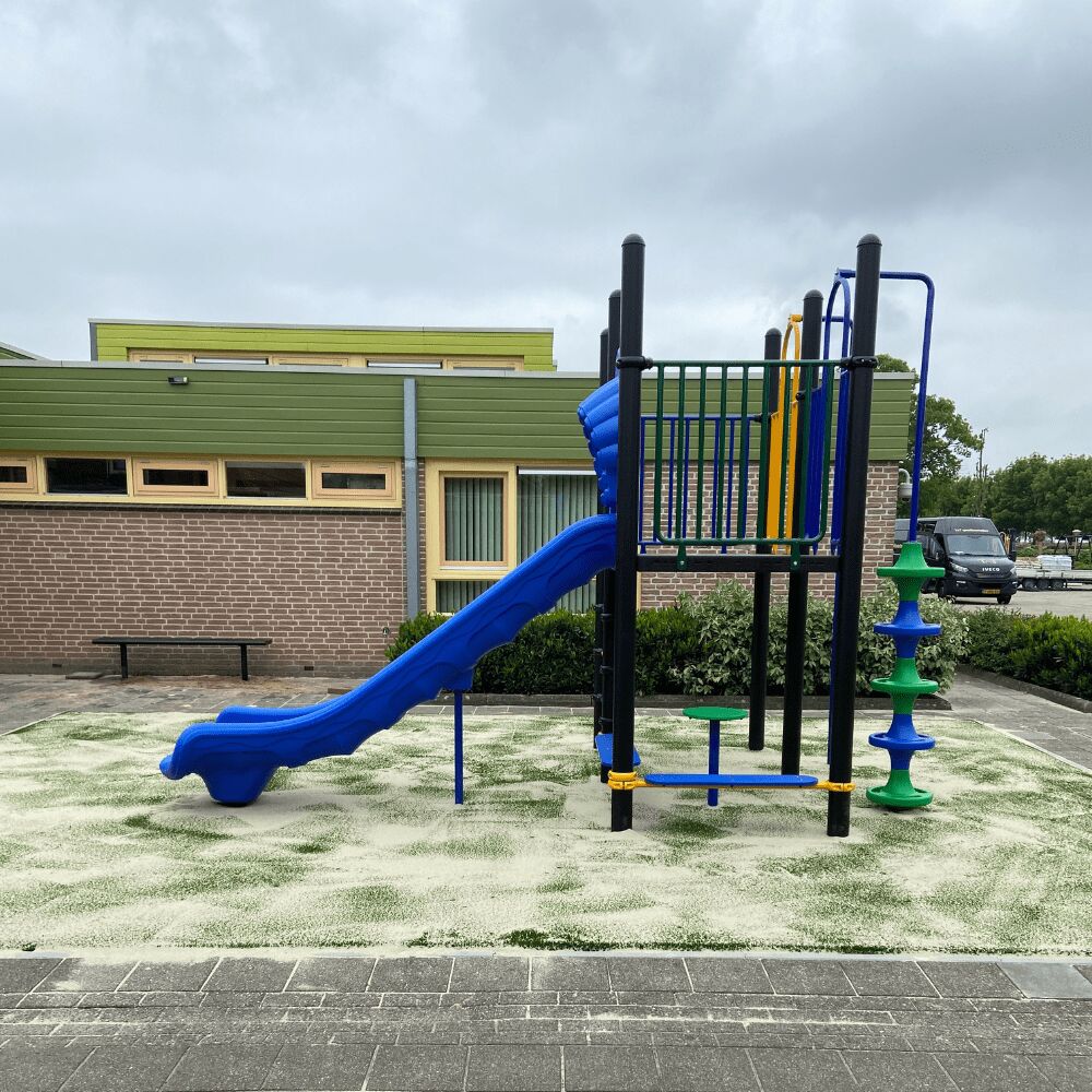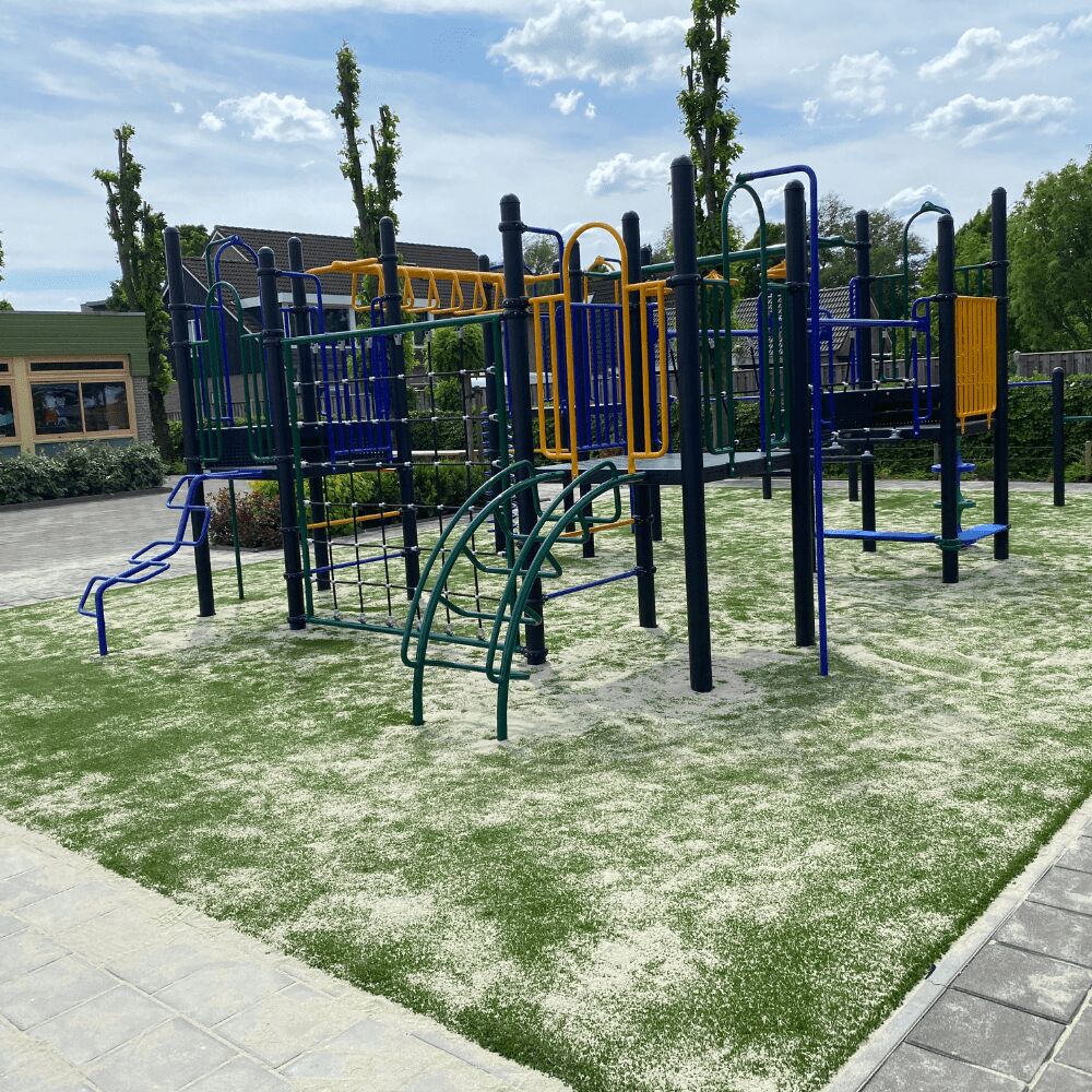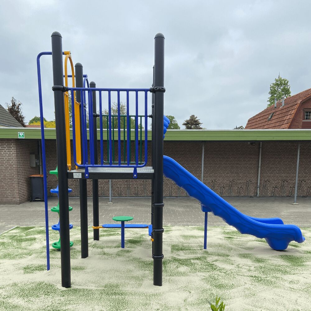 Naast de verbindende speelelementen zijn aan ieder platform extra klimelementen geplaatst. Op deze manier zijn de vloeren allemaal goed benut en krijgt het speeltoestel een optimale speelwaarde. Aan ieder platform zit een glijstang, daarnaast vind je een gebogen ladder, een slangenopgang, de spiraal en de opgang met de doppen. Ook de horizontale spijlen tussen de staanders van de vloeren kun je op en af. Onder één van de platformen vind je nog een zitmogelijkheid. De kleuren van het speeltoestel zijn gekozen door de school. En deze blikvanger steekt mooi af tegen het nieuwe kunstgras dat is gelegd door onze partner Variograss.