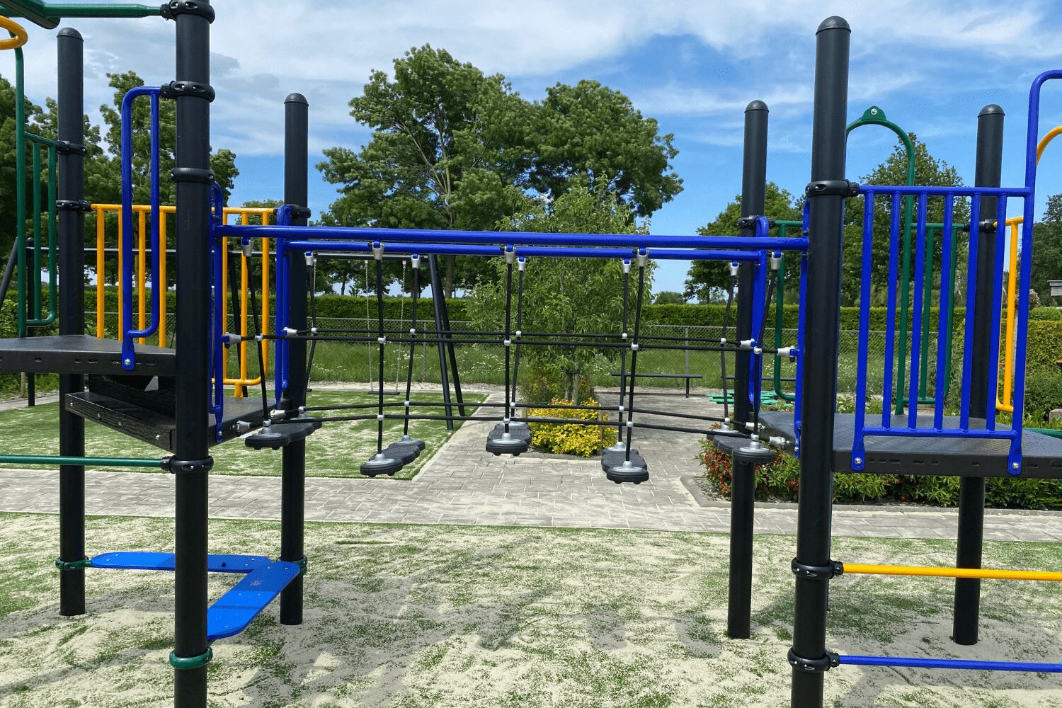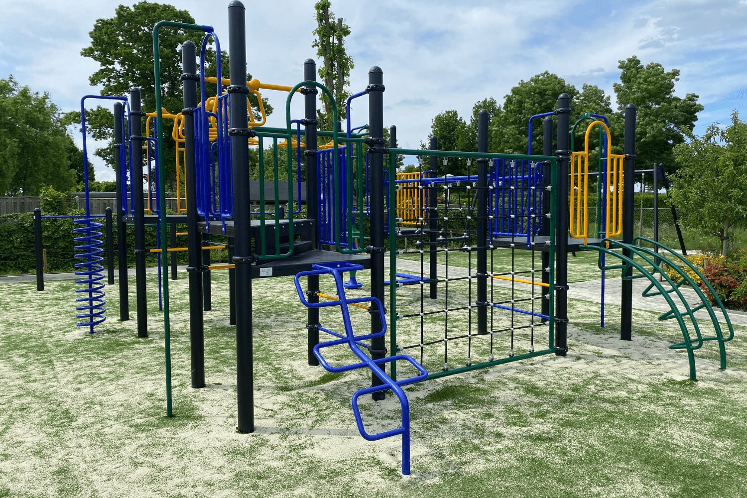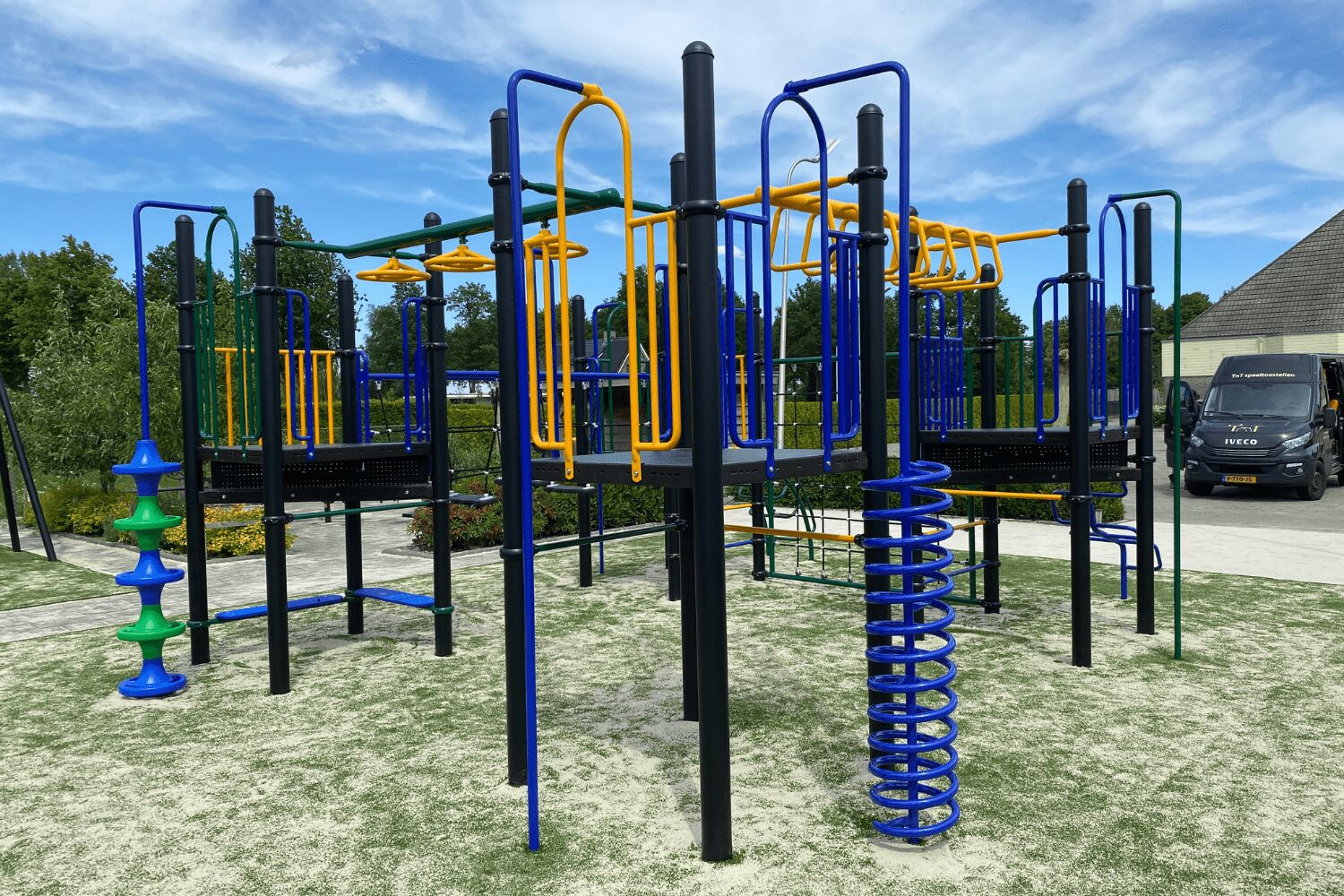 Naast de verbindende speelelementen zijn aan ieder platform extra klimelementen geplaatst. Op deze manier zijn de vloeren allemaal goed benut en krijgt het speeltoestel een optimale speelwaarde. Aan ieder platform zit een glijstang, daarnaast vind je een gebogen ladder, een slangenopgang, de spiraal en de opgang met de doppen. Ook de horizontale spijlen tussen de staanders van de vloeren kun je op en af. Onder één van de platformen vind je nog een zitmogelijkheid. De kleuren van het speeltoestel zijn gekozen door de school. En deze blikvanger steekt mooi af tegen het nieuwe kunstgras dat is gelegd door onze partner Variograss.