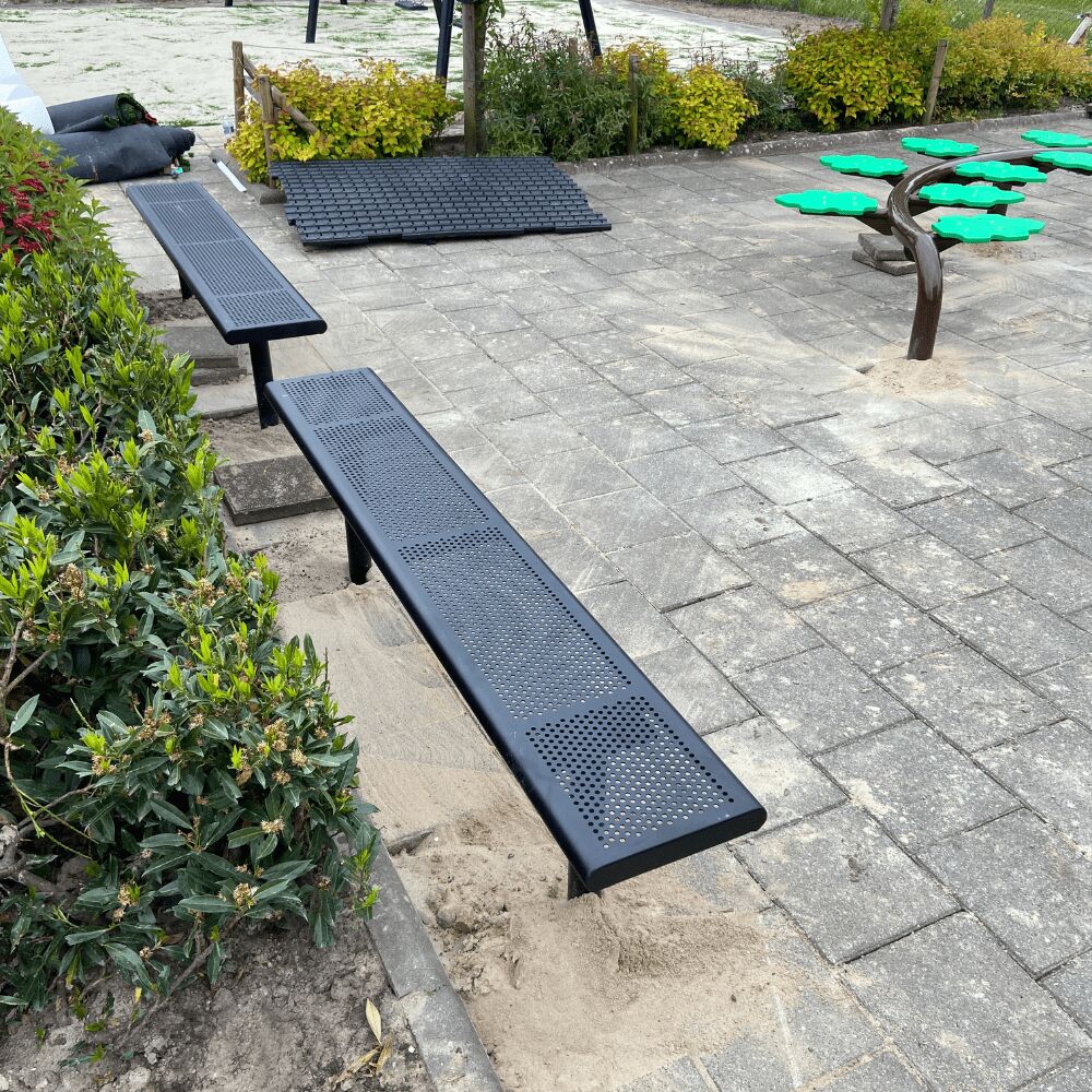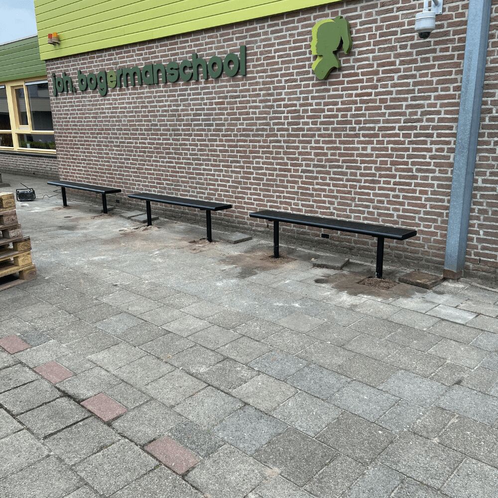 Het schoolplein is helemaal af door de vele zitplekken in de vorm van onze metalen bankjes zonder rugleuning. Deze bankjes zijn in talloze kleuren te verkrijgen, de school koos voor de kleur zwart.