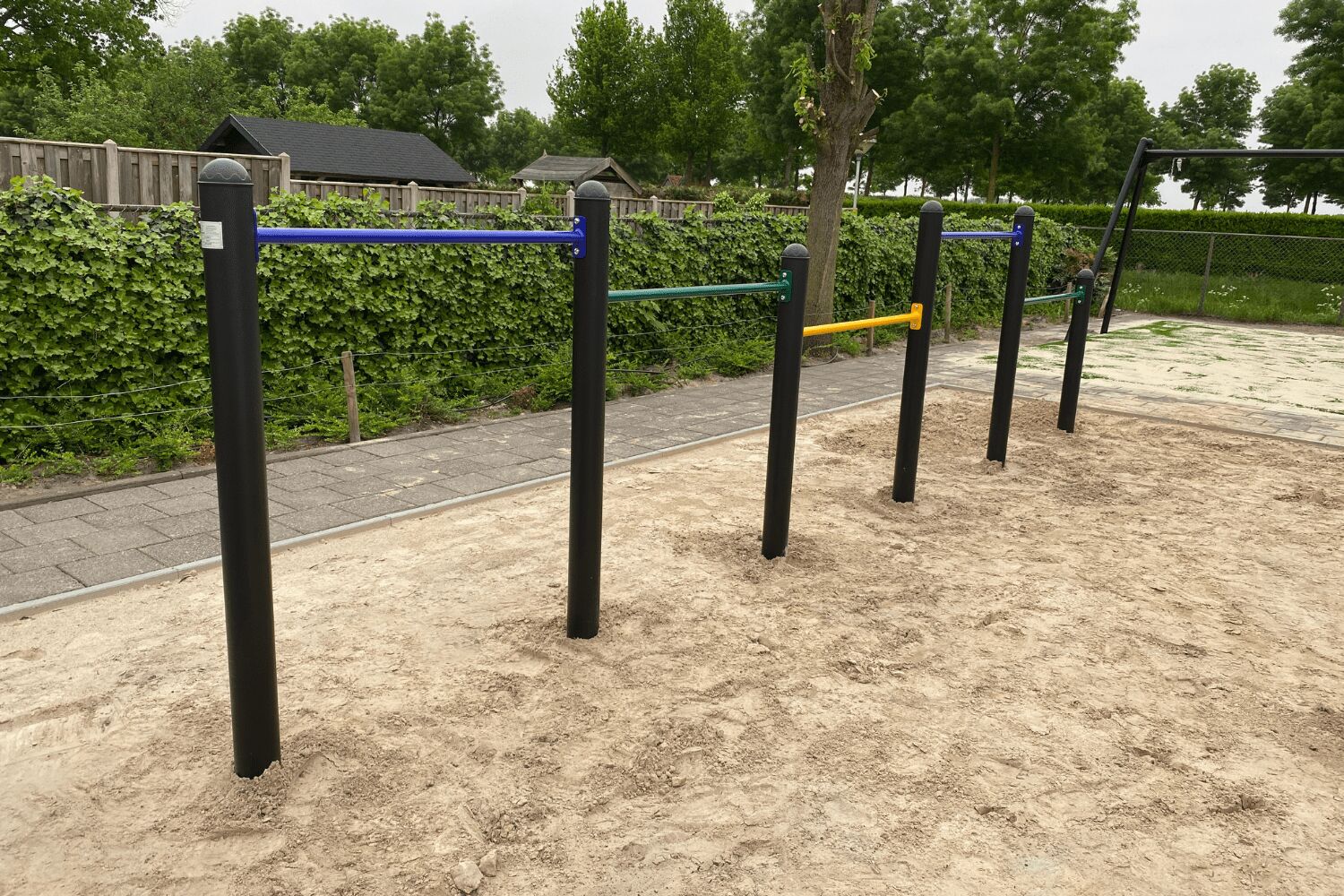 Ook het duikelrek is nieuw. En het bestaat uit maar liefst 5 duikelstangen. Dat is nog eens wat anders dan het standaard 3-delige duikelrek. Ook hier is de kleurstelling van de andere speeltoestellen weer doorgevoerd en vinden we de kleuren geel, groen en blauw terug. Hoe leuk is het om hier met vijf tegelijk je duikelkunsten op te oefenen?