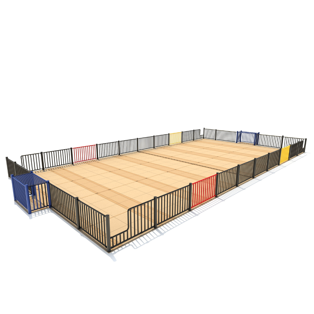 Maar liefst 17 x 8 meter meet deze voetbalkooi waarvan TnT voor de omheining heeft gezorgd. Deze omheining bestaat uit strak metalen hekwerk in het zwart. Hetzelfde hekwerk is ook gebruikt als dak boven de twee goaltjes die helemaal in het blauw zijn uitgevoerd. De voetbalkooi heeft aan de lange zijden twee lage instappen waardoor de kinderen makkelijk in- en uit de voetbalkooi kunnen stappen om bijvoorbeeld snel een bal te halen. Voor nog een extra kleuraccent zijn aan beide zijden een geel en rood hek toegevoegd. De kleuren zijn helemaal afgestemd op de kleuren van het kunstgras dat KSP heeft gebruikt. En wat hebben ze er een kunstwerk van gemaakt. Maar dan wel een kunstwerk met een functie. Want door de indeling van de voetbalkooi in verschillende vakken gekleurd kunstgras kunnen hierin verschillende spellen en sporten gespeeld worden. Het was weer prettig samenwerken met KSP en de voetbalkooi is een kleurrijke blikvanger op het schoolplein geworden.
